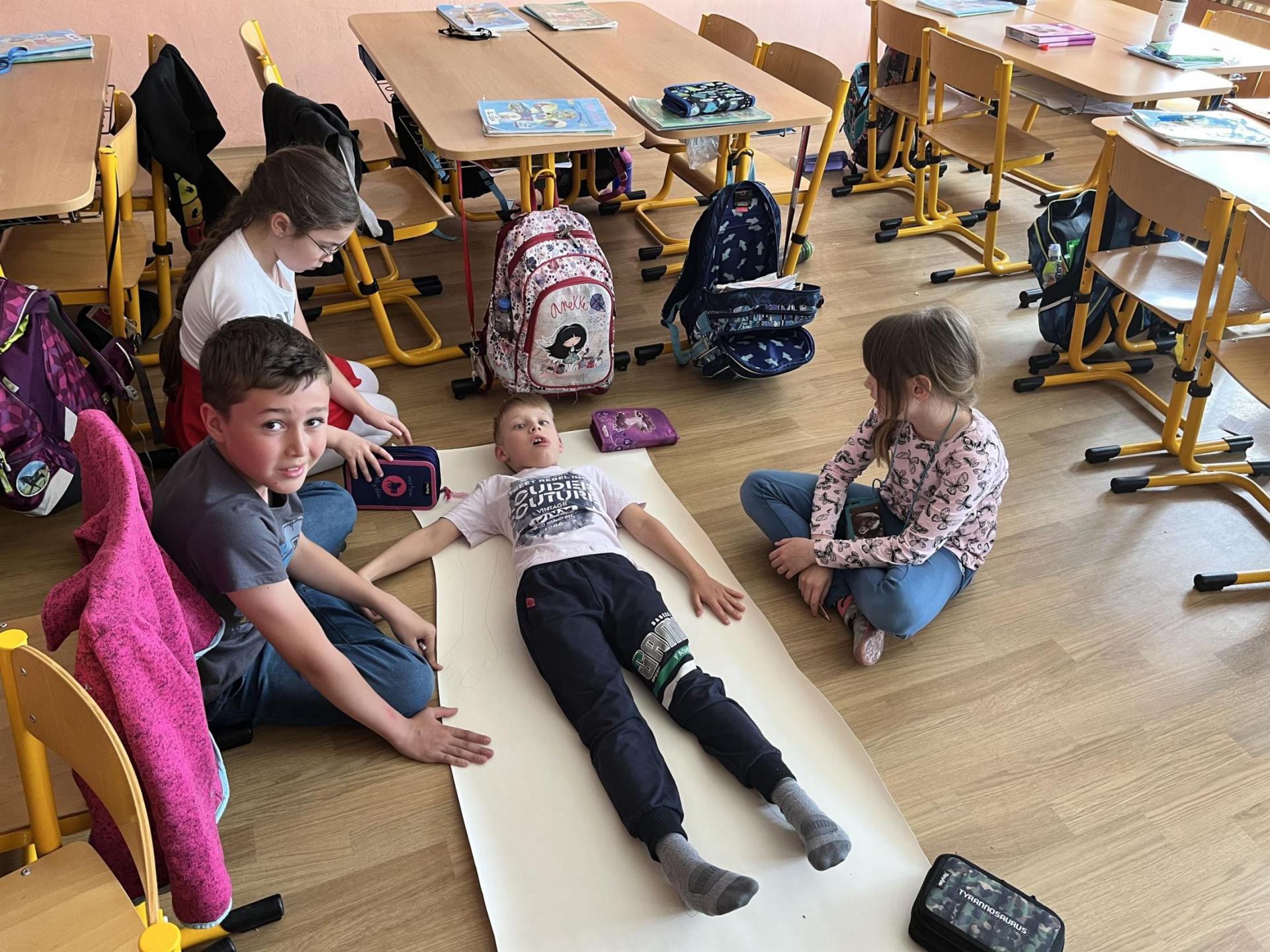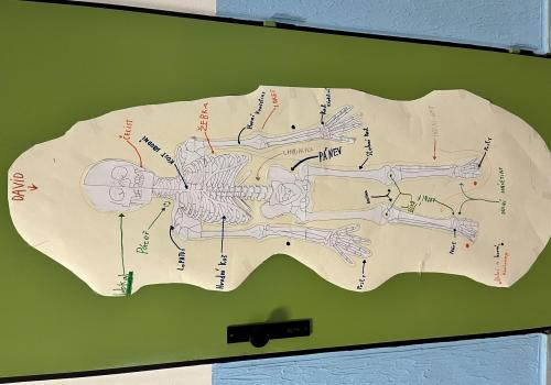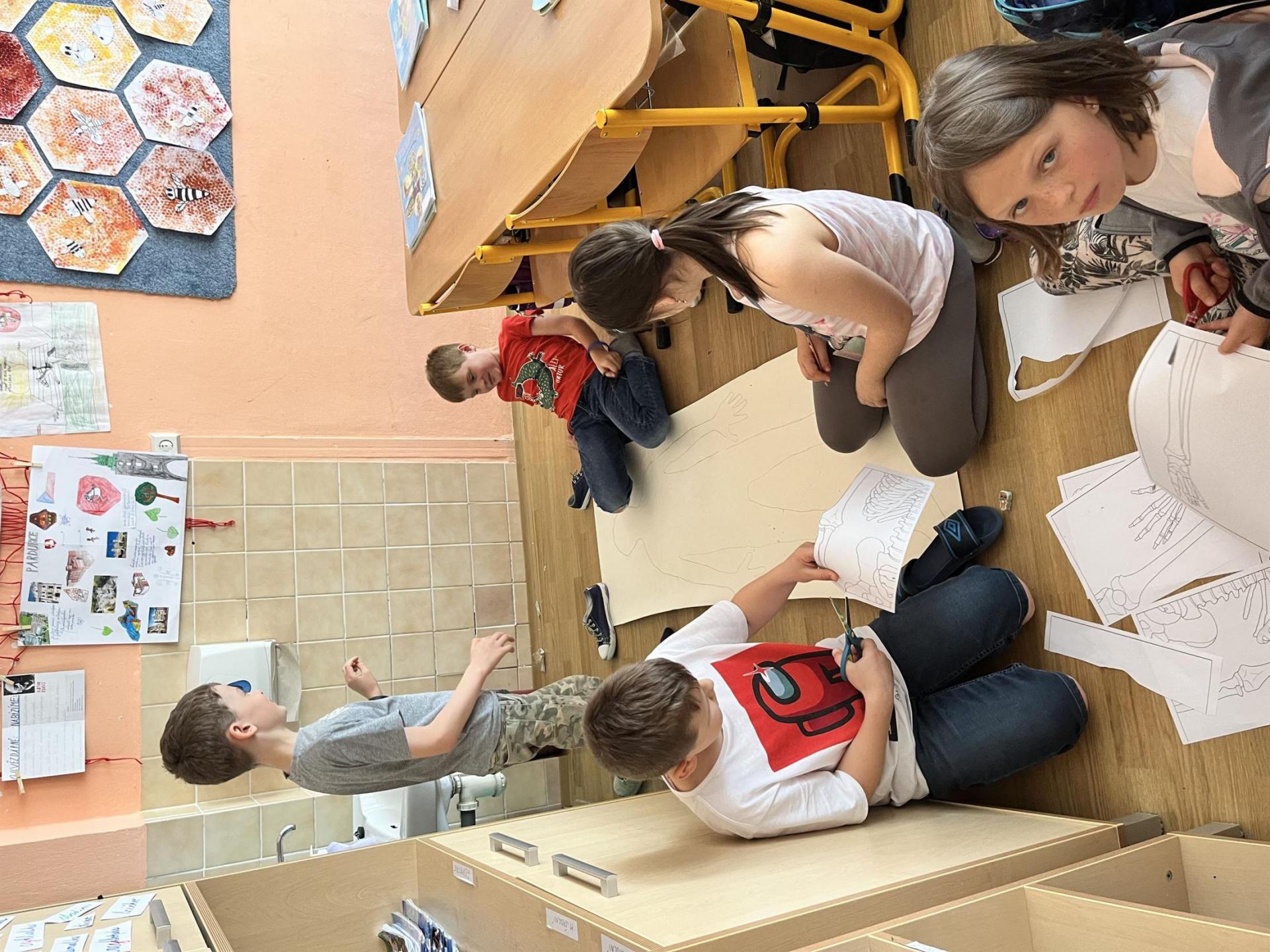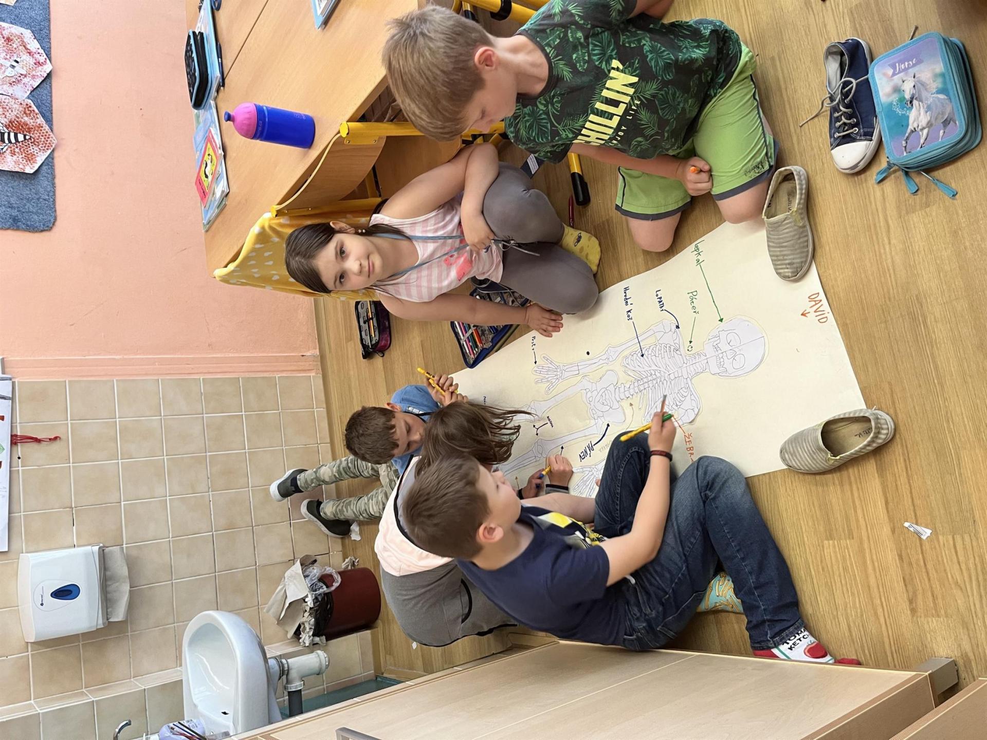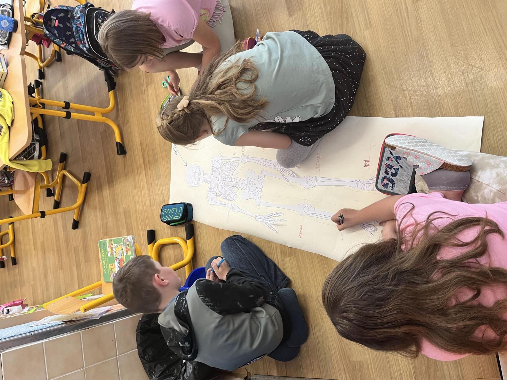 V rámci SKN jsme si vytvářeli ve skupinkách vlastní kostlivce. Obkreslili jsme lidské tělo, sestavili kostru a popisovali části těla.
