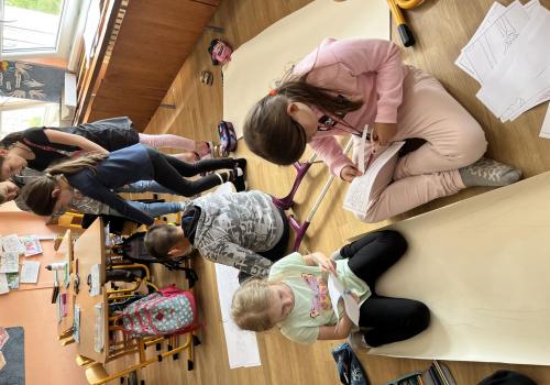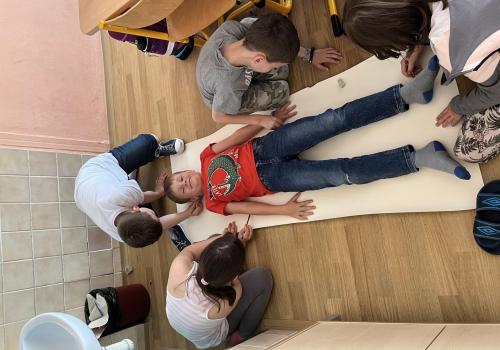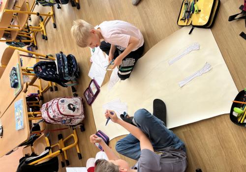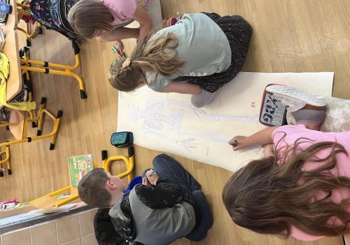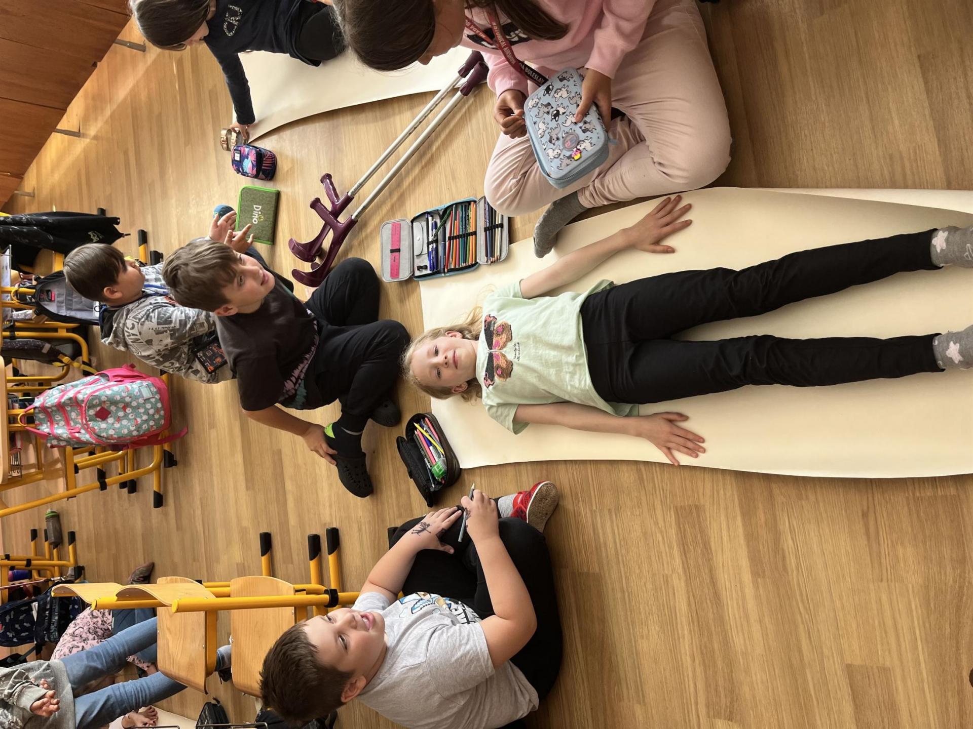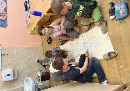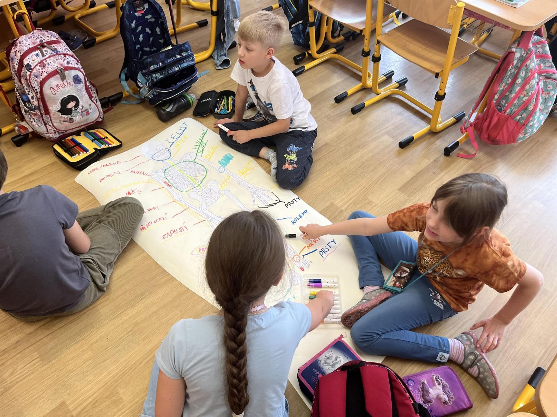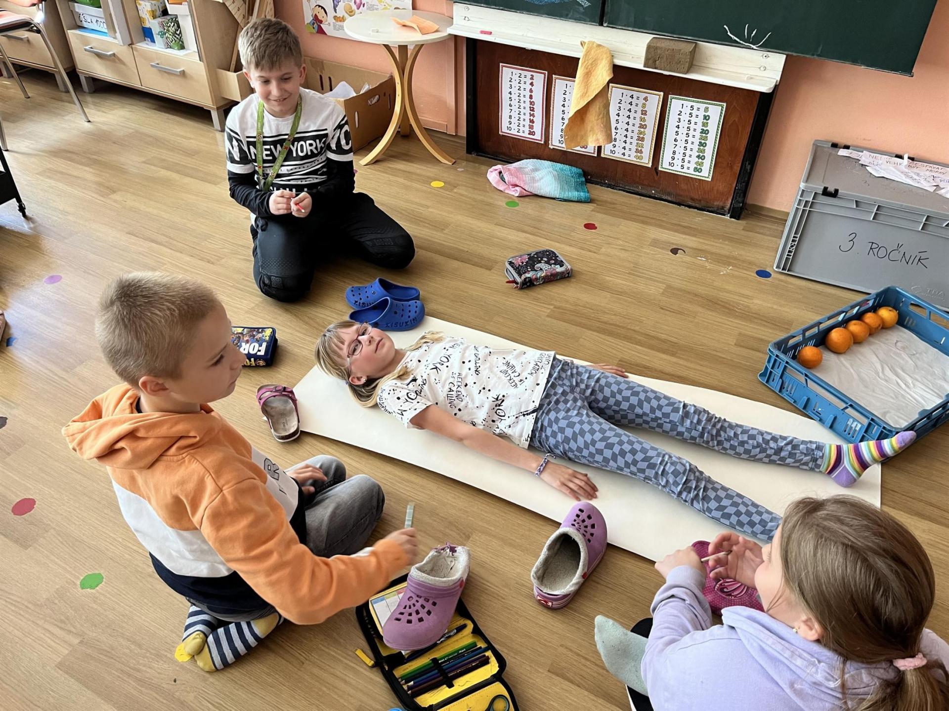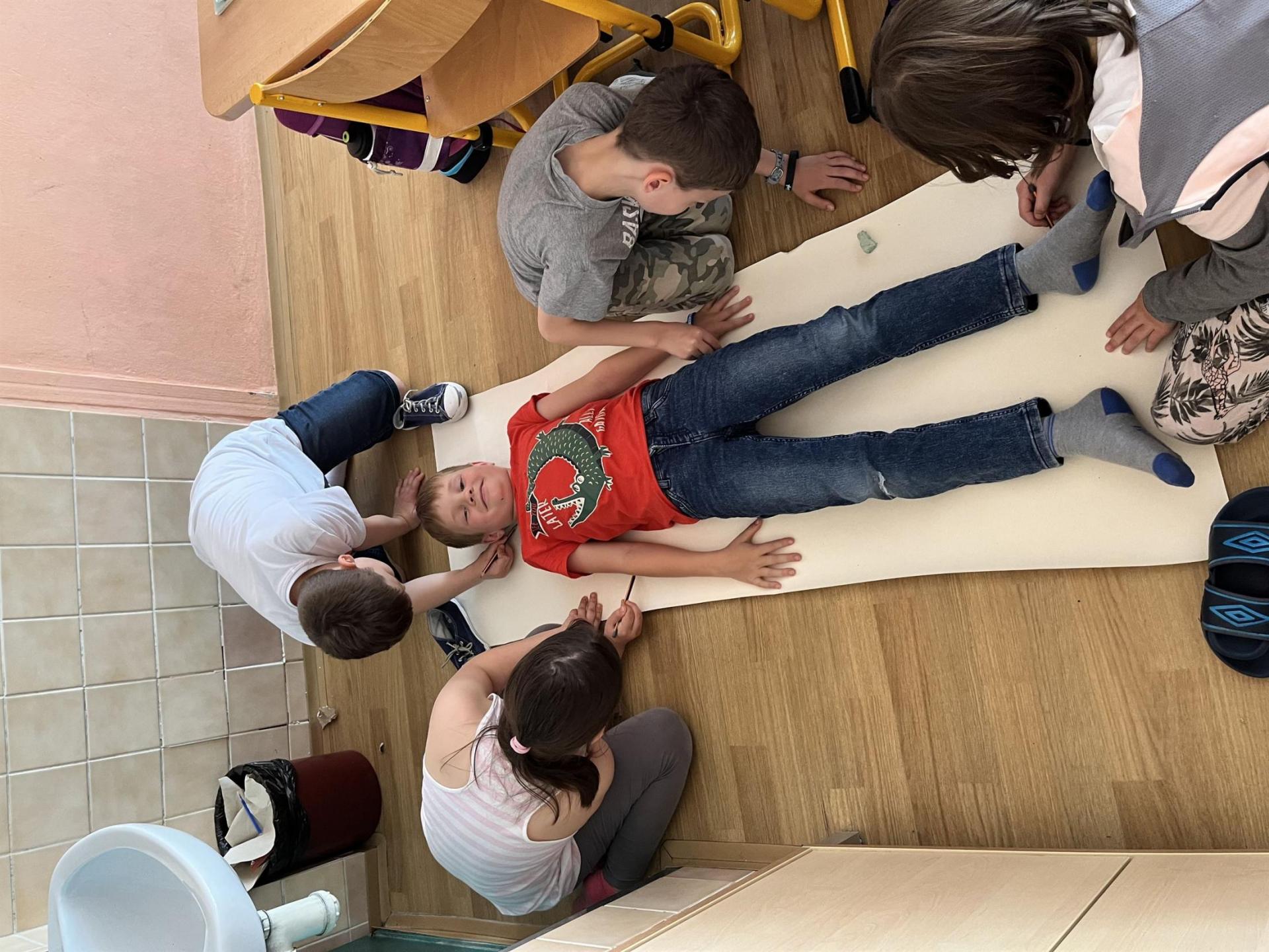 V rámci SKN jsme si vytvářeli ve skupinkách vlastní kostlivce. Obkreslili jsme lidské tělo, sestavili kostru a popisovali části těla.
