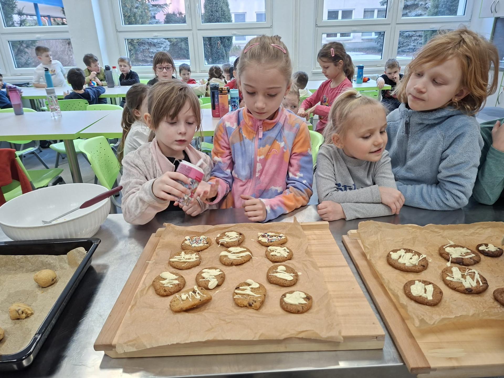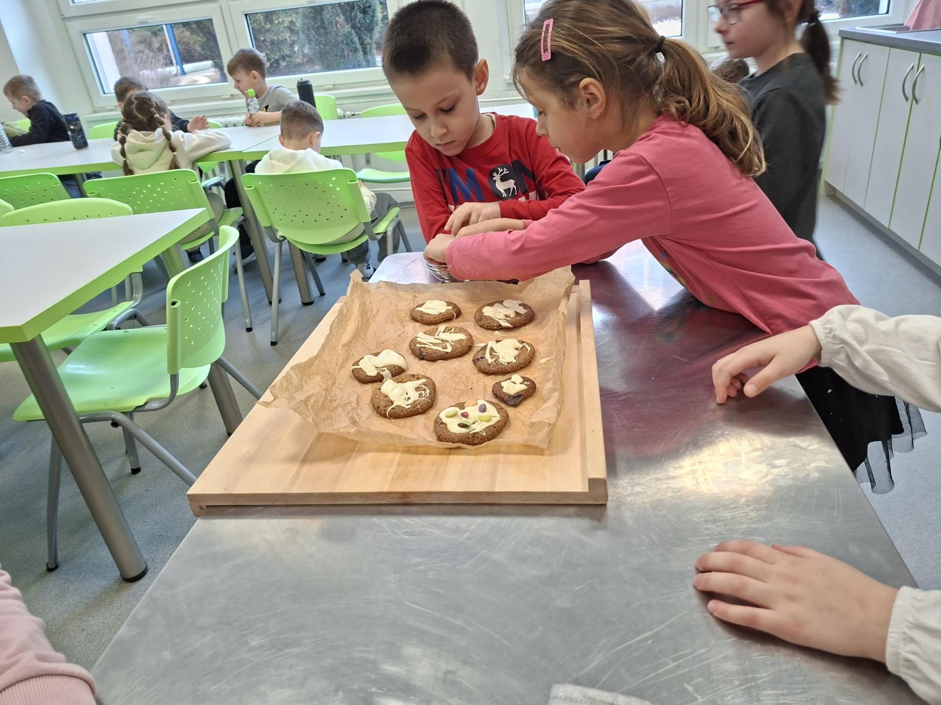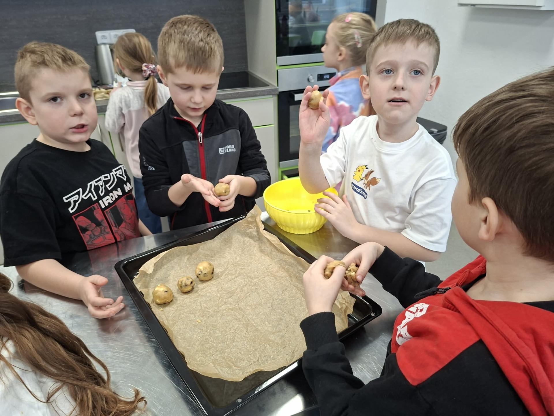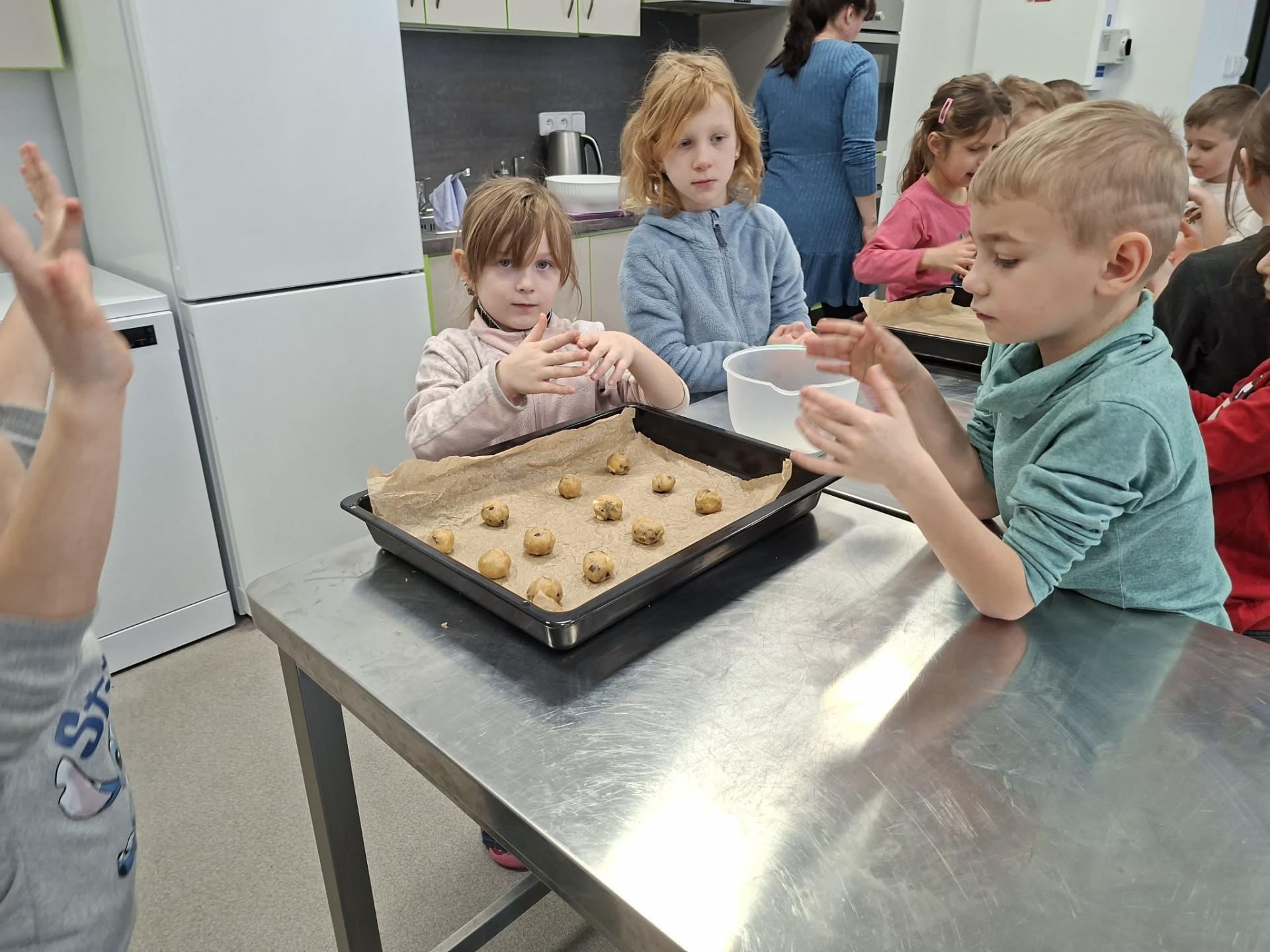 Dnes jsme s dětmi zavítali do školní kuchyňky, kde jsme si společně upekli lahodné cookies. Děti dostaly připravené těsto, do kterého si mohly přidat ingredience podle chuti – na výběr byla bílá a mléčná čokoláda nebo oříšky. Z těsta jsme tvořili kuličky, které jsme pokládali na plech, a pak už jsme netrpělivě čekali, jak budou sušenky po upečení vypadat.