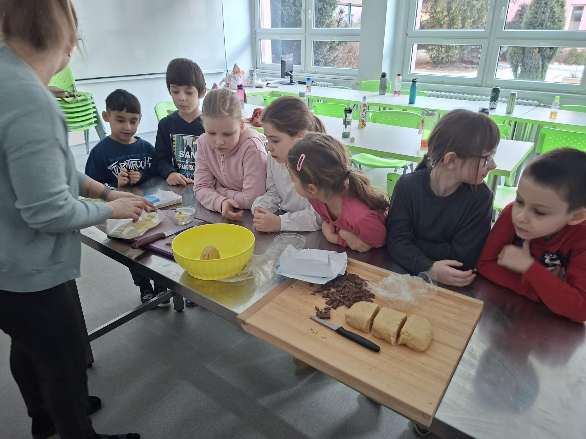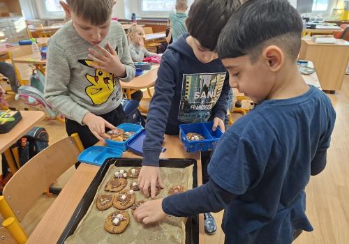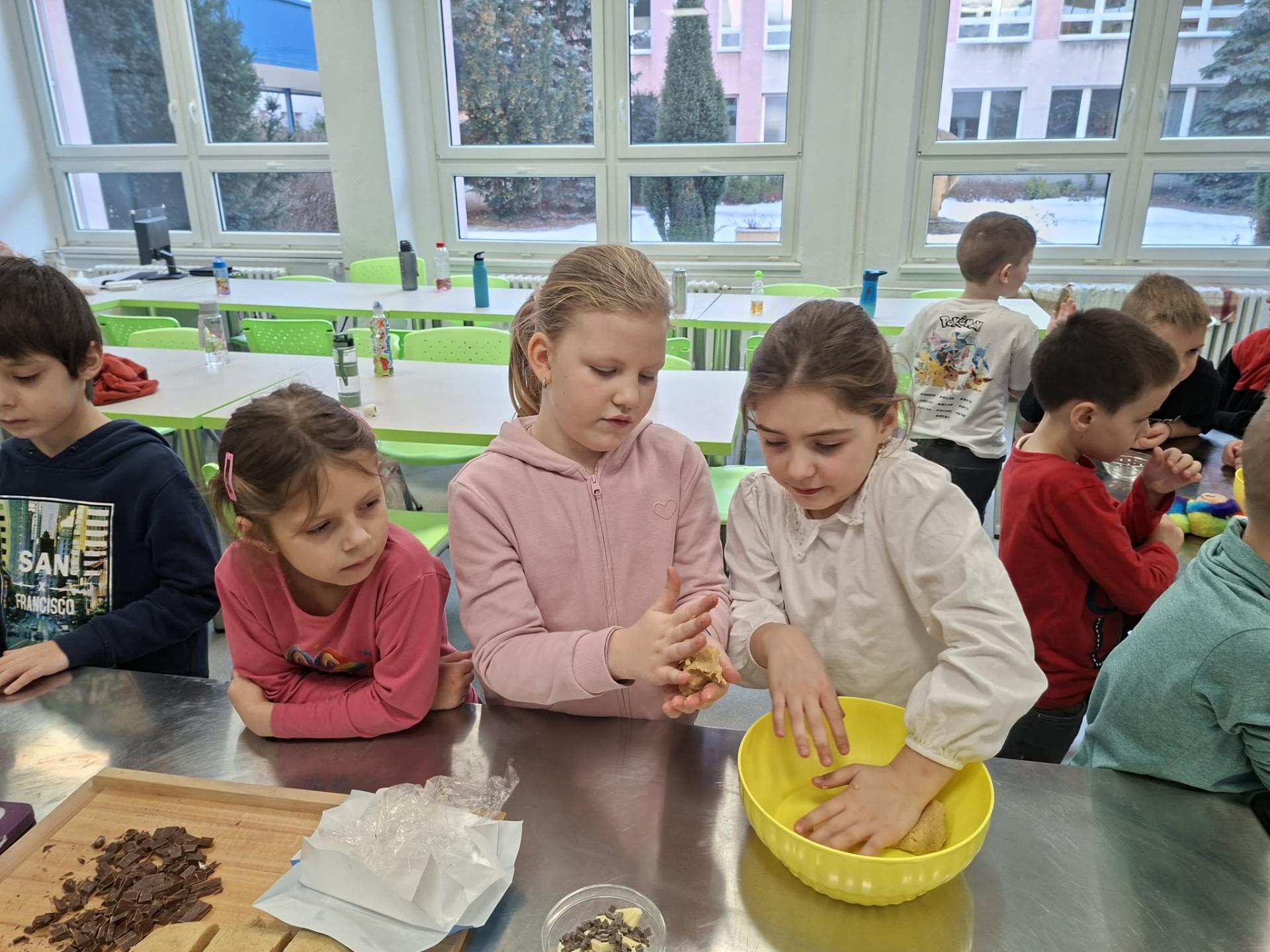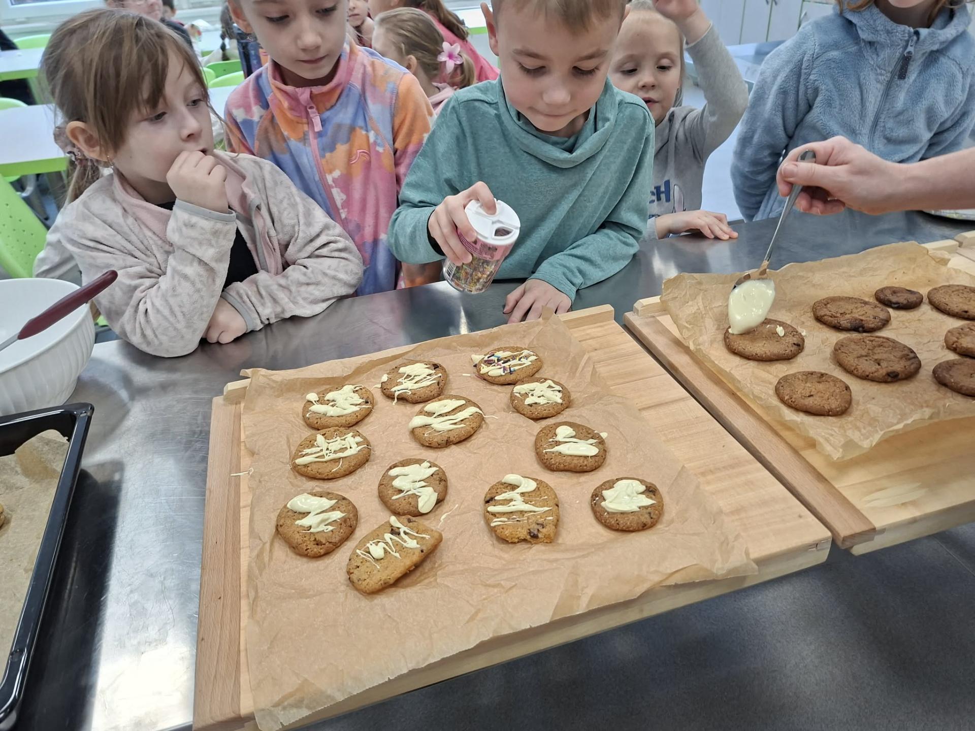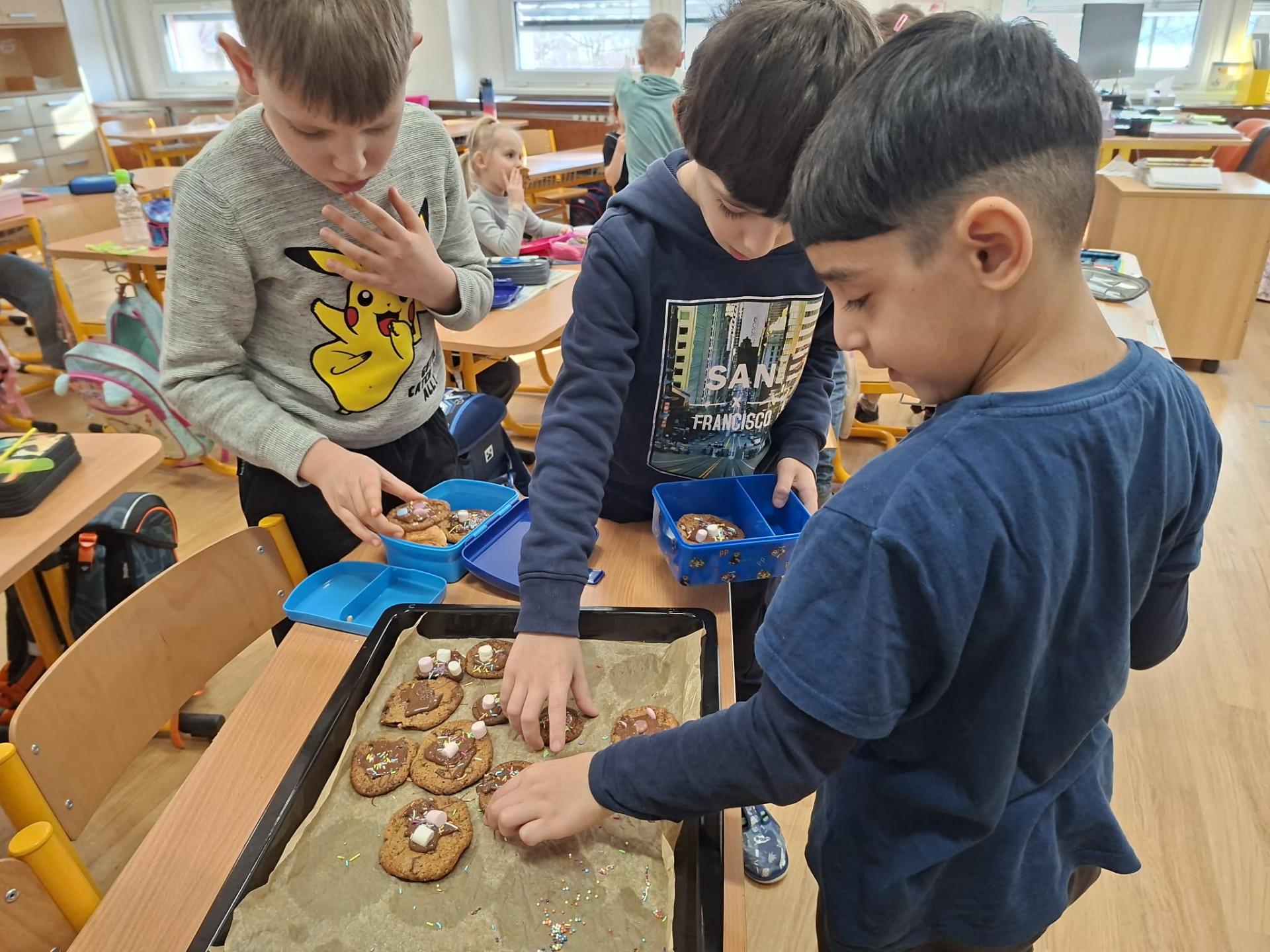 Dnes jsme s dětmi zavítali do školní kuchyňky, kde jsme si společně upekli lahodné cookies. Děti dostaly připravené těsto, do kterého si mohly přidat ingredience podle chuti – na výběr byla bílá a mléčná čokoláda nebo oříšky. Z těsta jsme tvořili kuličky, které jsme pokládali na plech, a pak už jsme netrpělivě čekali, jak budou sušenky po upečení vypadat.