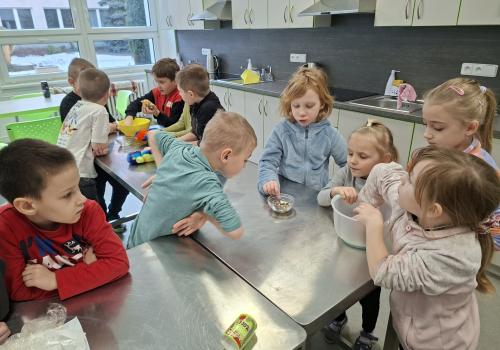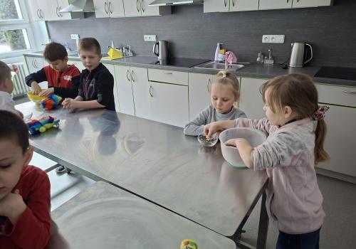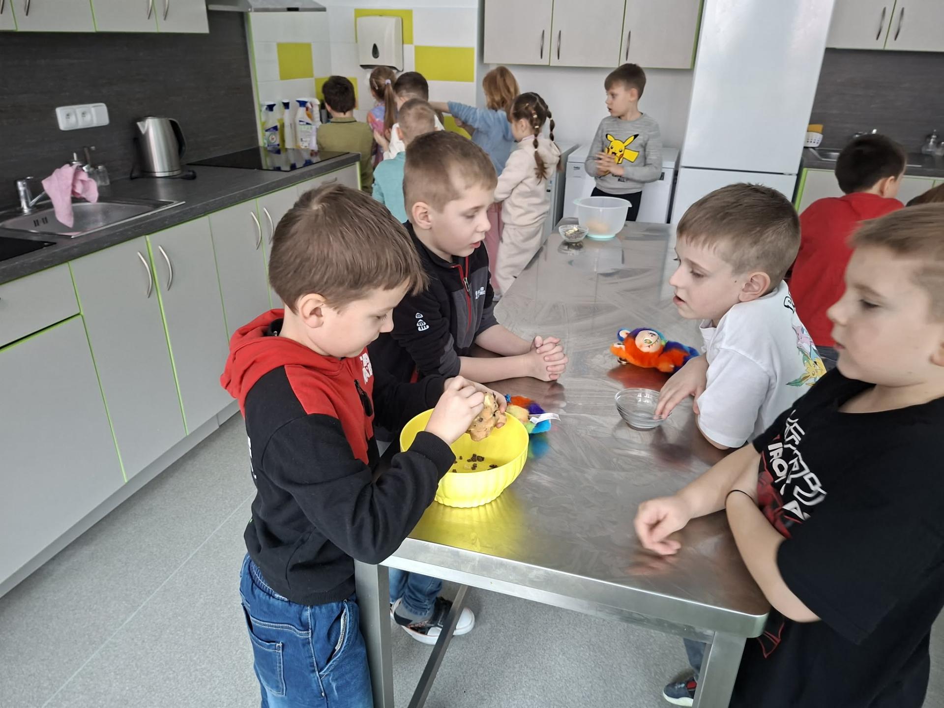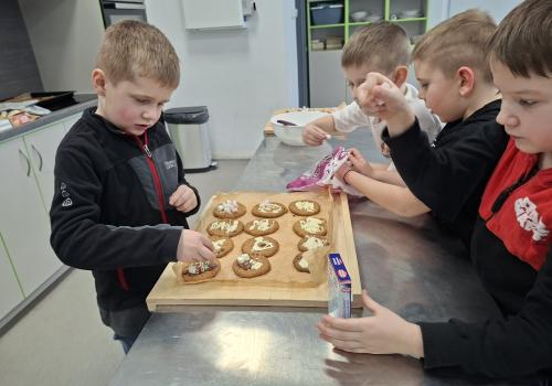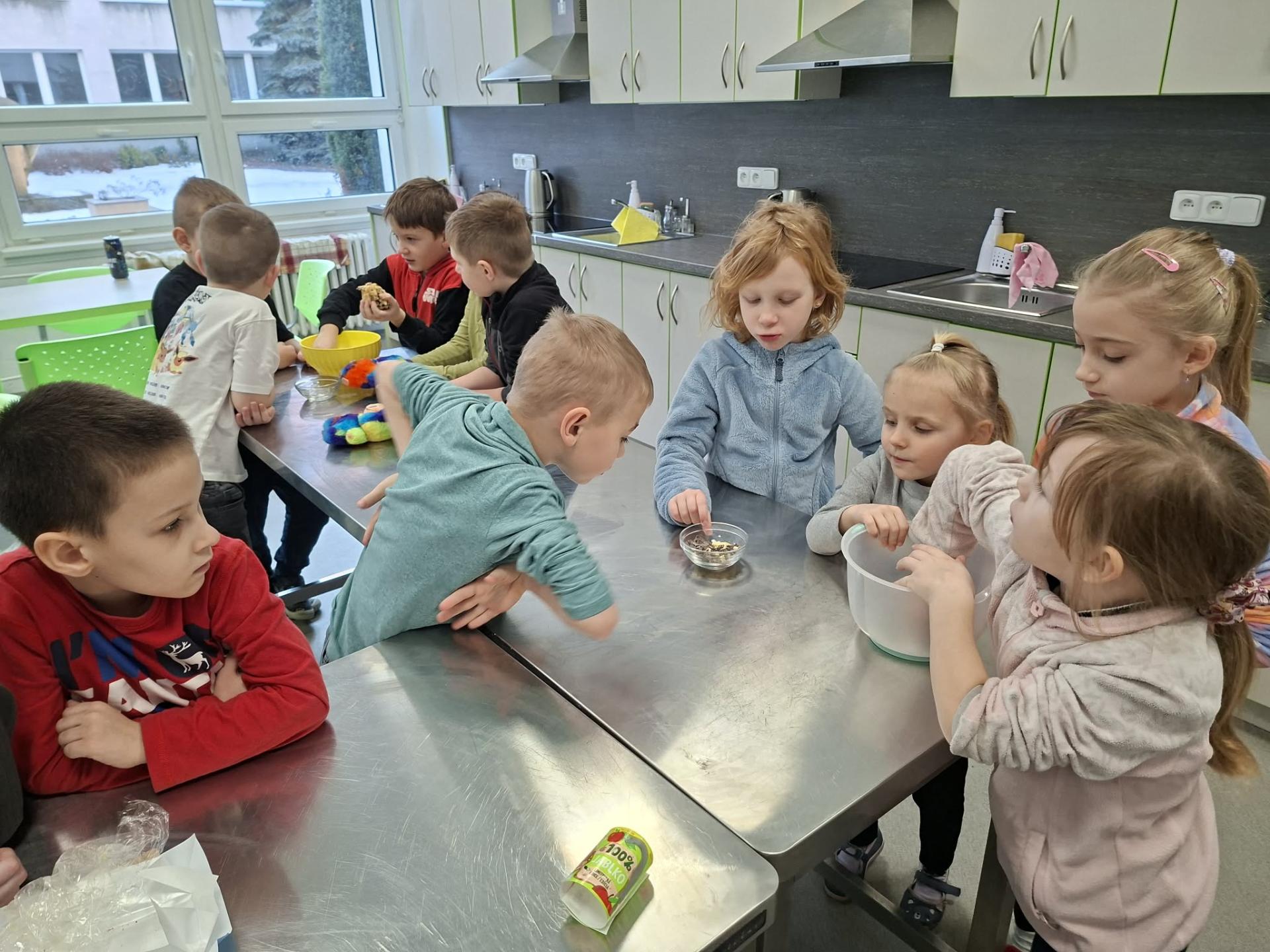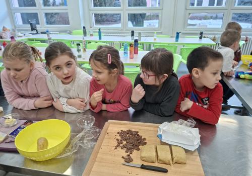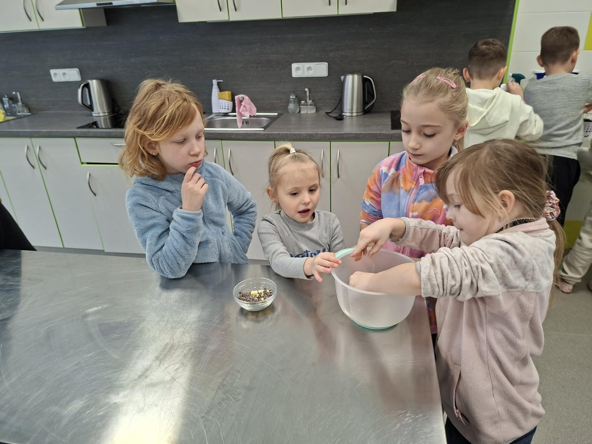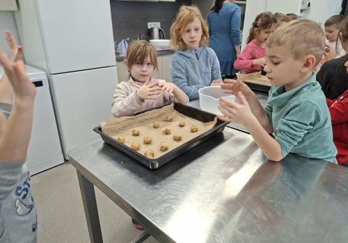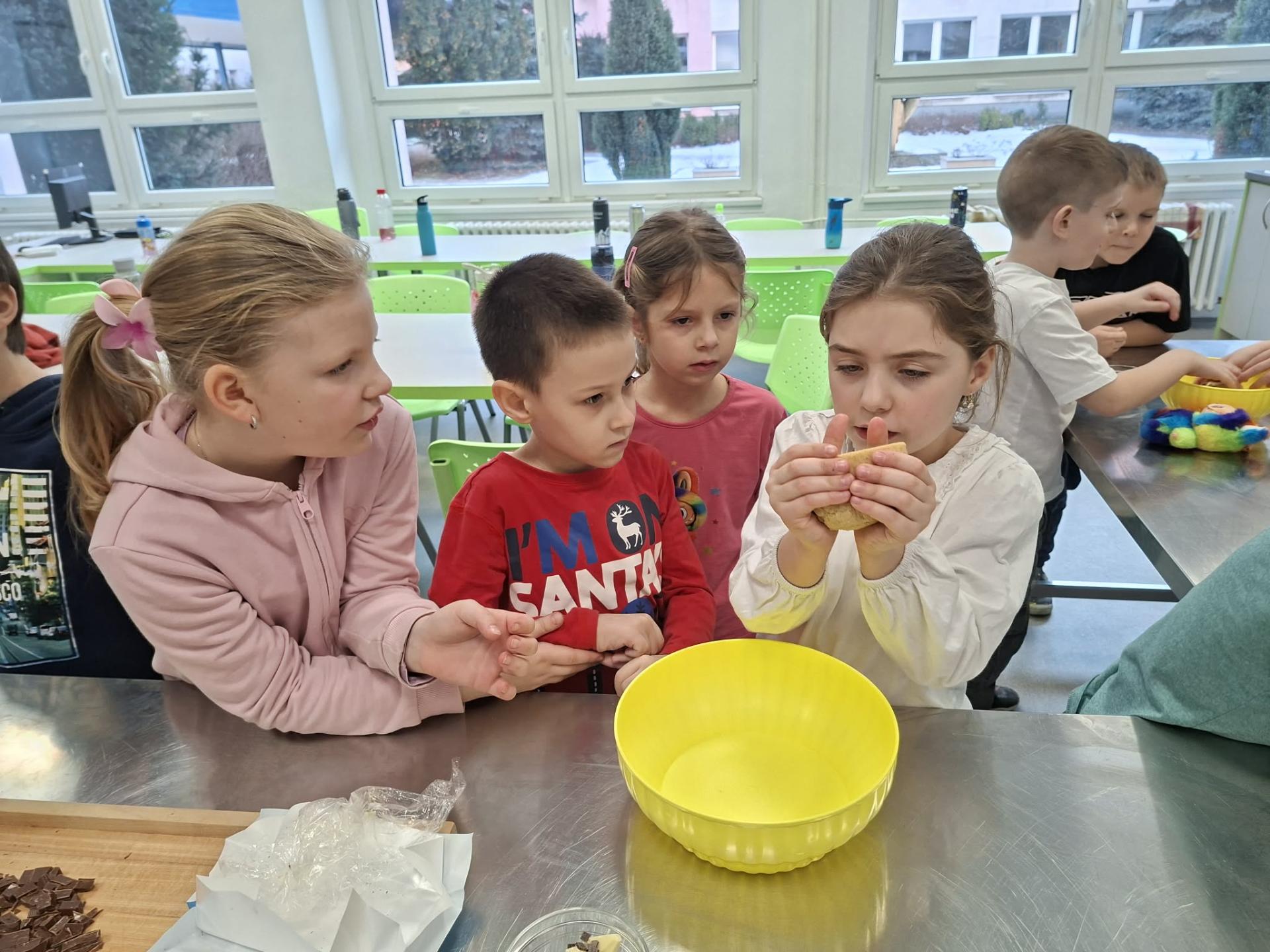 Dnes jsme s dětmi zavítali do školní kuchyňky, kde jsme si společně upekli lahodné cookies. Děti dostaly připravené těsto, do kterého si mohly přidat ingredience podle chuti – na výběr byla bílá a mléčná čokoláda nebo oříšky. Z těsta jsme tvořili kuličky, které jsme pokládali na plech, a pak už jsme netrpělivě čekali, jak budou sušenky po upečení vypadat.