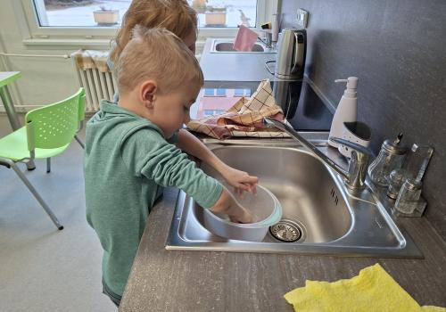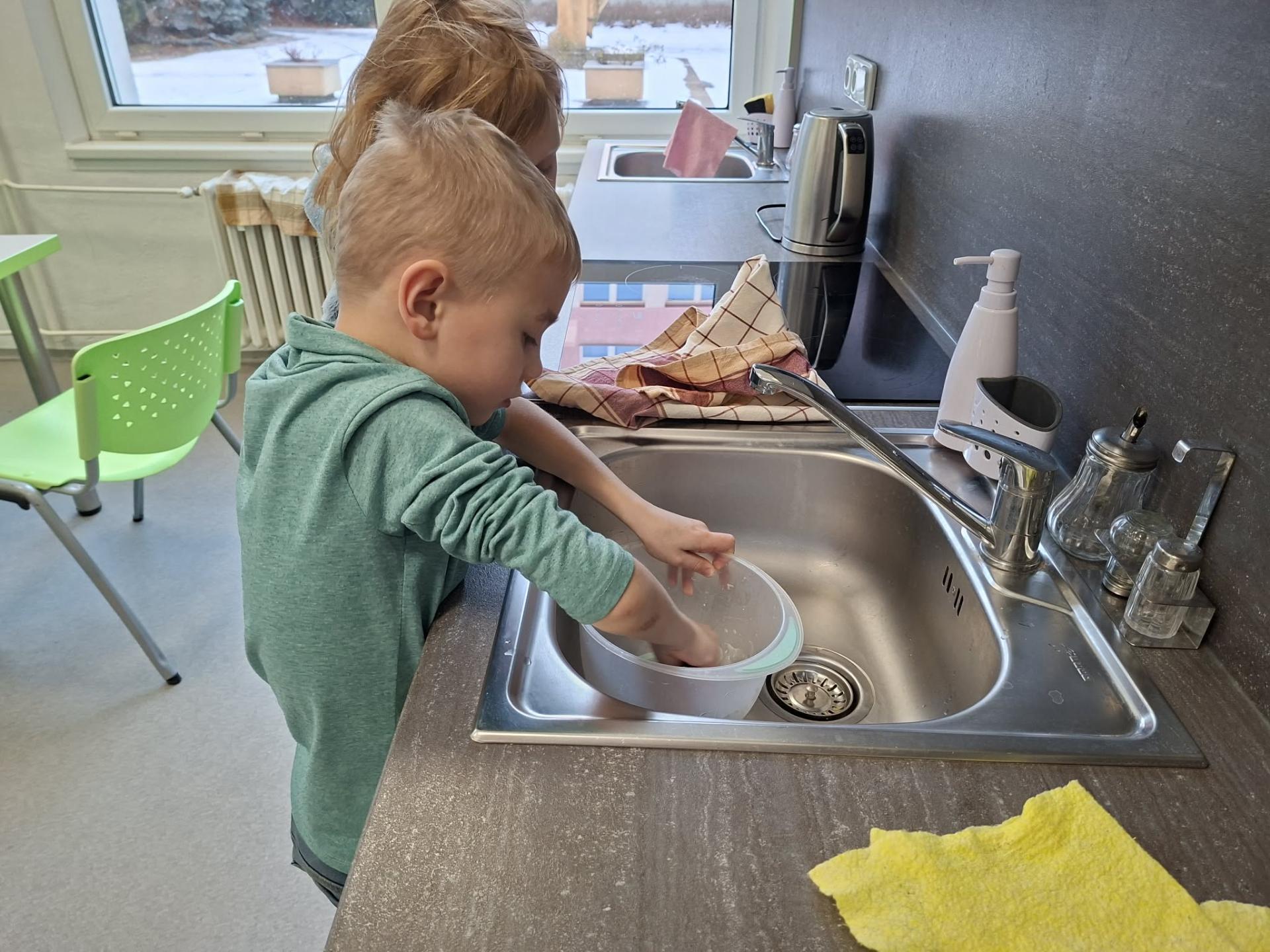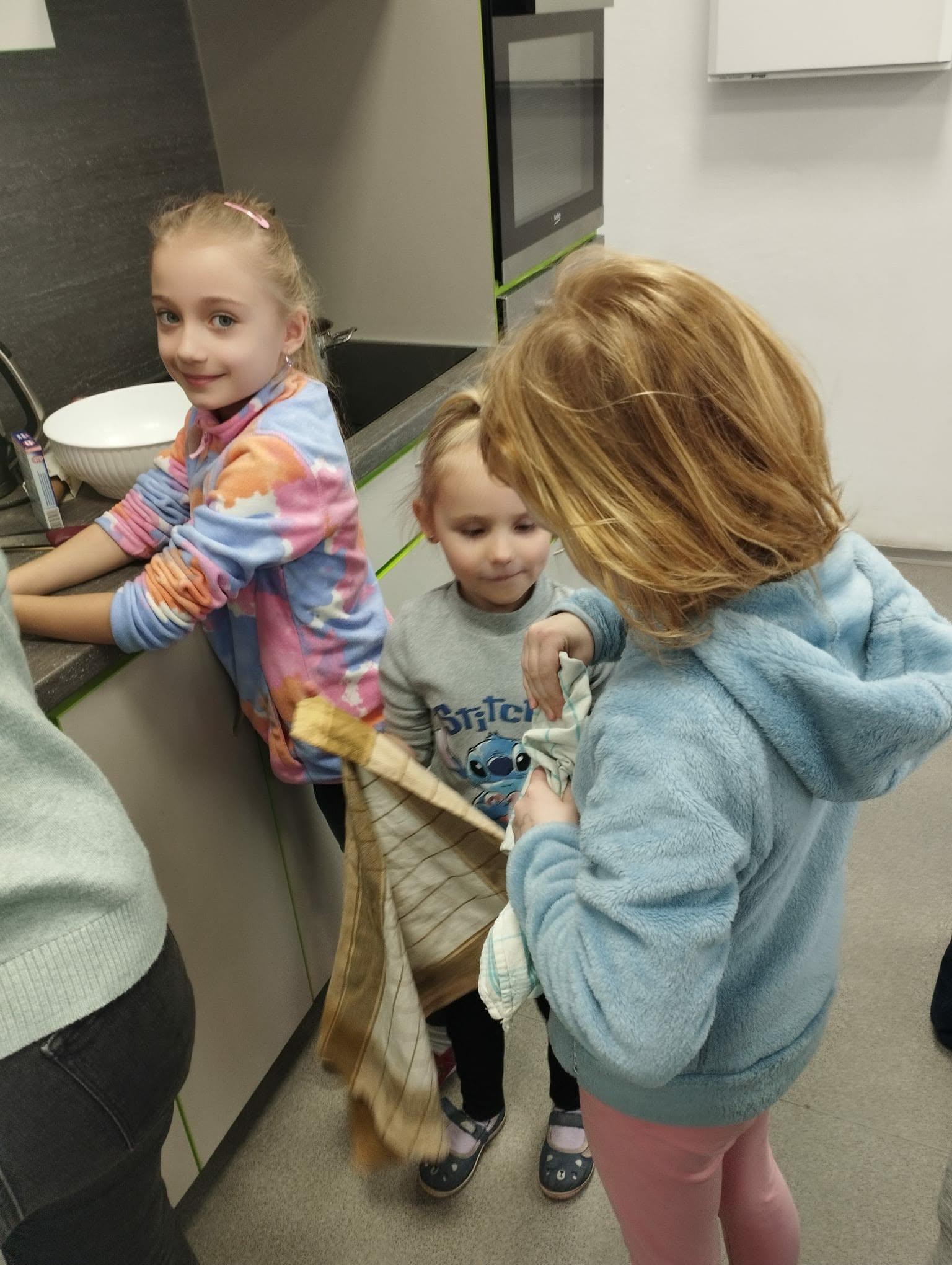 Po vytažení z trouby přišla na řadu kreativní část – zdobení. Sušenky jsme polili rozpuštěnou čokoládou a ozdobili různobarevnými posypkami. A protože k pečení neodmyslitelně patří i úklid, děti si po sobě umyly nádobí, utřely ho a vše pečlivě uklidily.