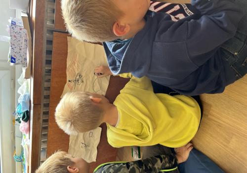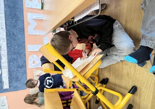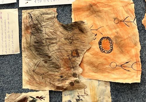 Dnes jsme si vyzkoušeli, jak se tvořilo pravěkým lidem. Třída se proměnila v jeskyni a my v pravěké lidi, kteří kreslí na zdi jeskyně.