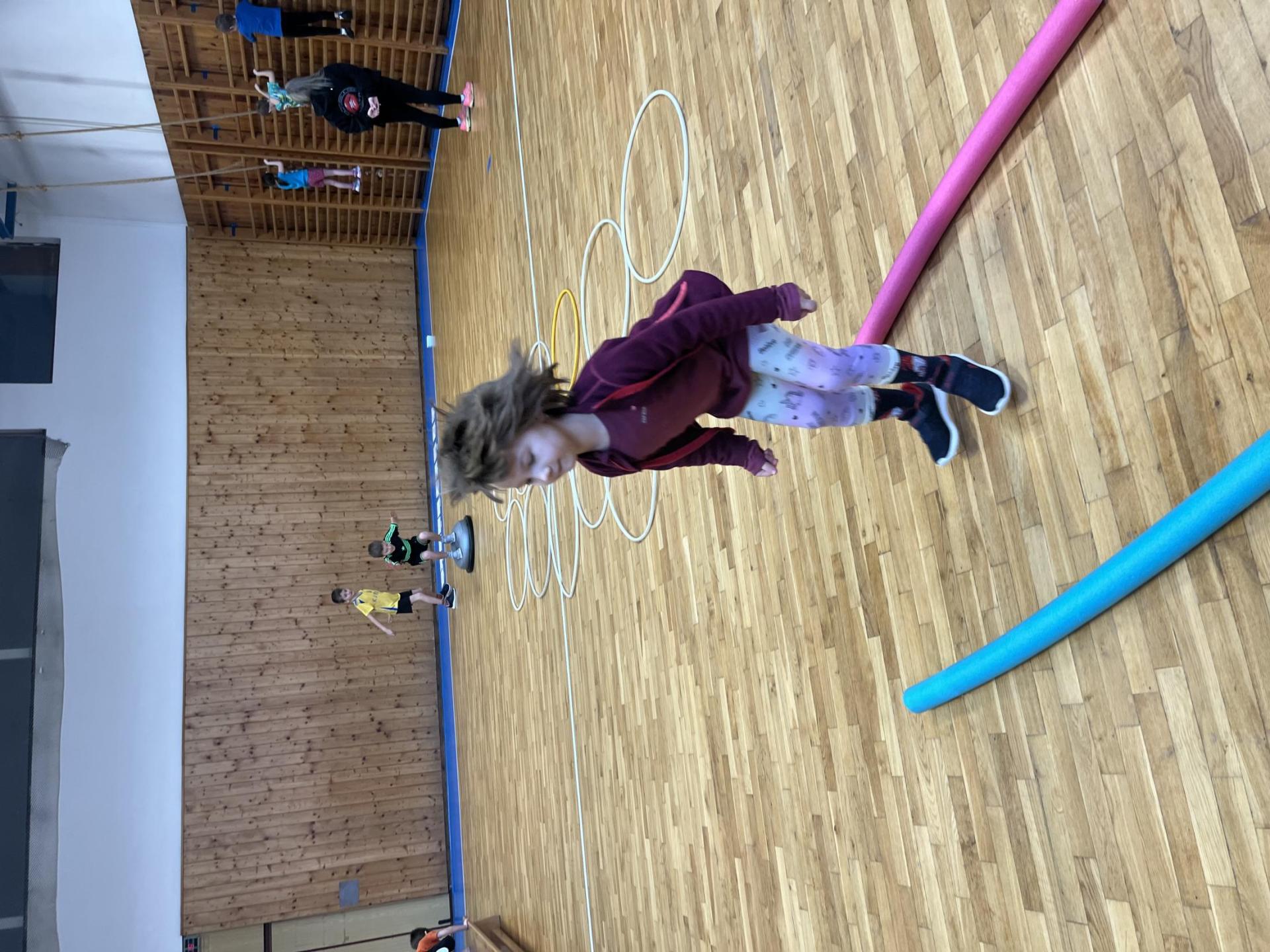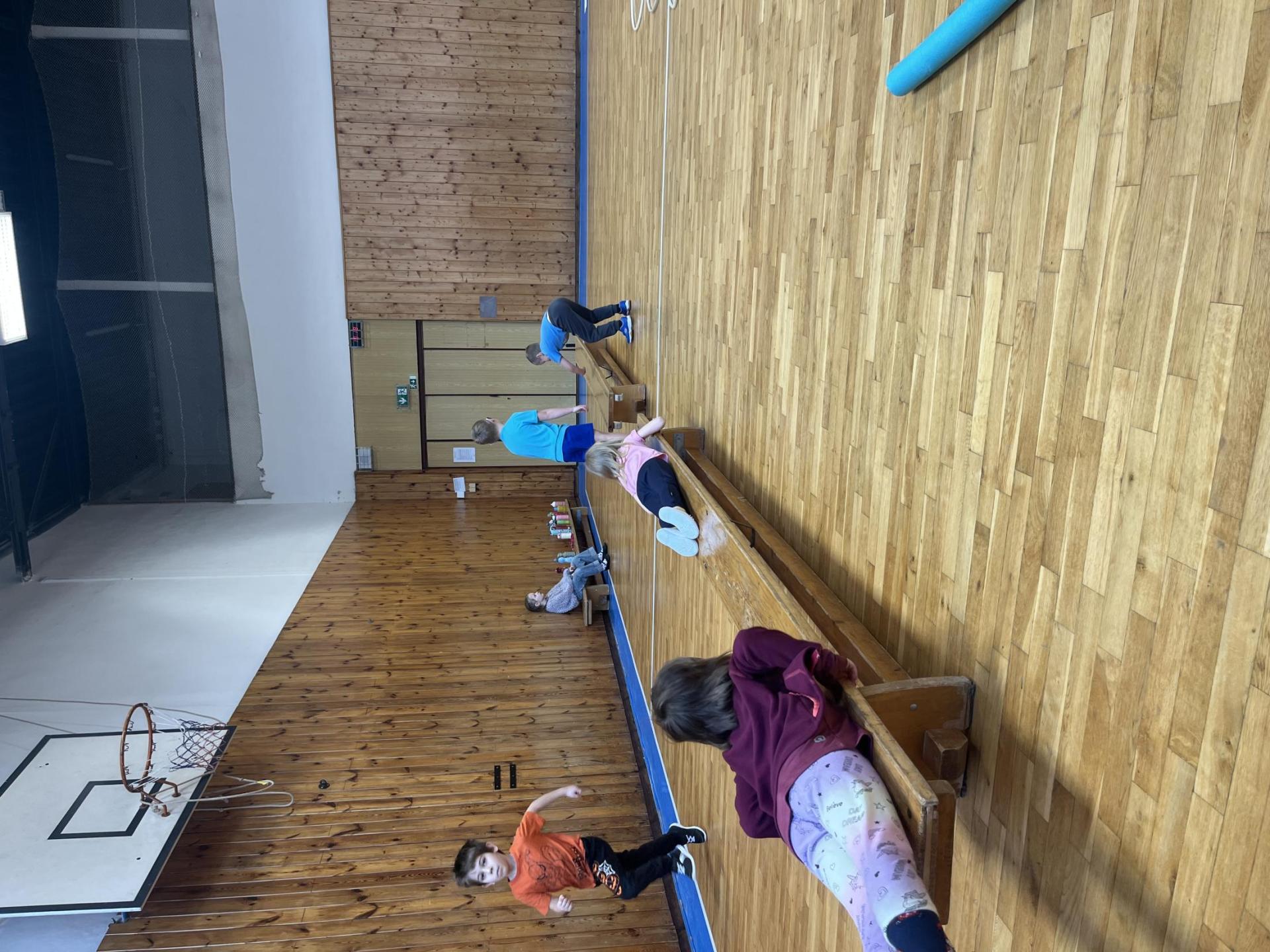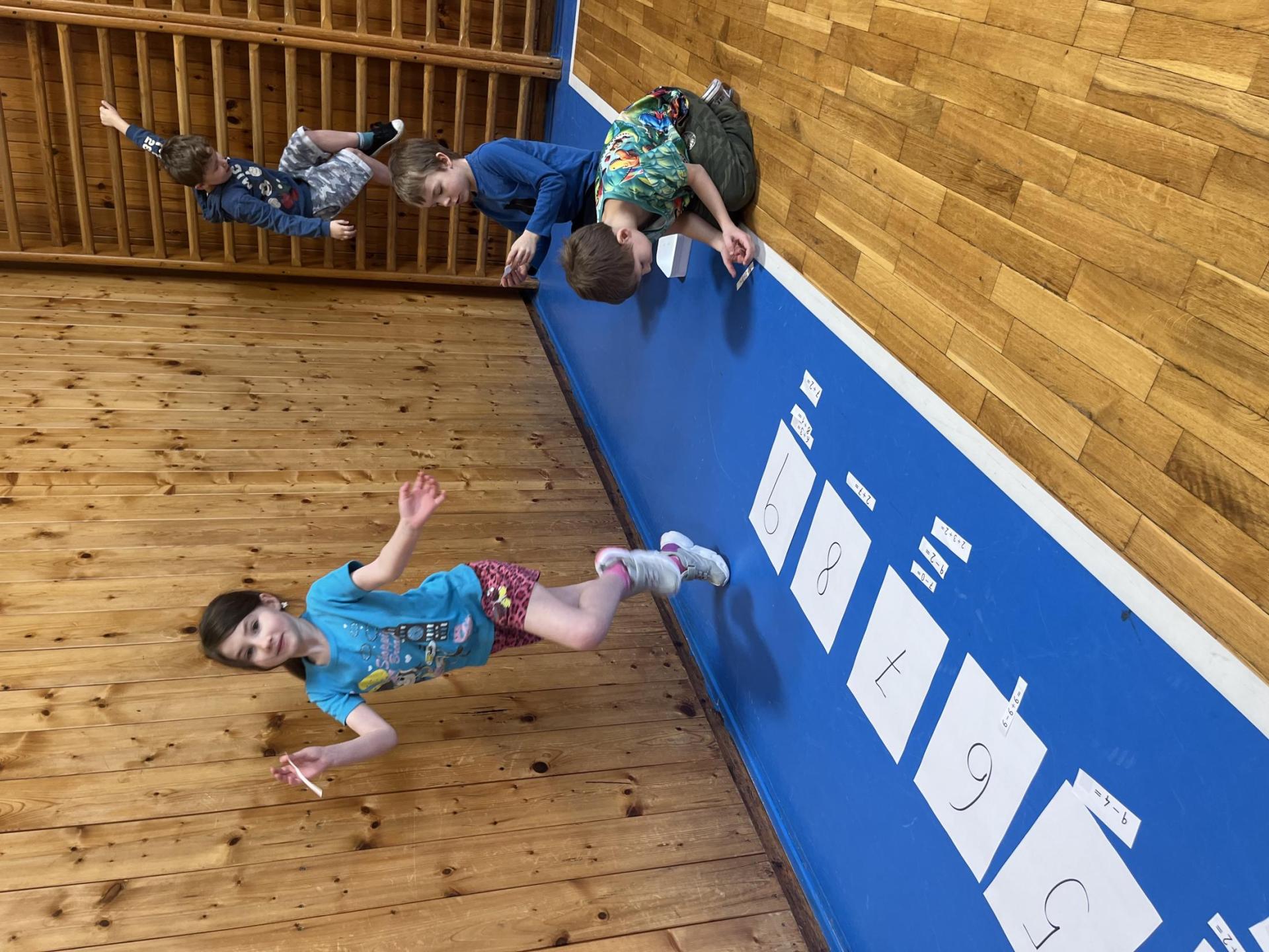Dnešní hodina tělesné výchovy se nesla v duchu překážkové dráhy. Děti postupně překonávaly připravené překážky a zároveň si zábavnou formou procvičily matematiku – vybíraly příklady, správně je vypočítaly a přiřazovaly k odpovídajícím výsledkům. Tato pohybová aktivita děti velmi bavila.