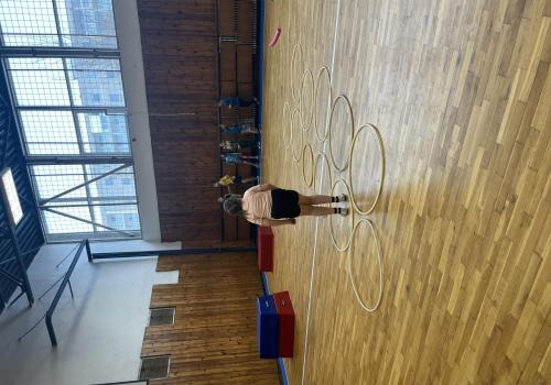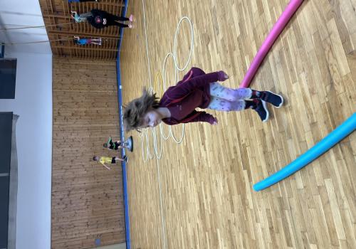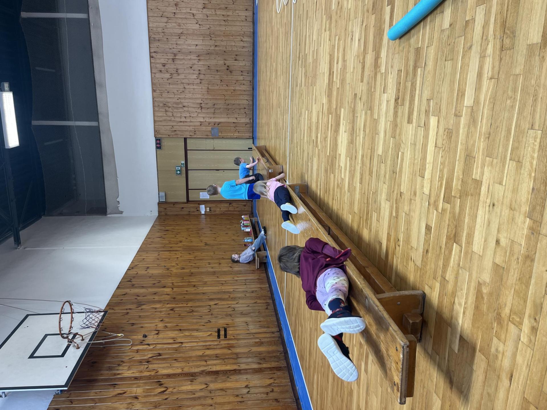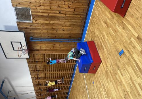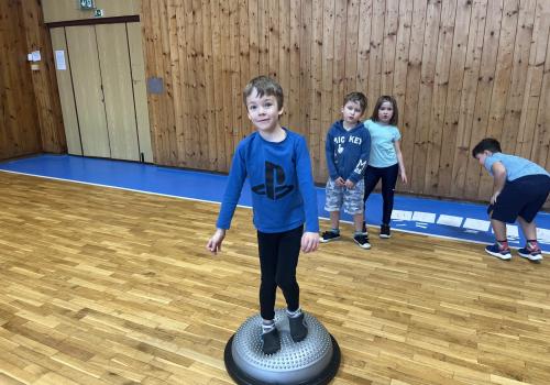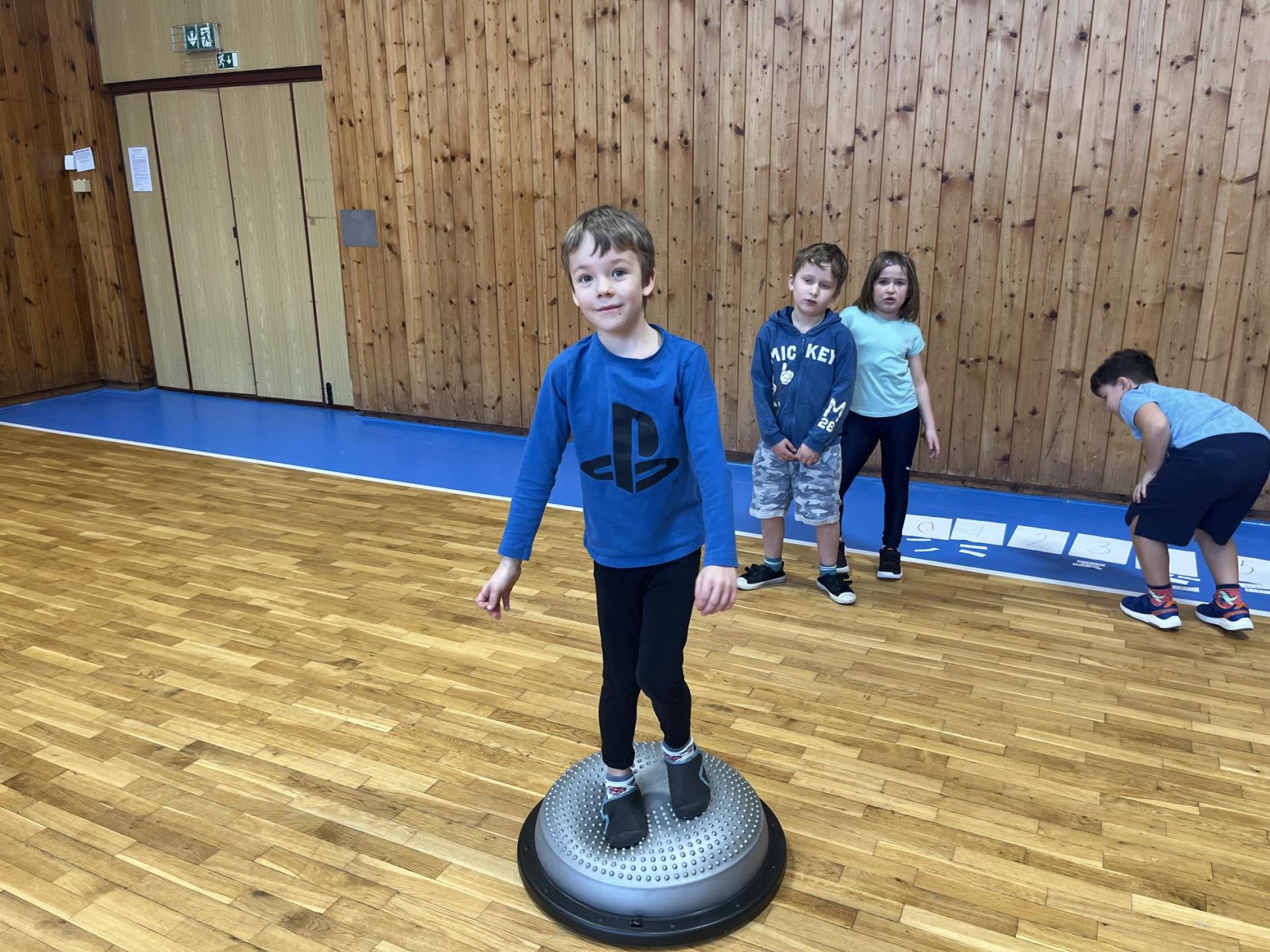 Dnešní hodina tělesné výchovy se nesla v duchu překážkové dráhy. Děti postupně překonávaly připravené překážky a zároveň si zábavnou formou procvičily matematiku – vybíraly příklady, správně je vypočítaly a přiřazovaly k odpovídajícím výsledkům. Tato pohybová aktivita děti velmi bavila.
