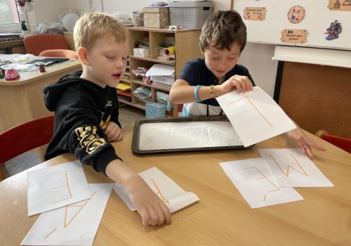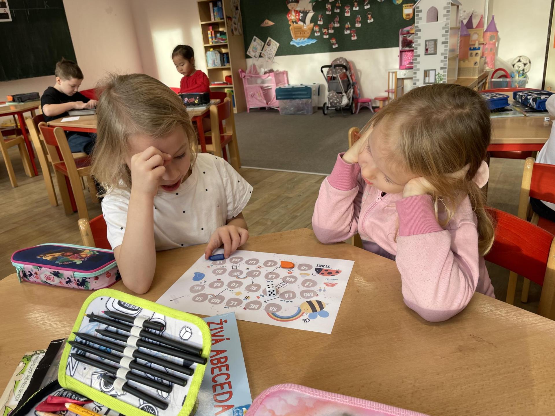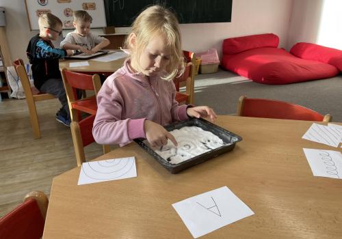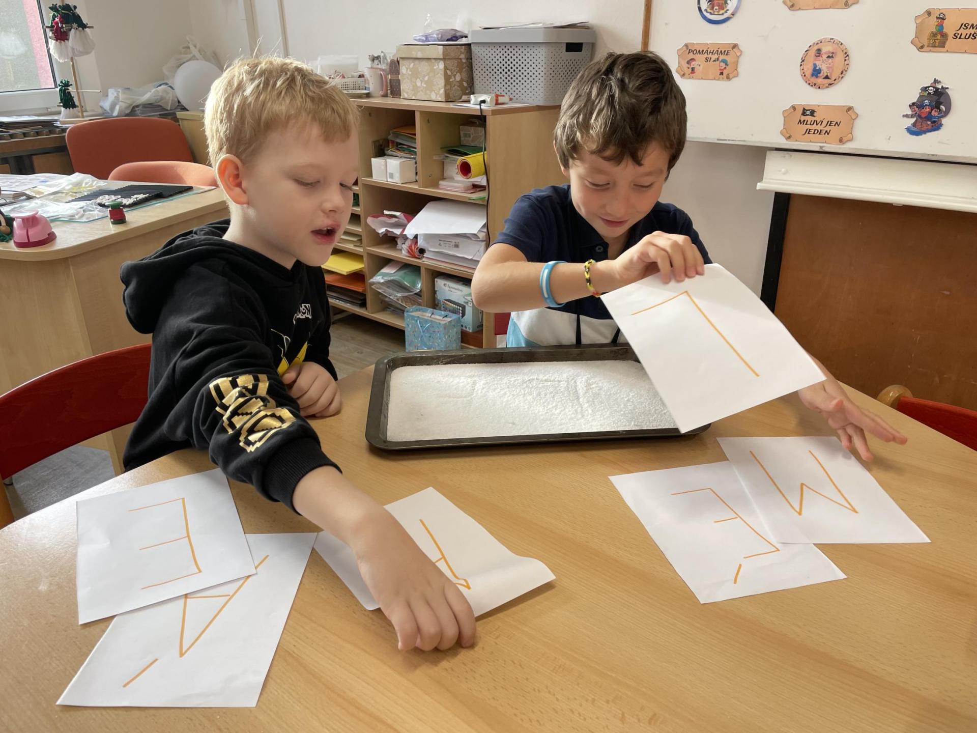 Již od září jsme připravovali ruku na psaní. Důležité bylo uvolnit ruku a pohlídat si držení tužky ve špetkovém úchopu. Ke správnému držení tužky nám pomáhá říkanka: