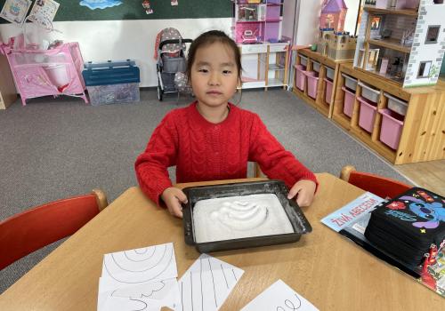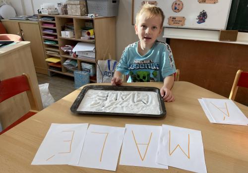 Pak jsme zkoušeli různé techniky na metodu zatlač a povol. A asi nejvíce nás bavilo psaní a kreslení do soli.