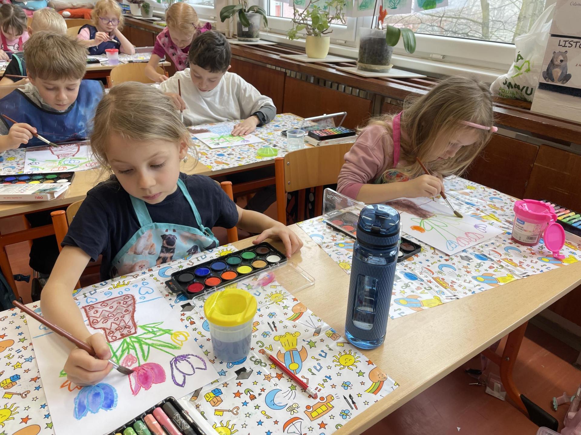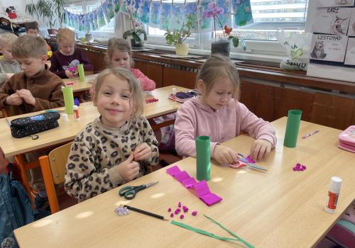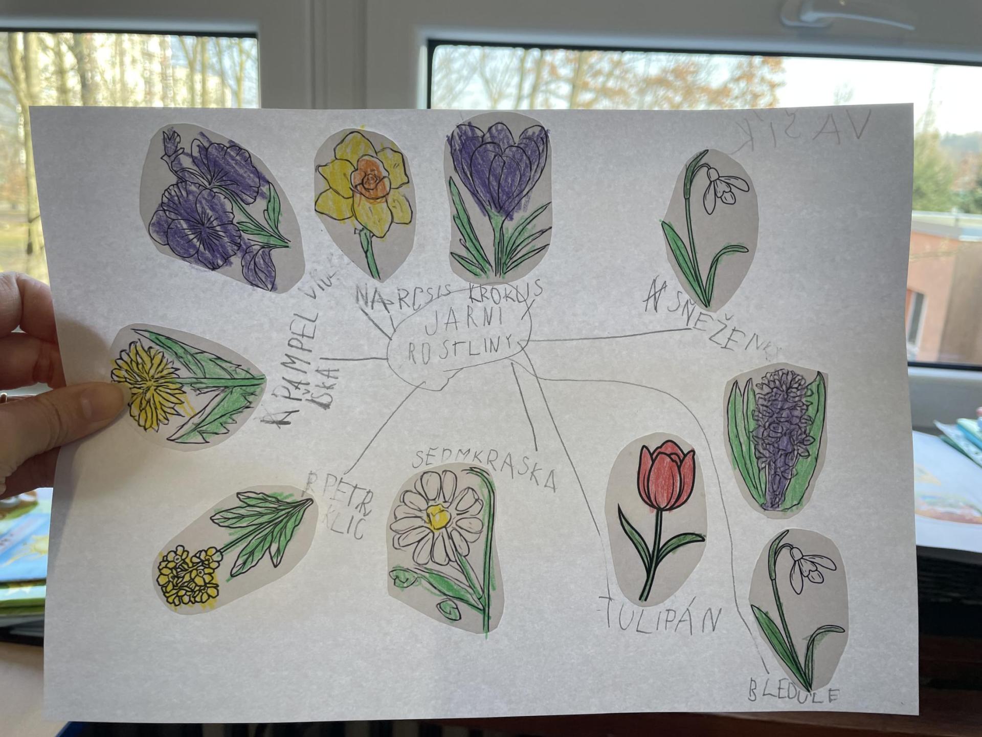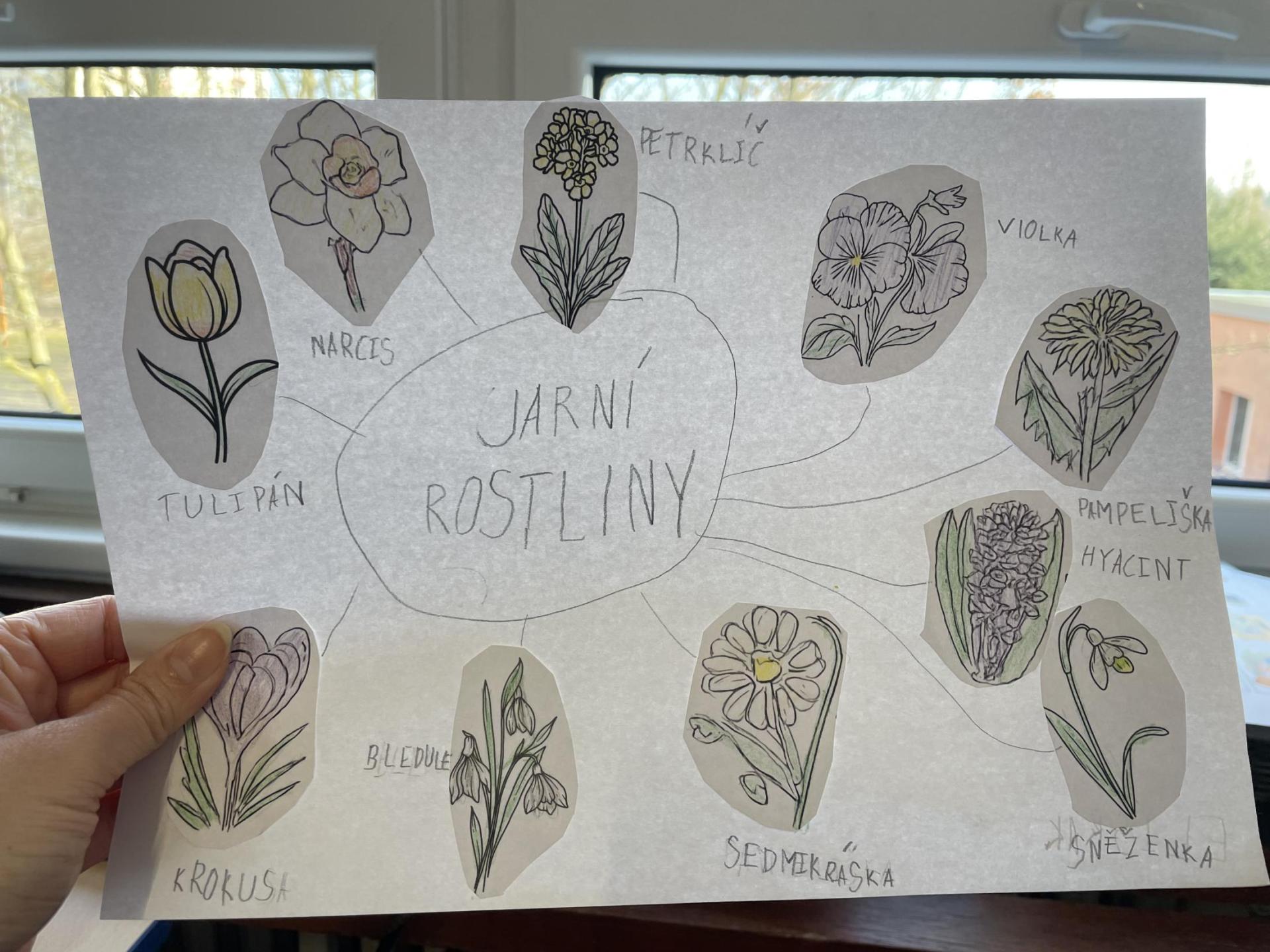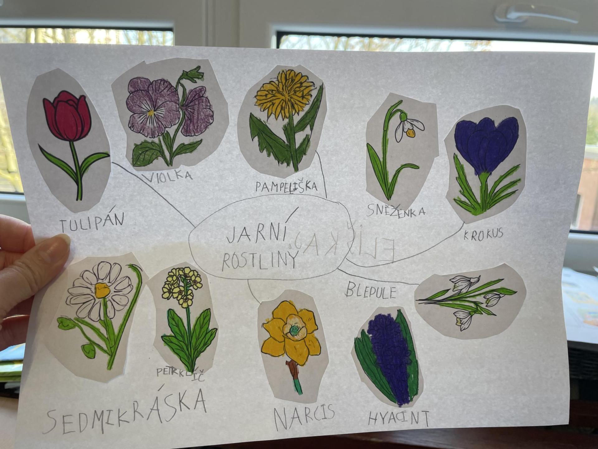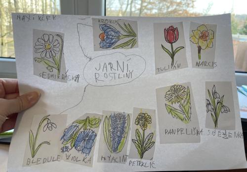 Názvy rostlin si žáci pravidelně upevňovali z plakátů, které jsme měli ve třídě vyvěšené. K lepšímu zapamatování přispělo i výtvarné tvoření – díky tomu teď naši třídu zdobí sněženky, tulipány, hyacinty a dokonce i jedna živá rostlinka – prvosenka jarní (petrklíč).