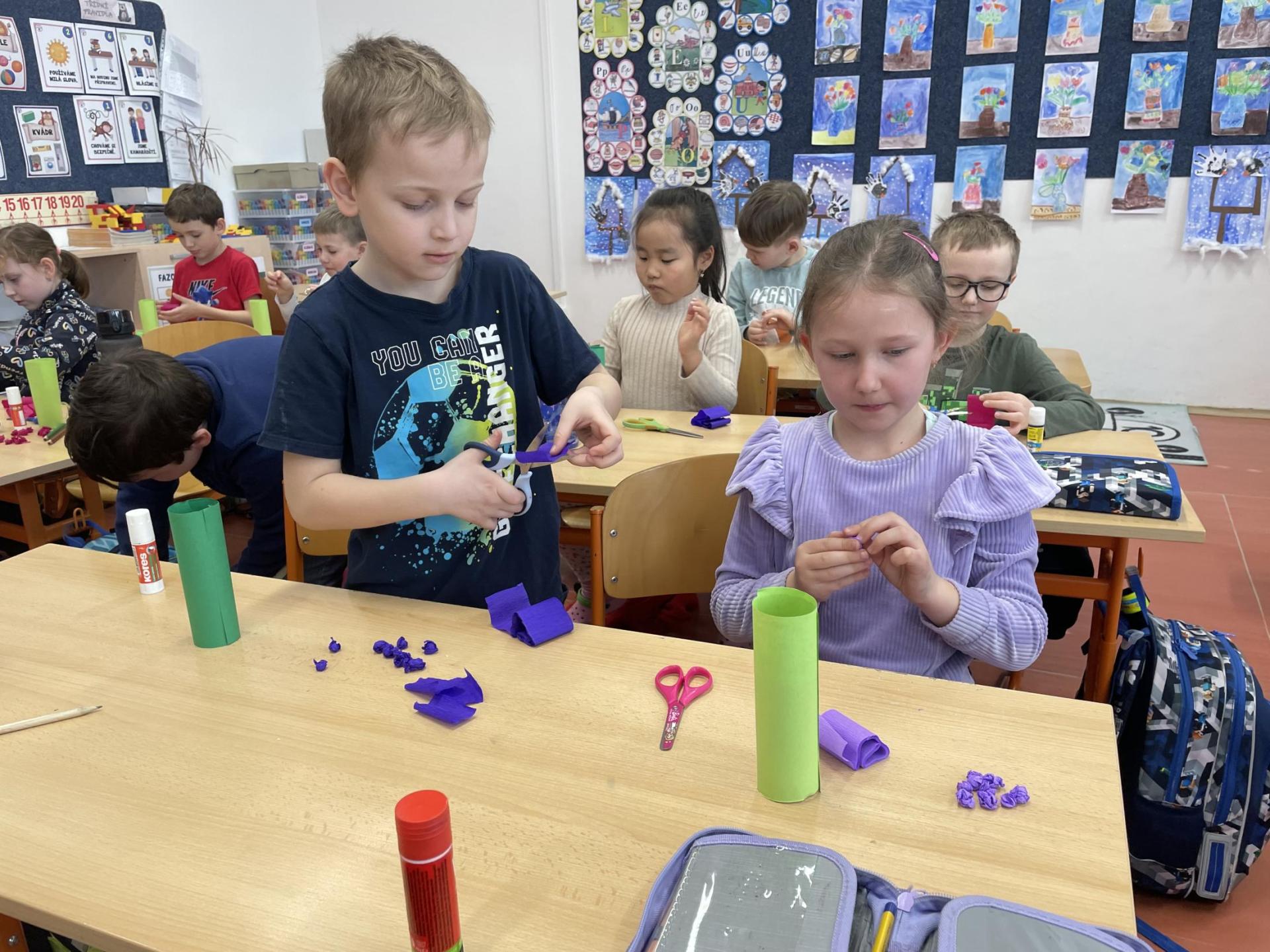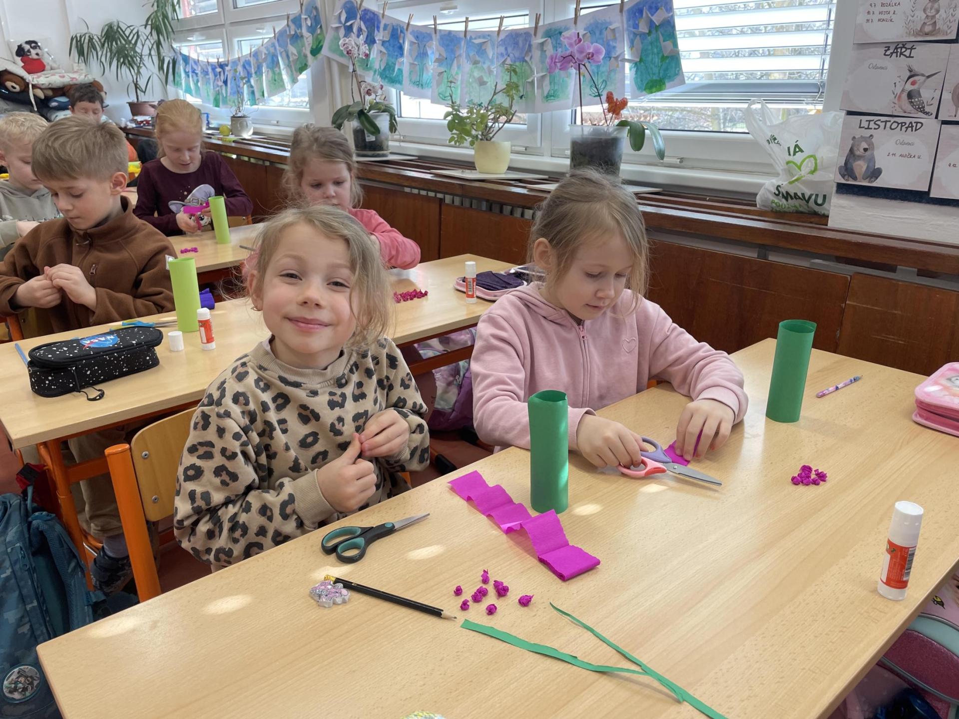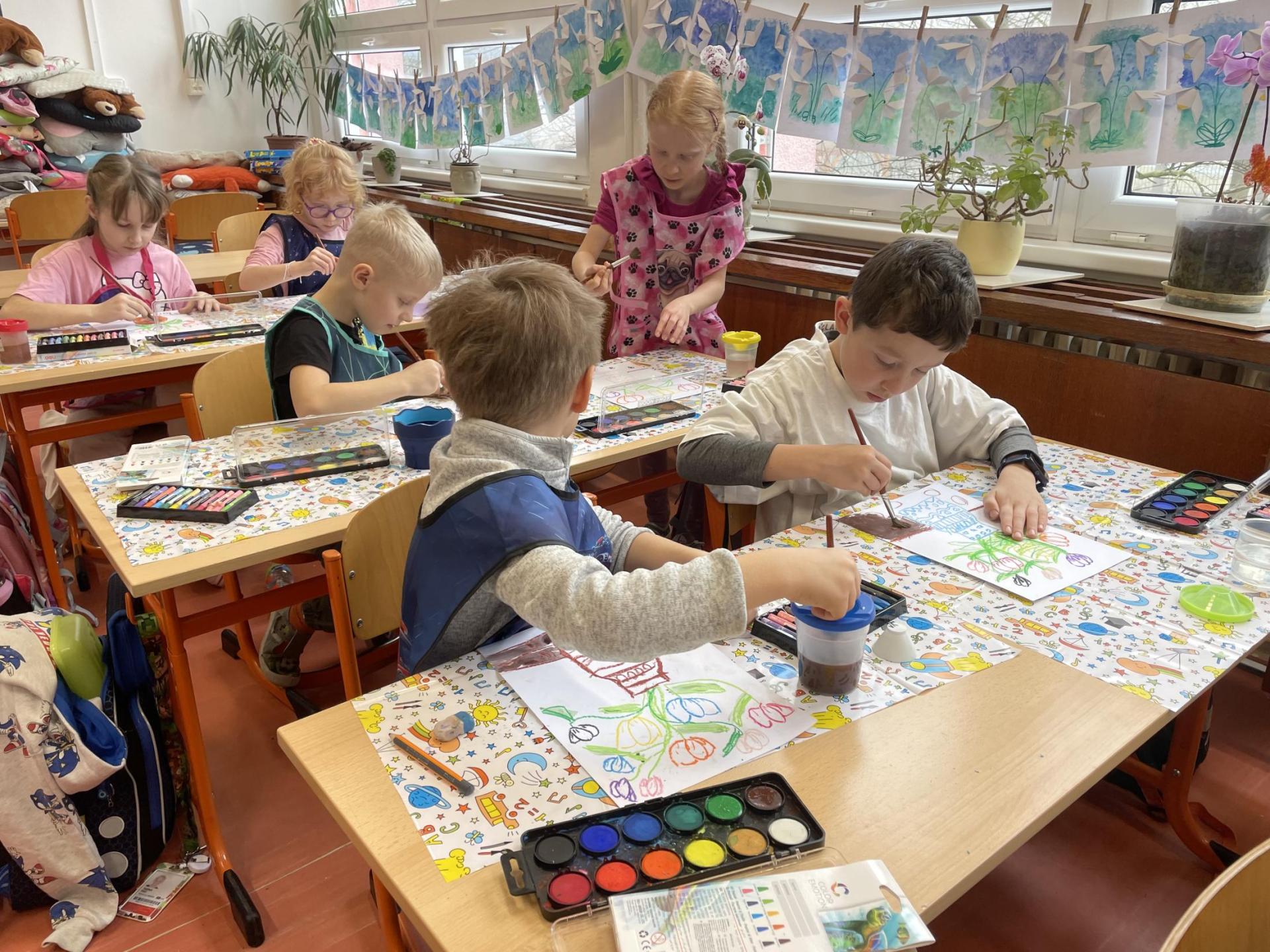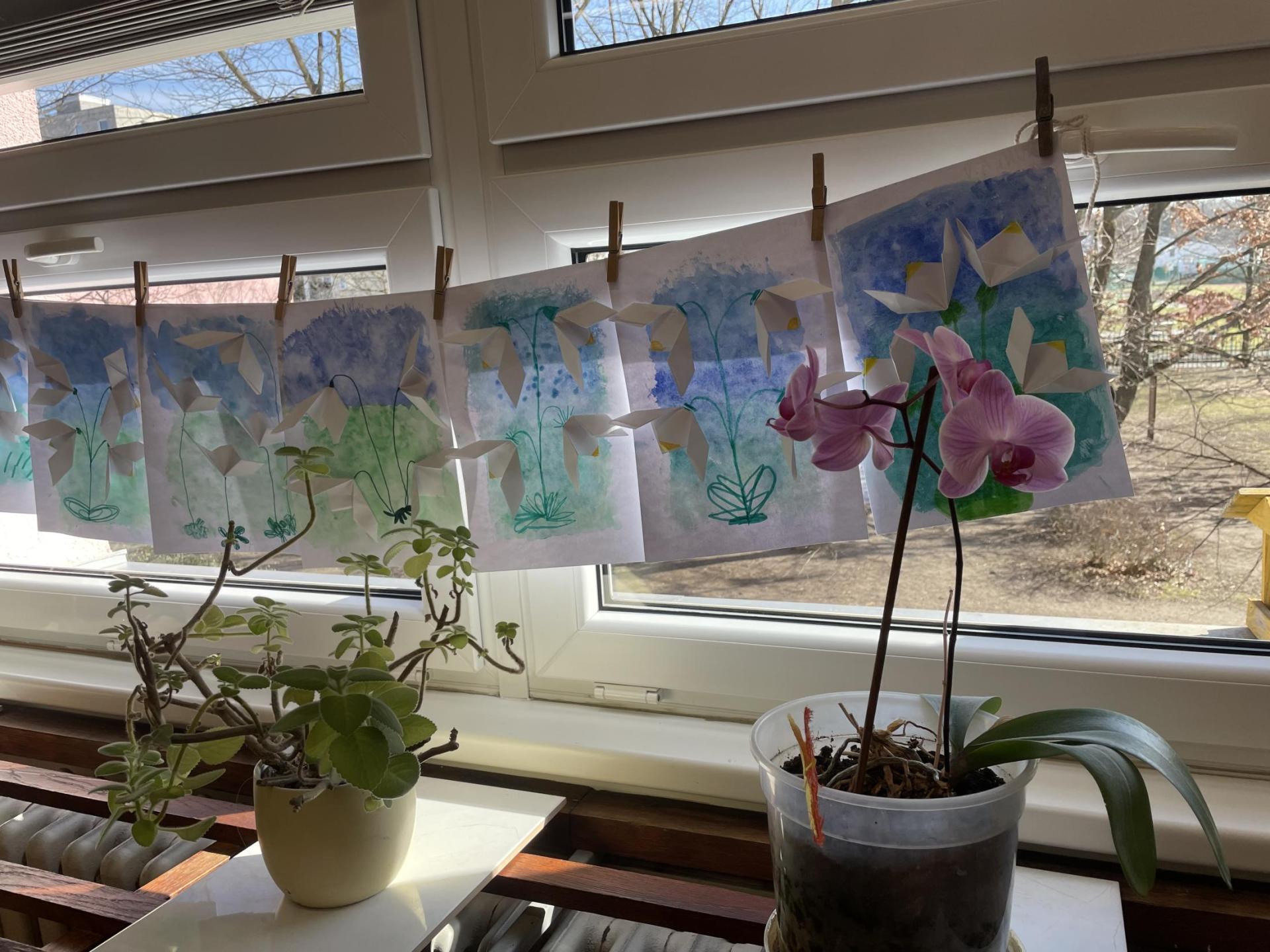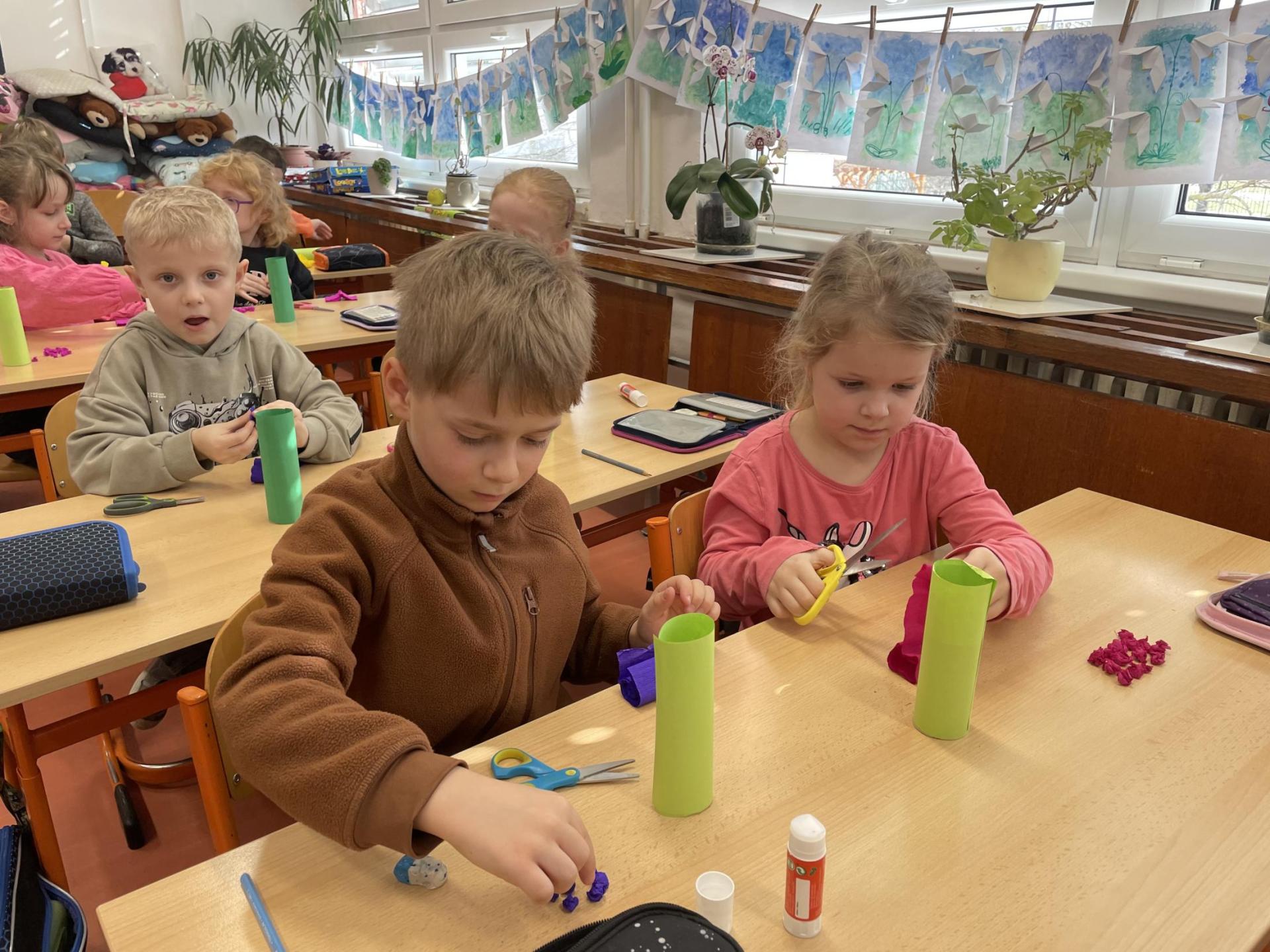 Názvy rostlin si žáci pravidelně upevňovali z plakátů, které jsme měli ve třídě vyvěšené. K lepšímu zapamatování přispělo i výtvarné tvoření – díky tomu teď naši třídu zdobí sněženky, tulipány, hyacinty a dokonce i jedna živá rostlinka – prvosenka jarní (petrklíč).