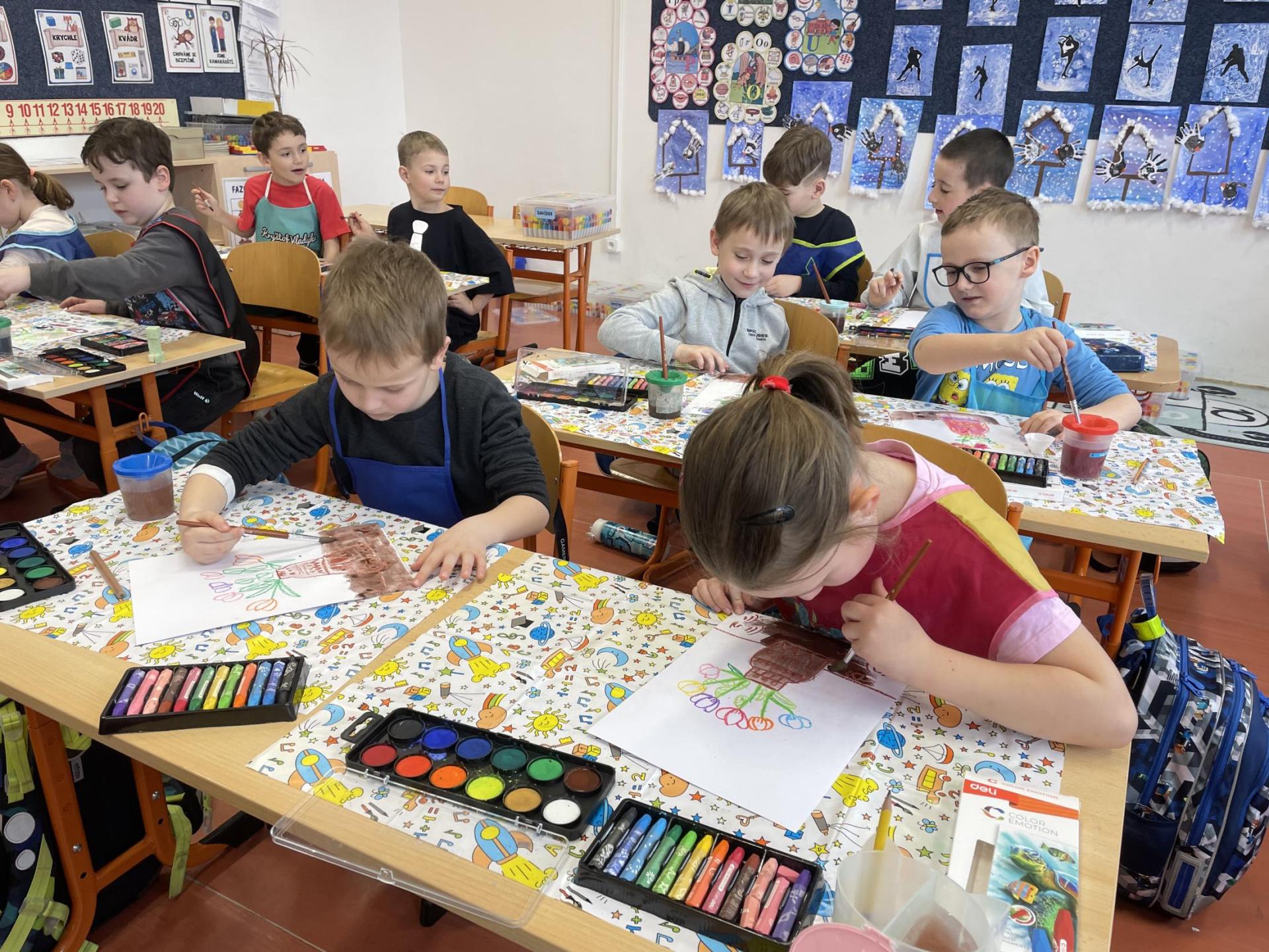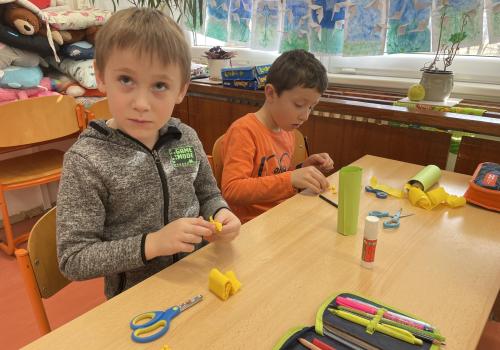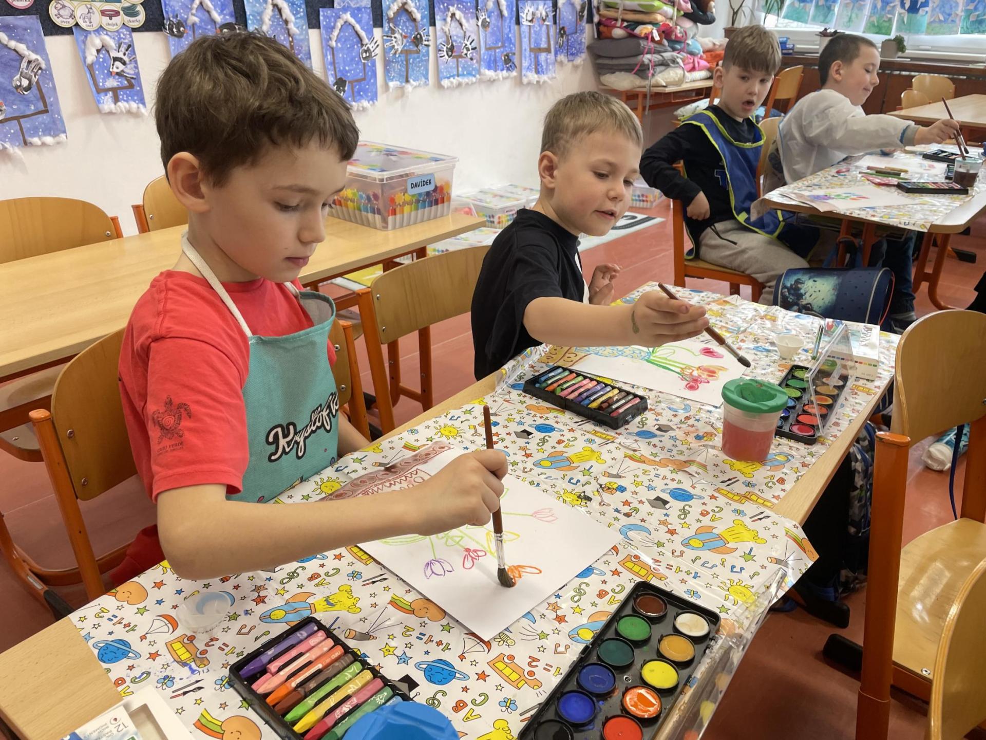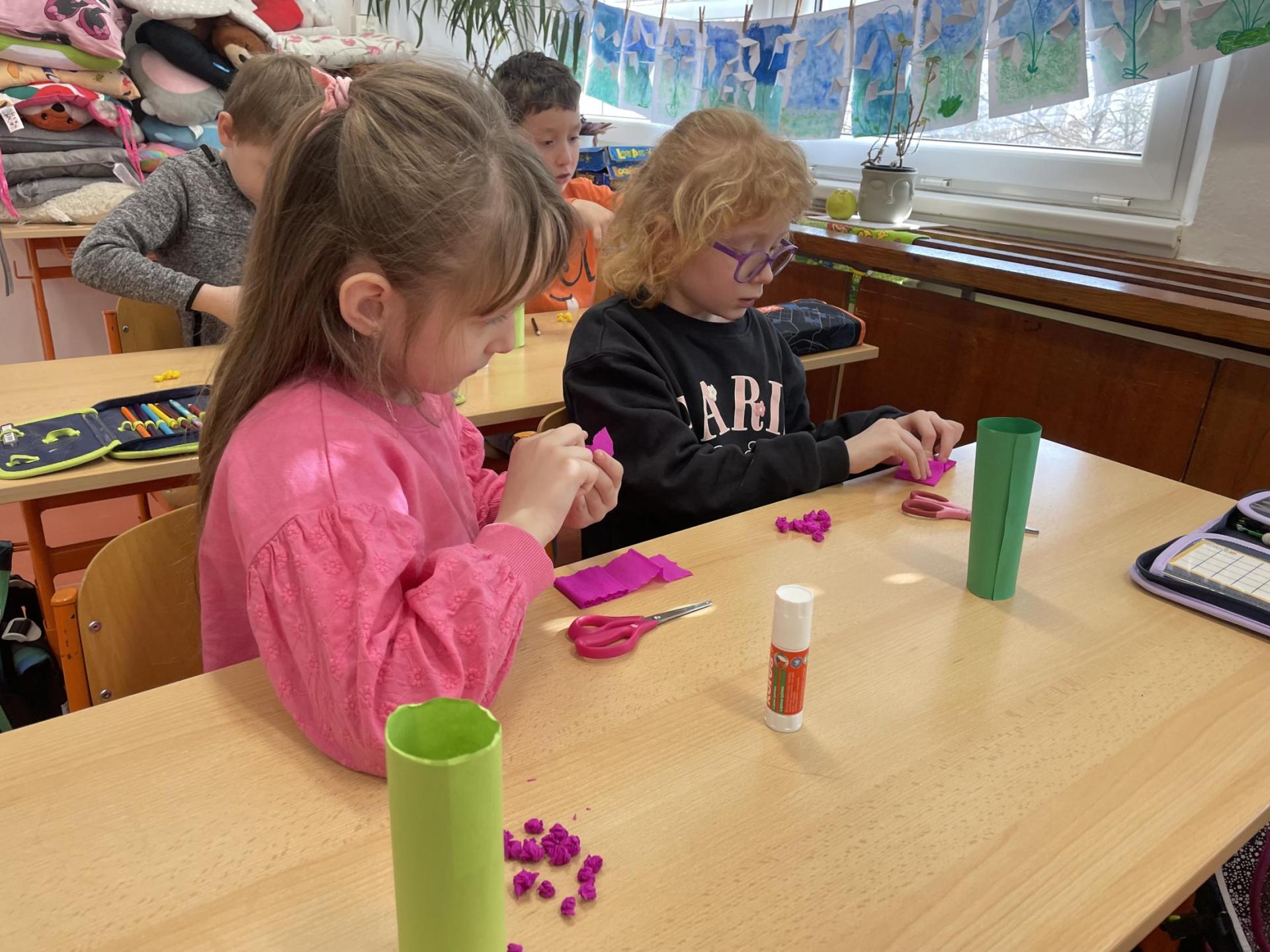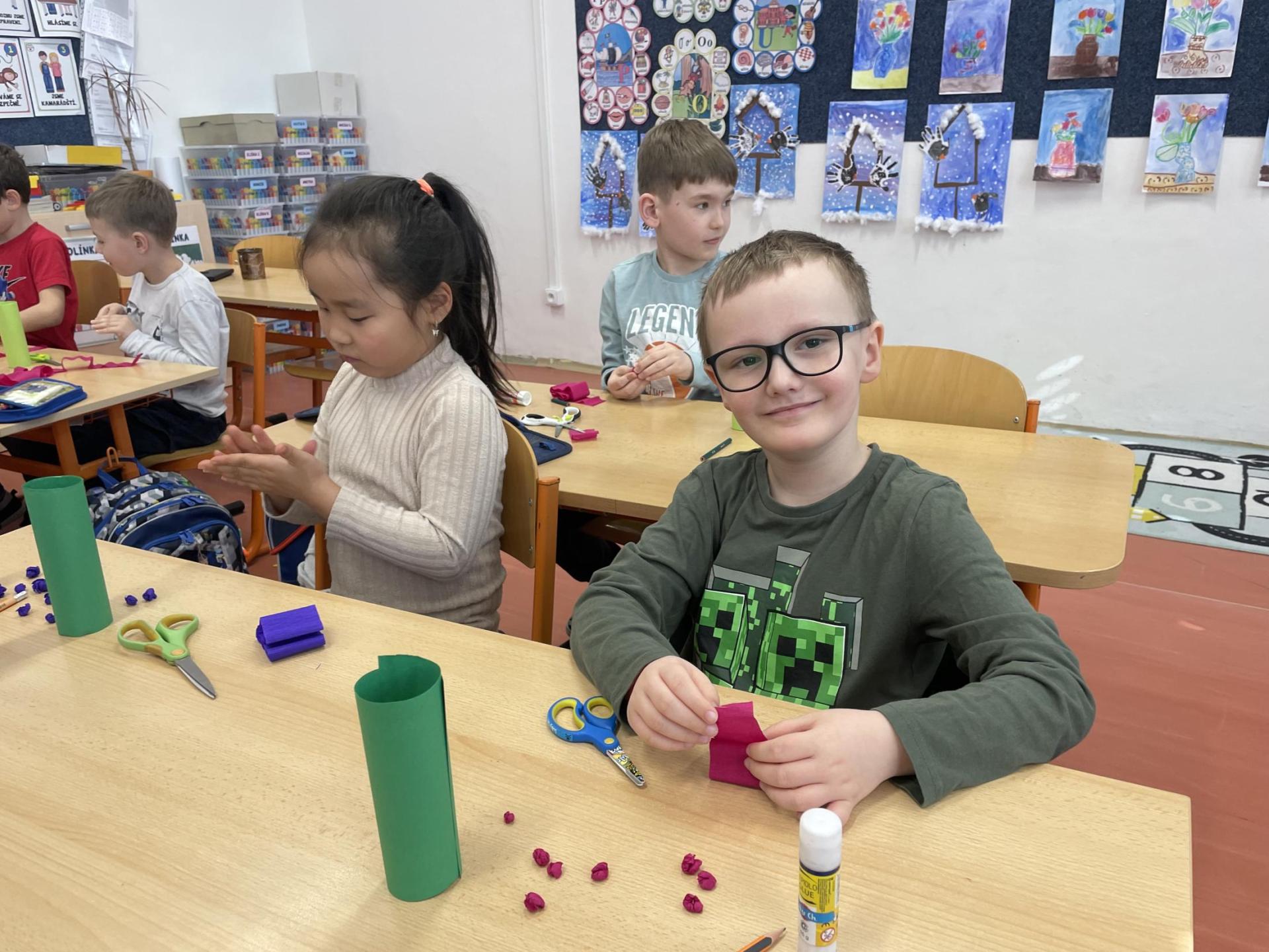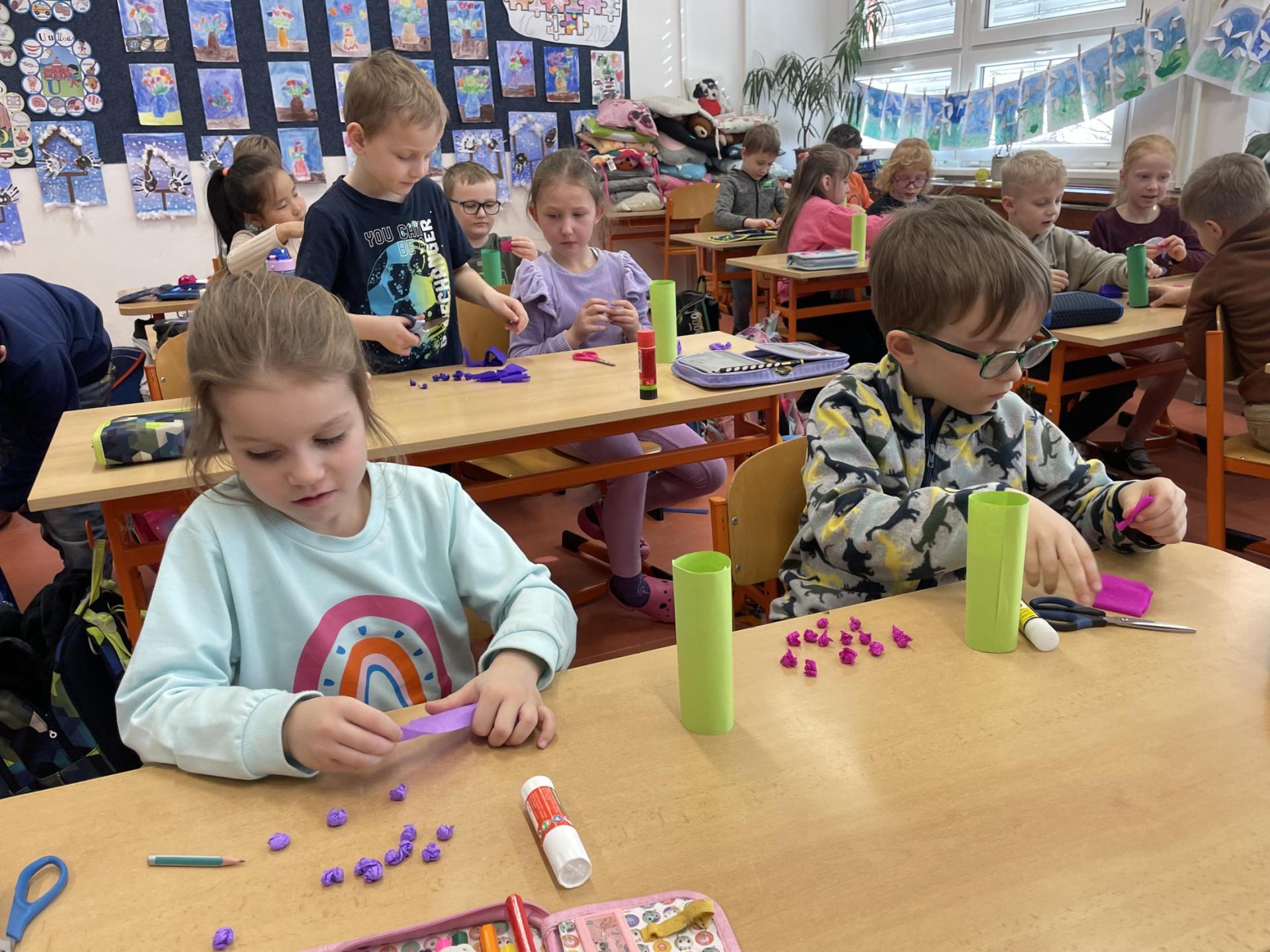 Názvy rostlin si žáci pravidelně upevňovali z plakátů, které jsme měli ve třídě vyvěšené. K lepšímu zapamatování přispělo i výtvarné tvoření – díky tomu teď naši třídu zdobí sněženky, tulipány, hyacinty a dokonce i jedna živá rostlinka – prvosenka jarní (petrklíč).