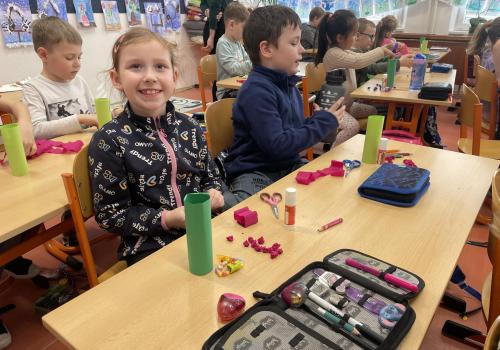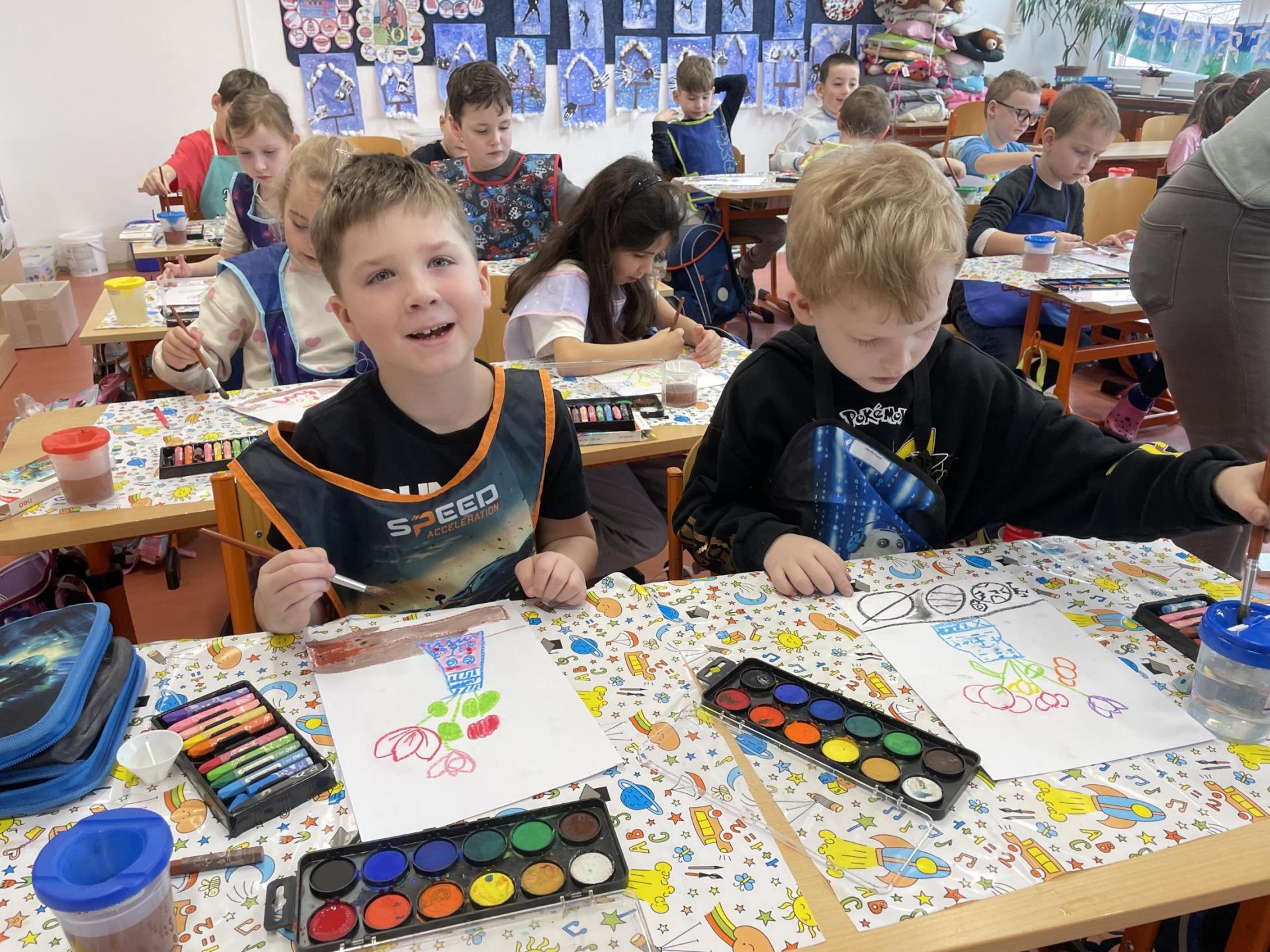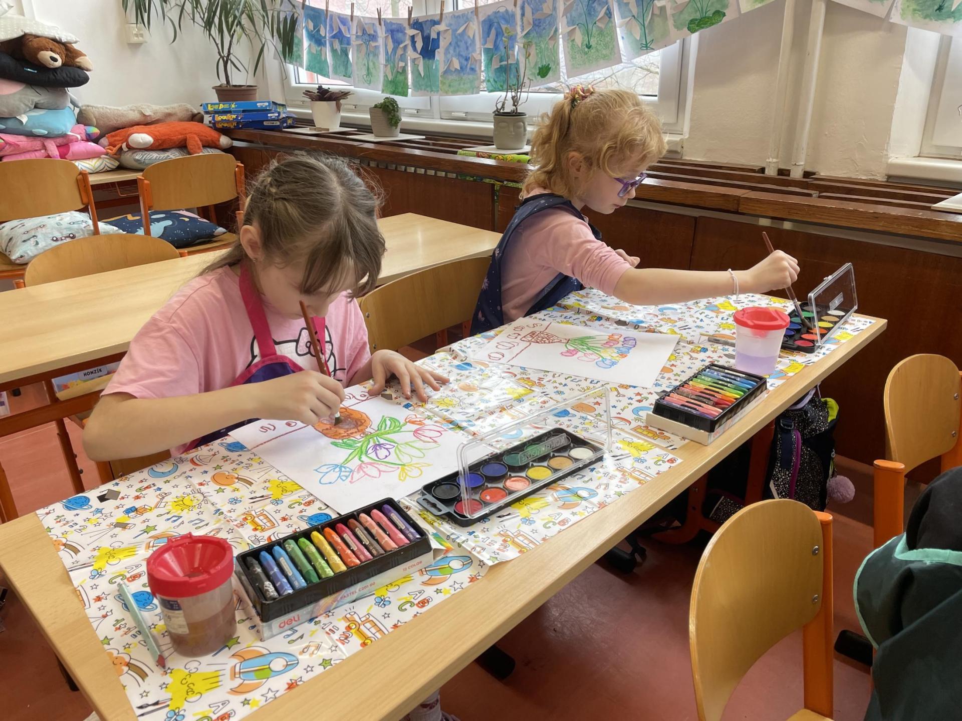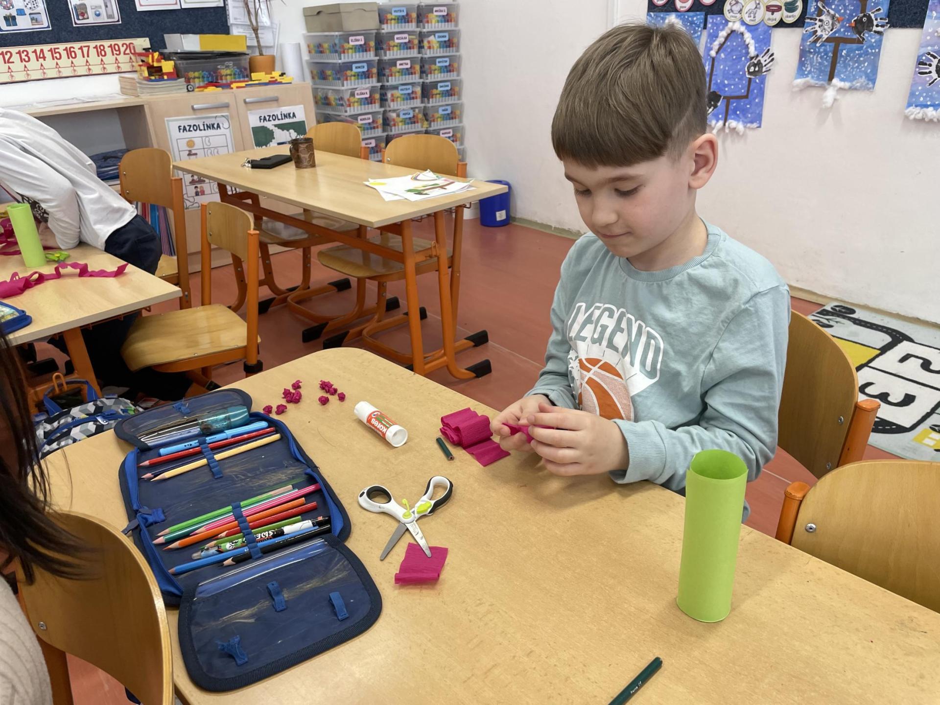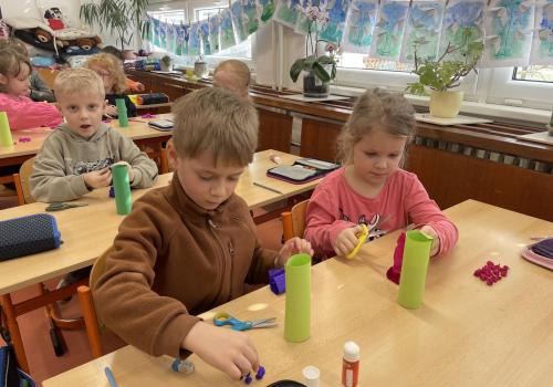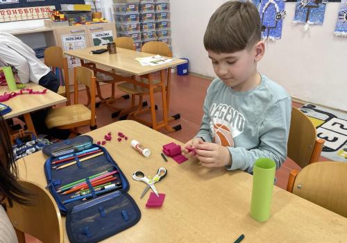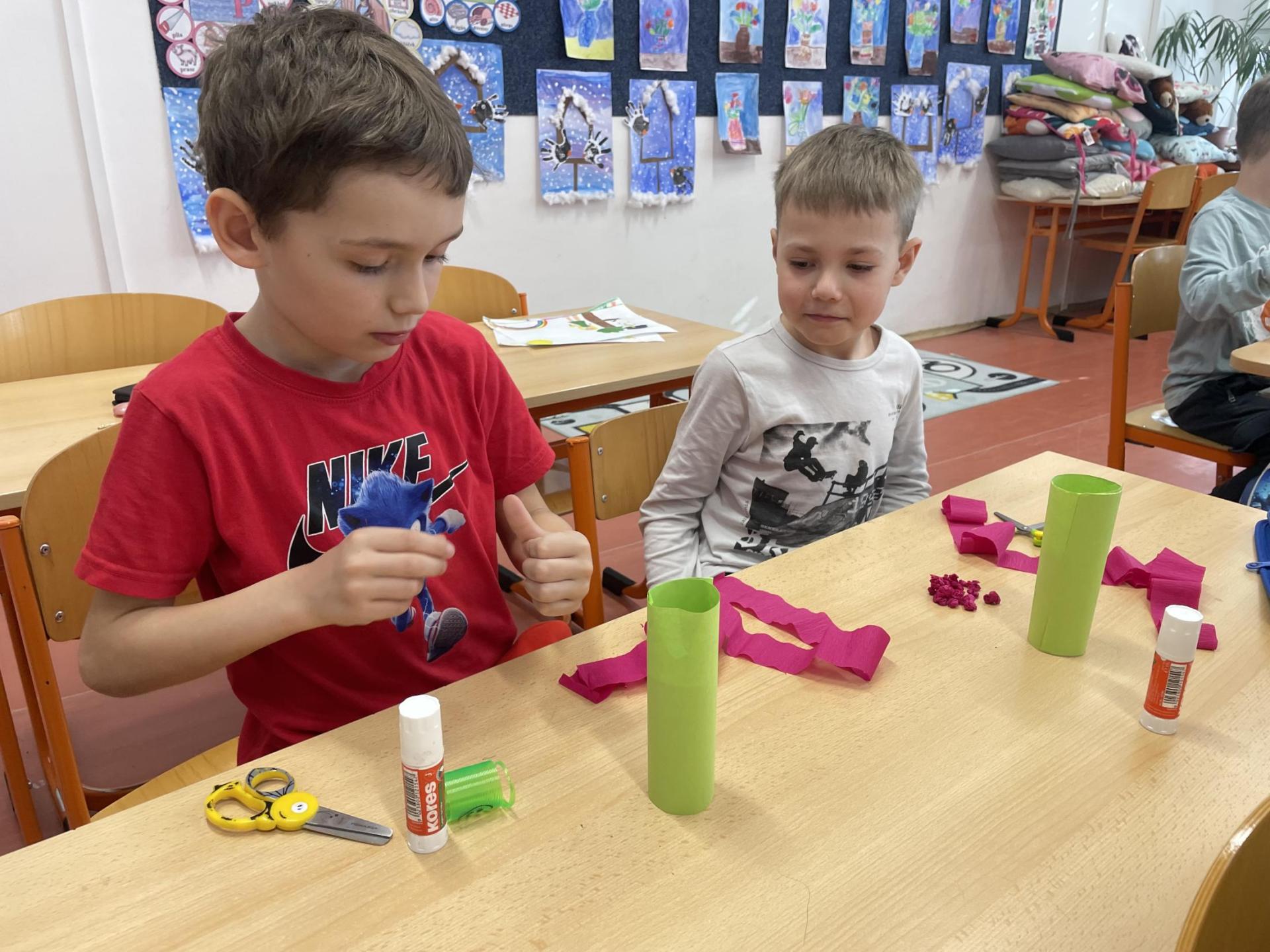 Názvy rostlin si žáci pravidelně upevňovali z plakátů, které jsme měli ve třídě vyvěšené. K lepšímu zapamatování přispělo i výtvarné tvoření – díky tomu teď naši třídu zdobí sněženky, tulipány, hyacinty a dokonce i jedna živá rostlinka – prvosenka jarní (petrklíč).