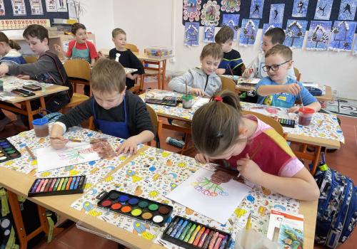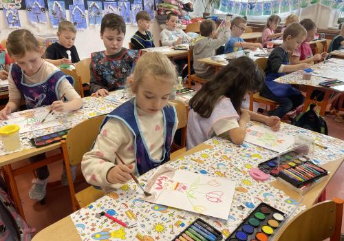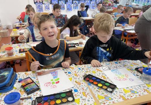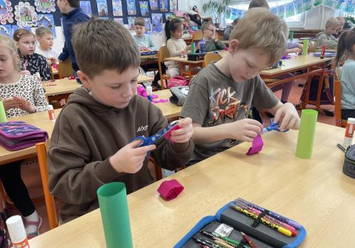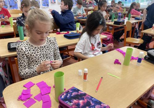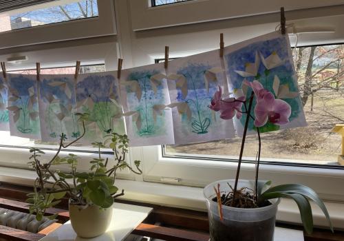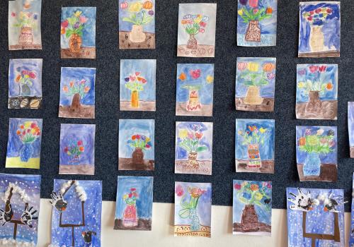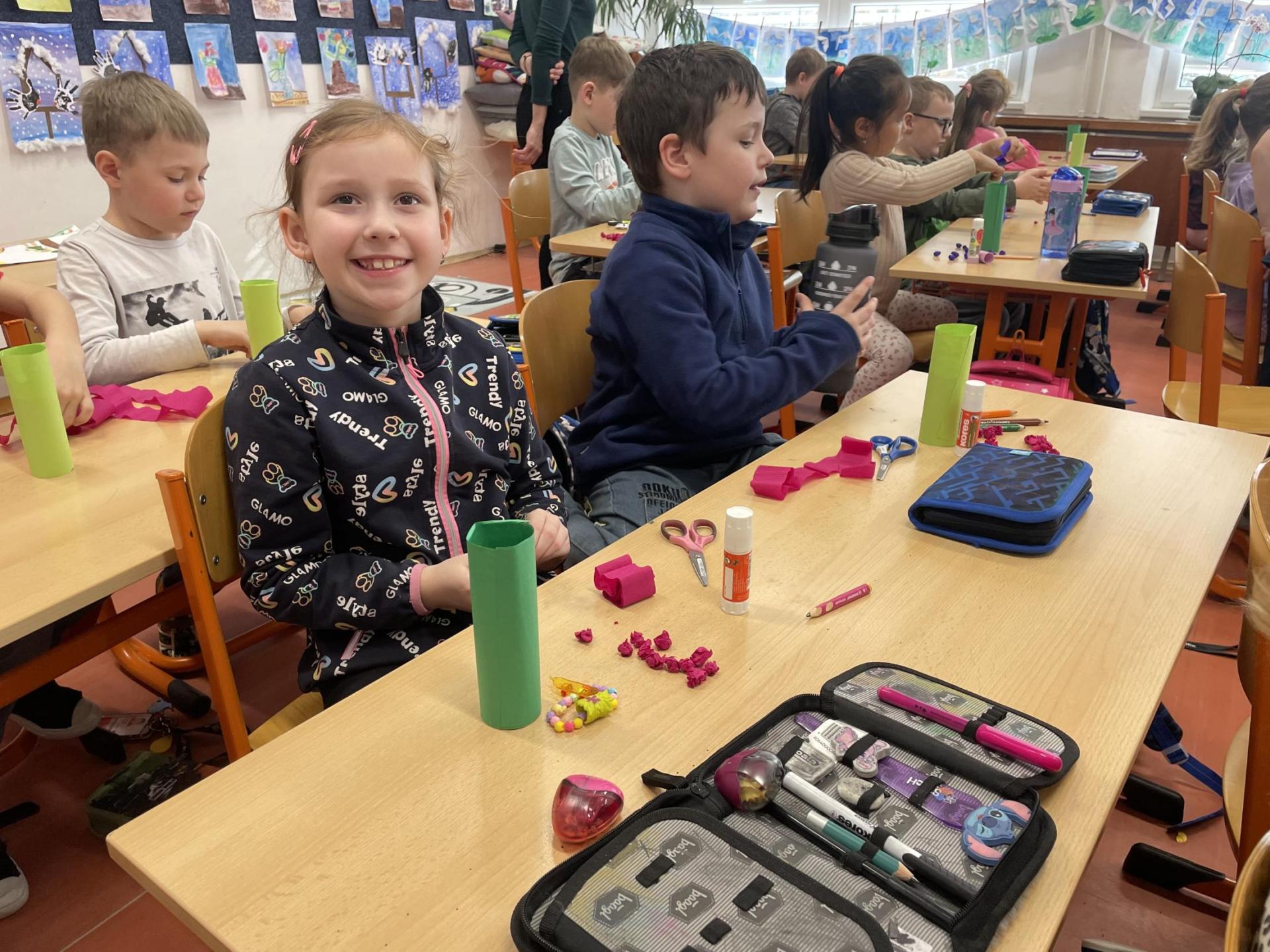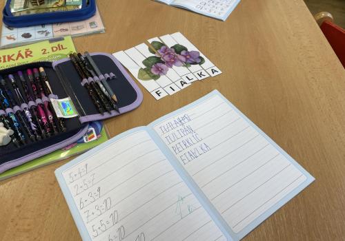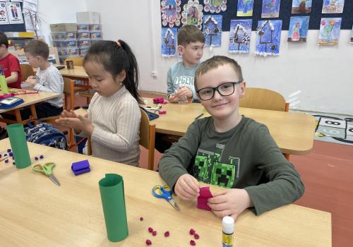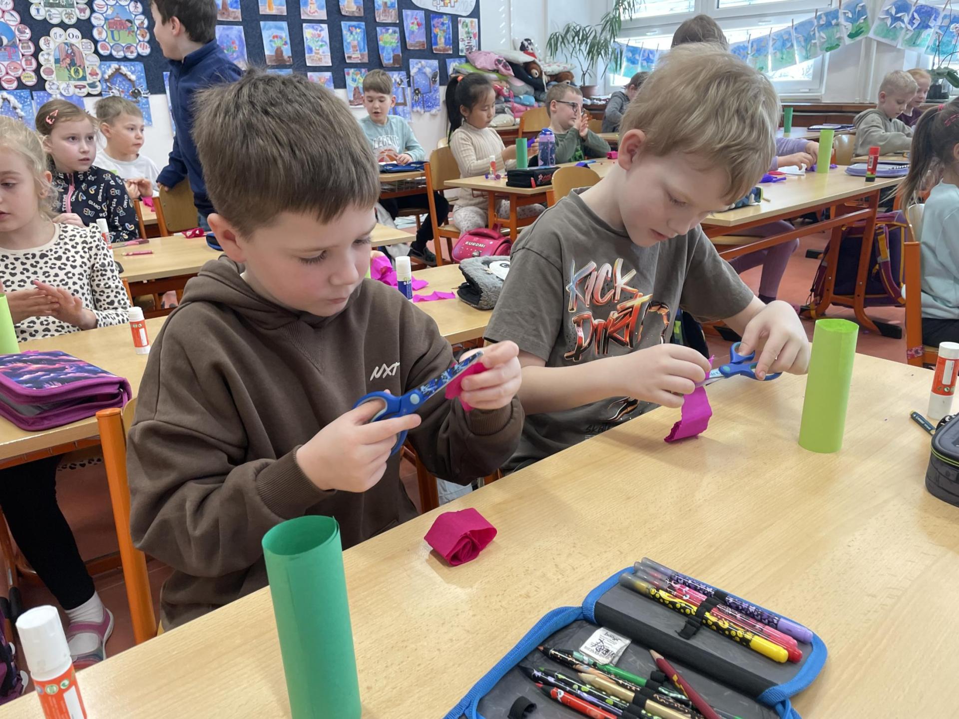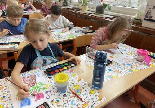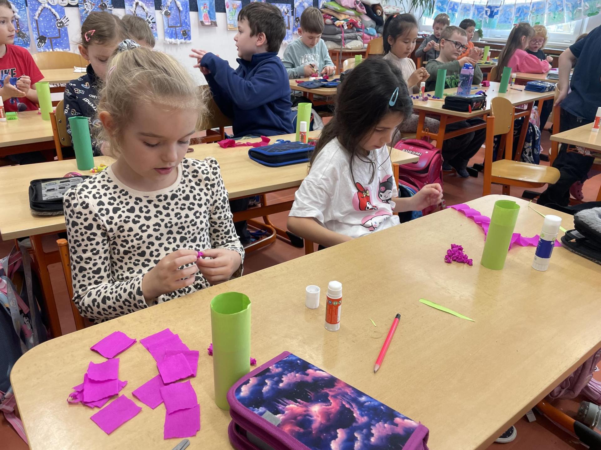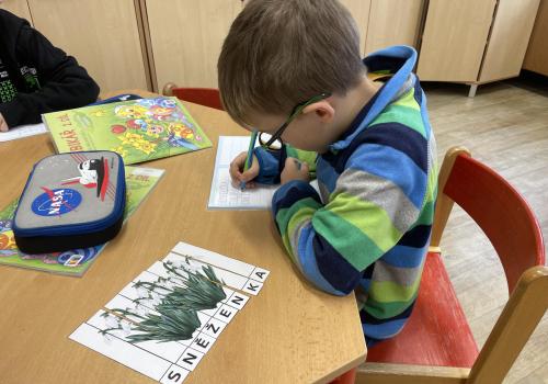 Názvy rostlin si žáci pravidelně upevňovali z plakátů, které jsme měli ve třídě vyvěšené. K lepšímu zapamatování přispělo i výtvarné tvoření – díky tomu teď naši třídu zdobí sněženky, tulipány, hyacinty a dokonce i jedna živá rostlinka – prvosenka jarní (petrklíč).