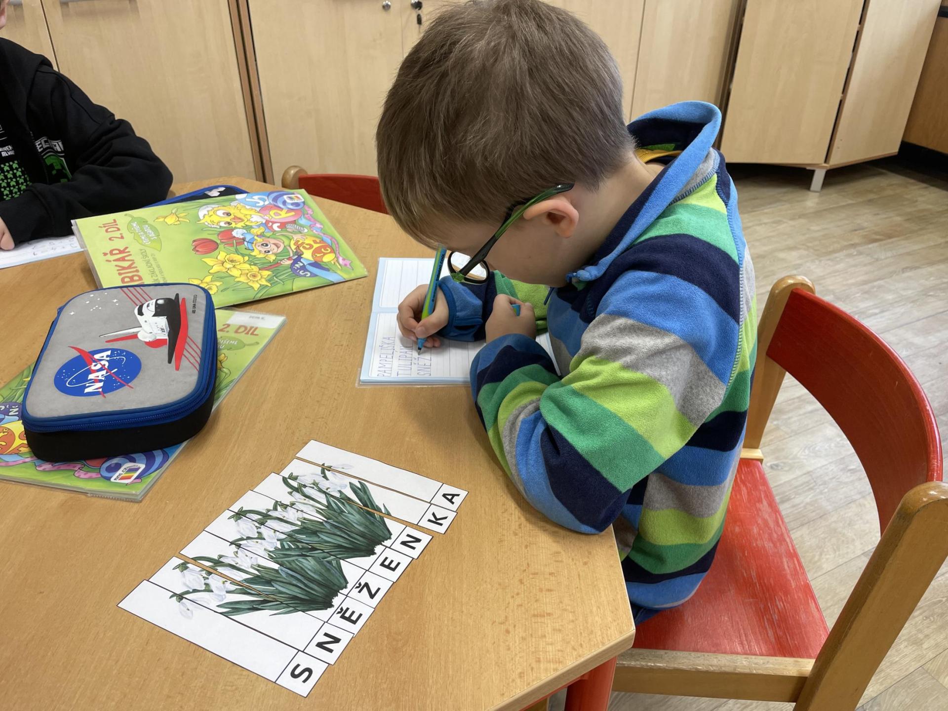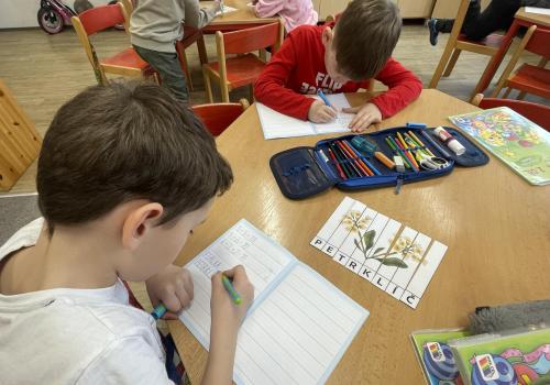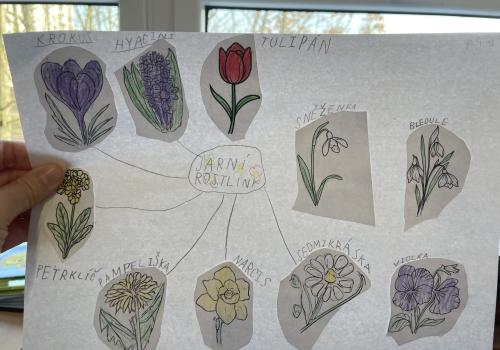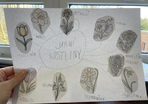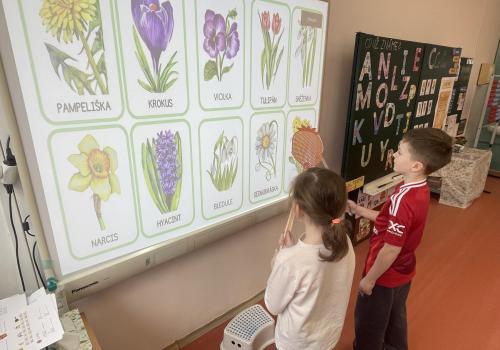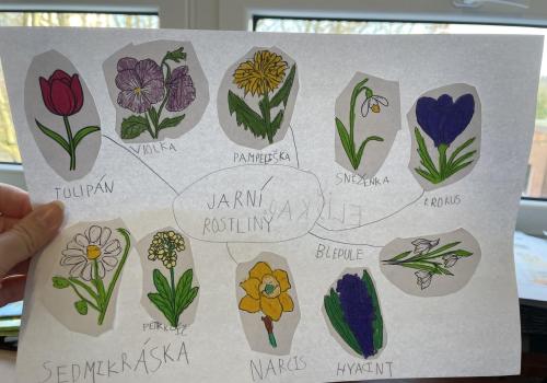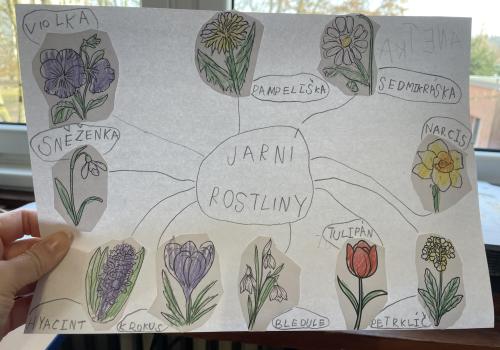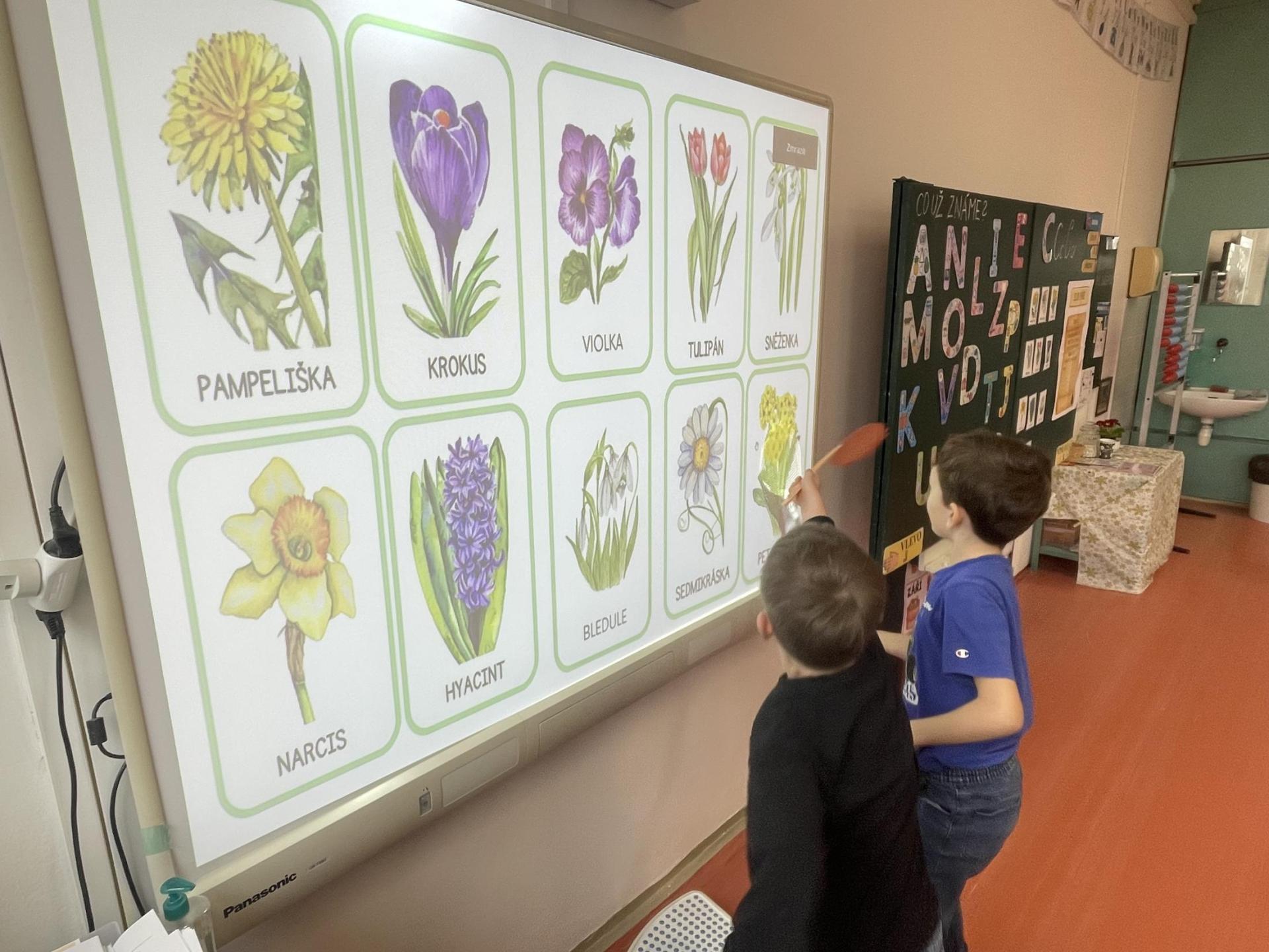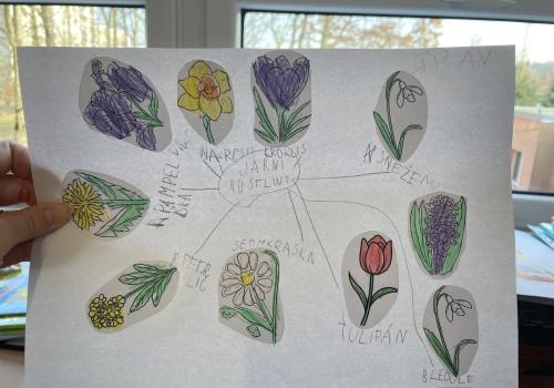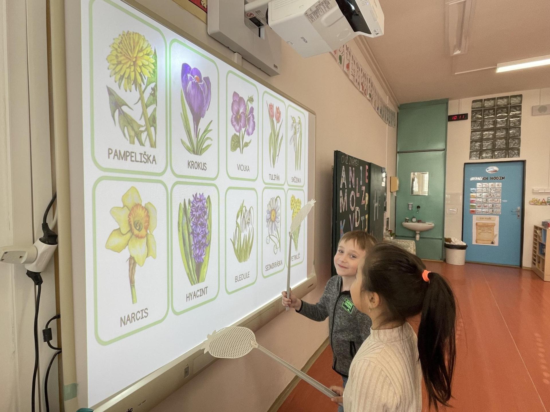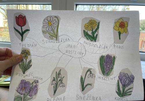 V další části výuky si každý vytvořil vlastní myšlenkovou mapu jarních květin, díky čemuž si procvičil psaní, slovní zásobu, představivost i tvořivost. Své znalosti jsme si upevnili pomocí skládání puzzle jarních rostlin. Zahráli jsme si také zábavnou hru na interaktivní tabuli – úkolem bylo co nejrychleji najít jmenovanou rostlinu a „zasáhnout“ ji plácačkou na mouchy. To byla zábava!