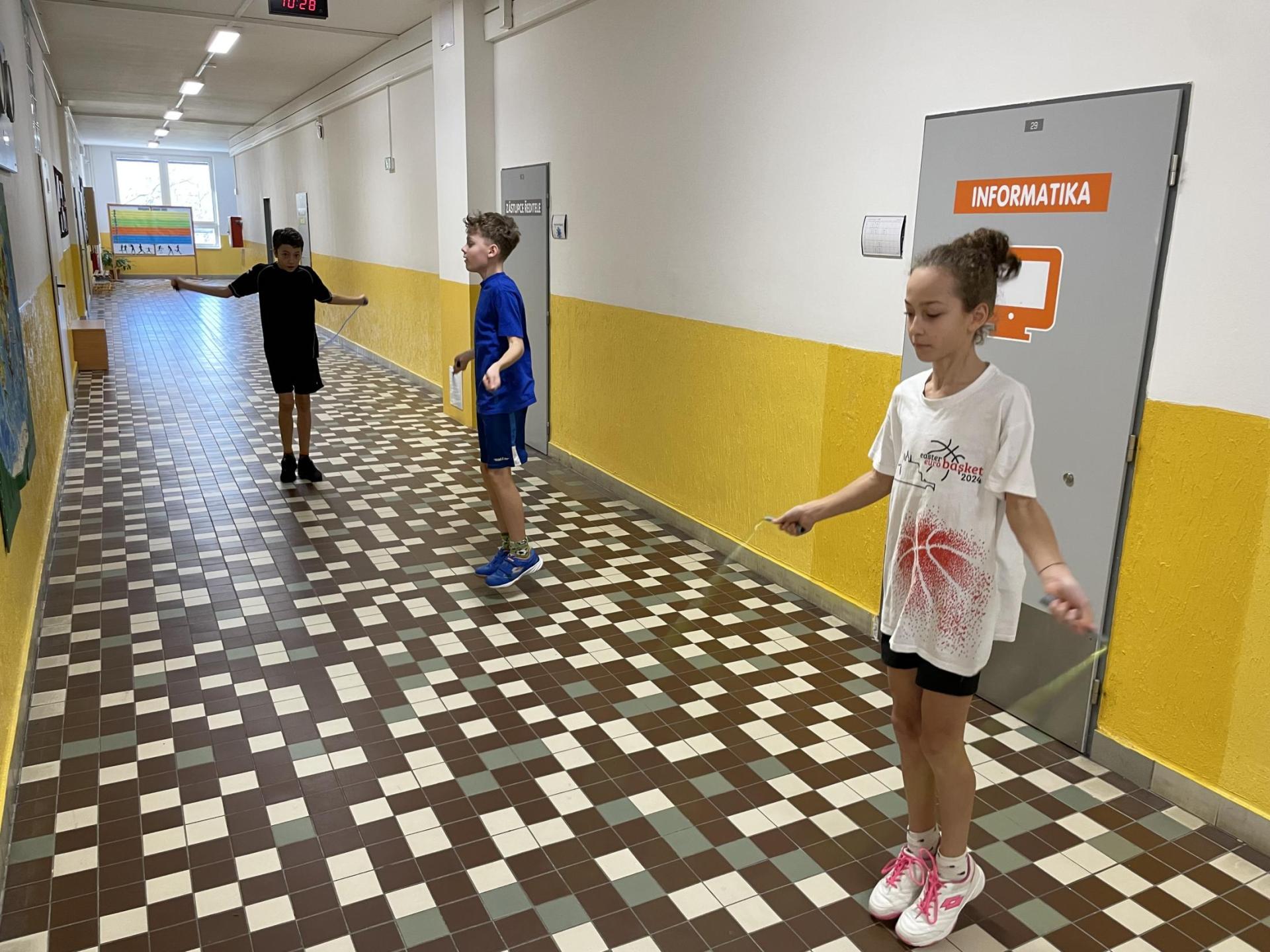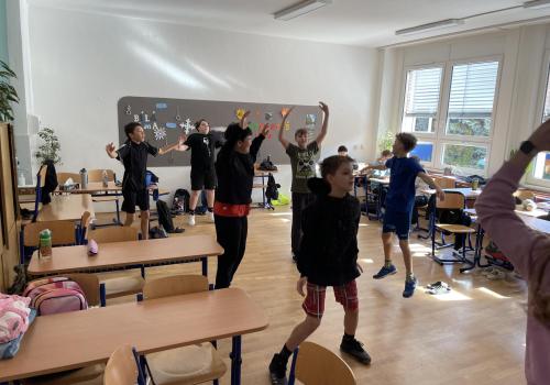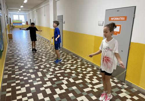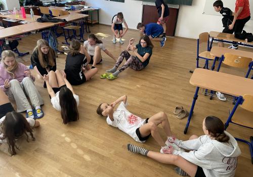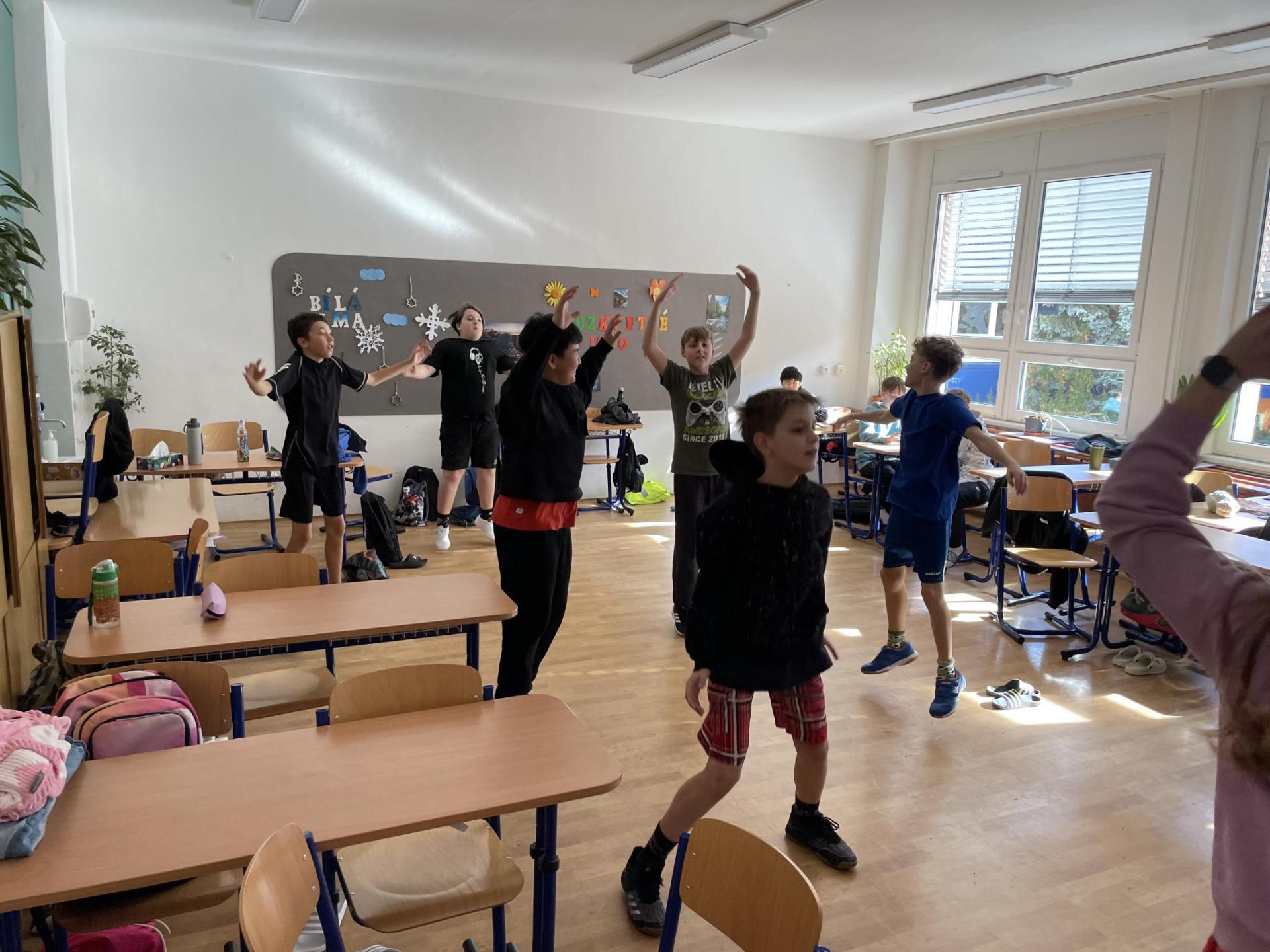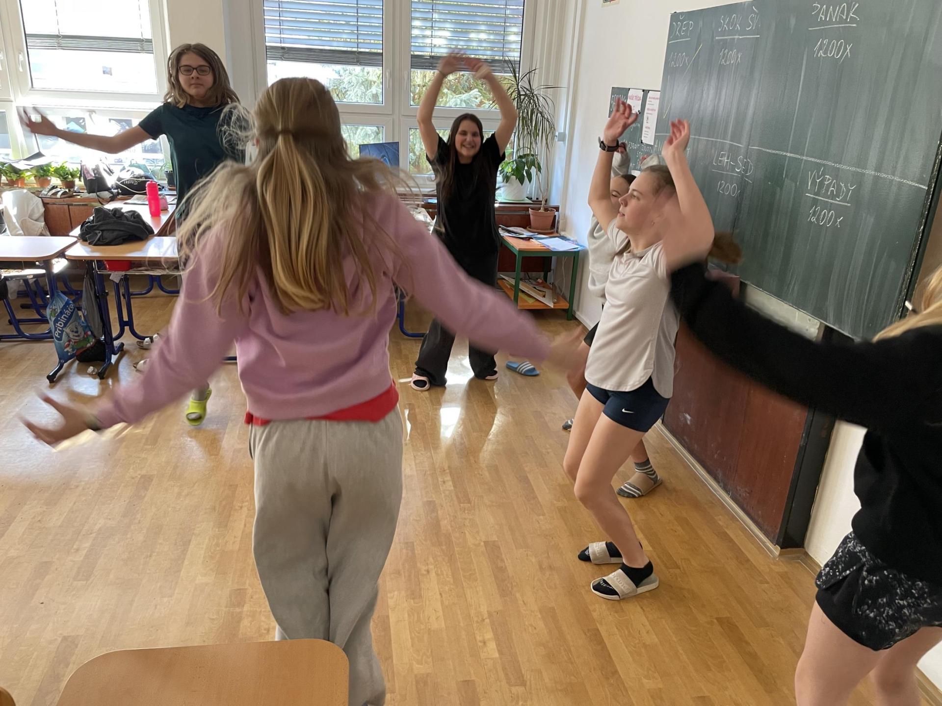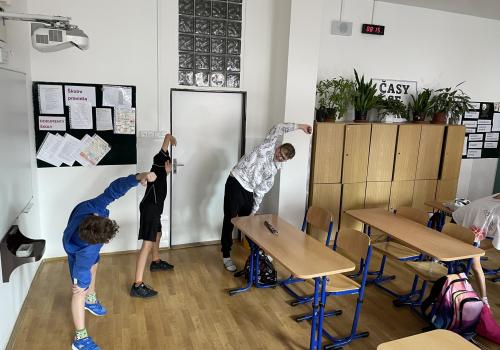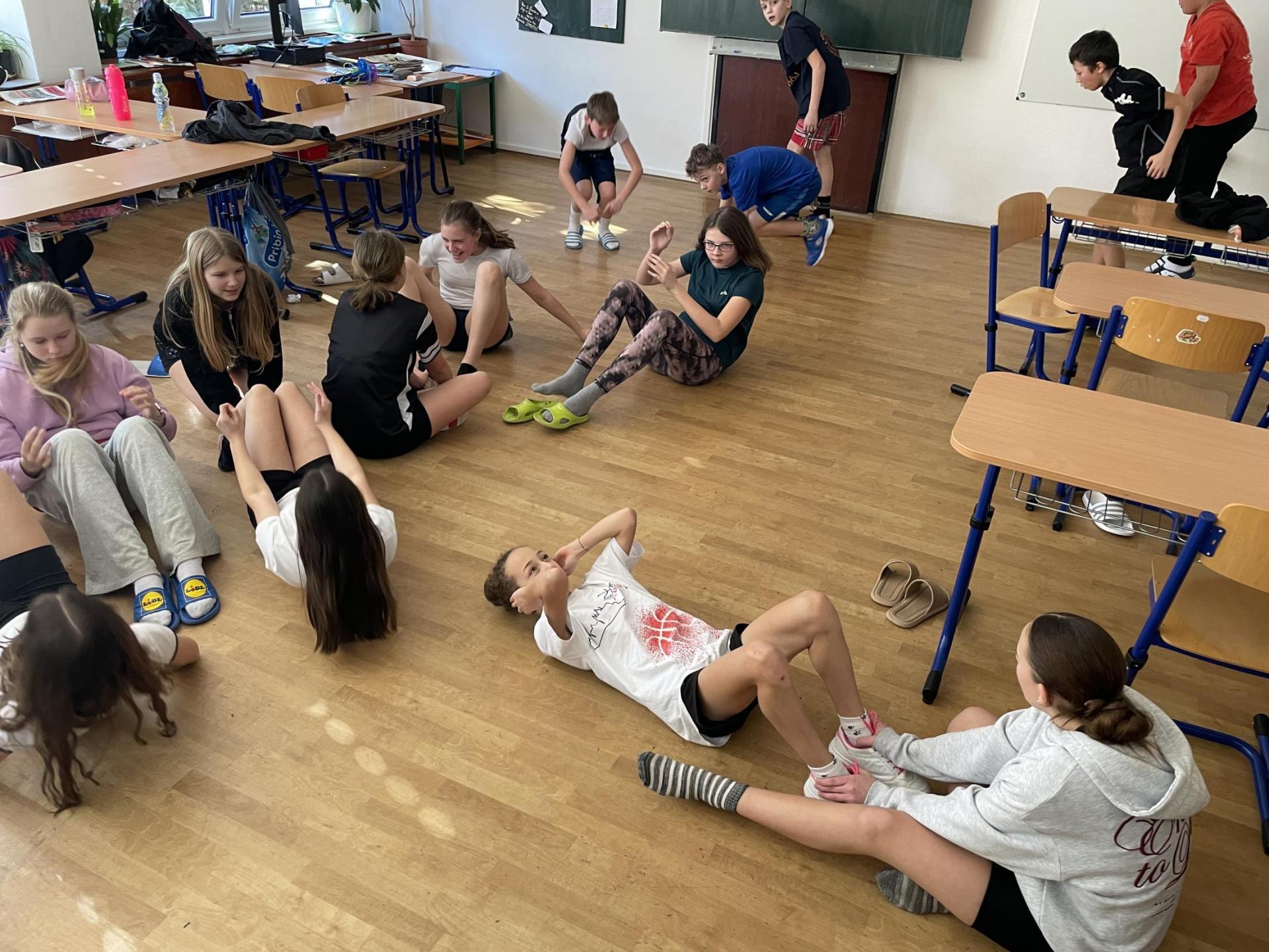 Následovala pohybová výzva, kterou plnili všichni žáci ze třídy (každý něco): 1200x dřepy, 1200x skok přes švihadlo, 1200x výpady, 800x angličáky, 1200x sedy-lehy, 1200x panák.