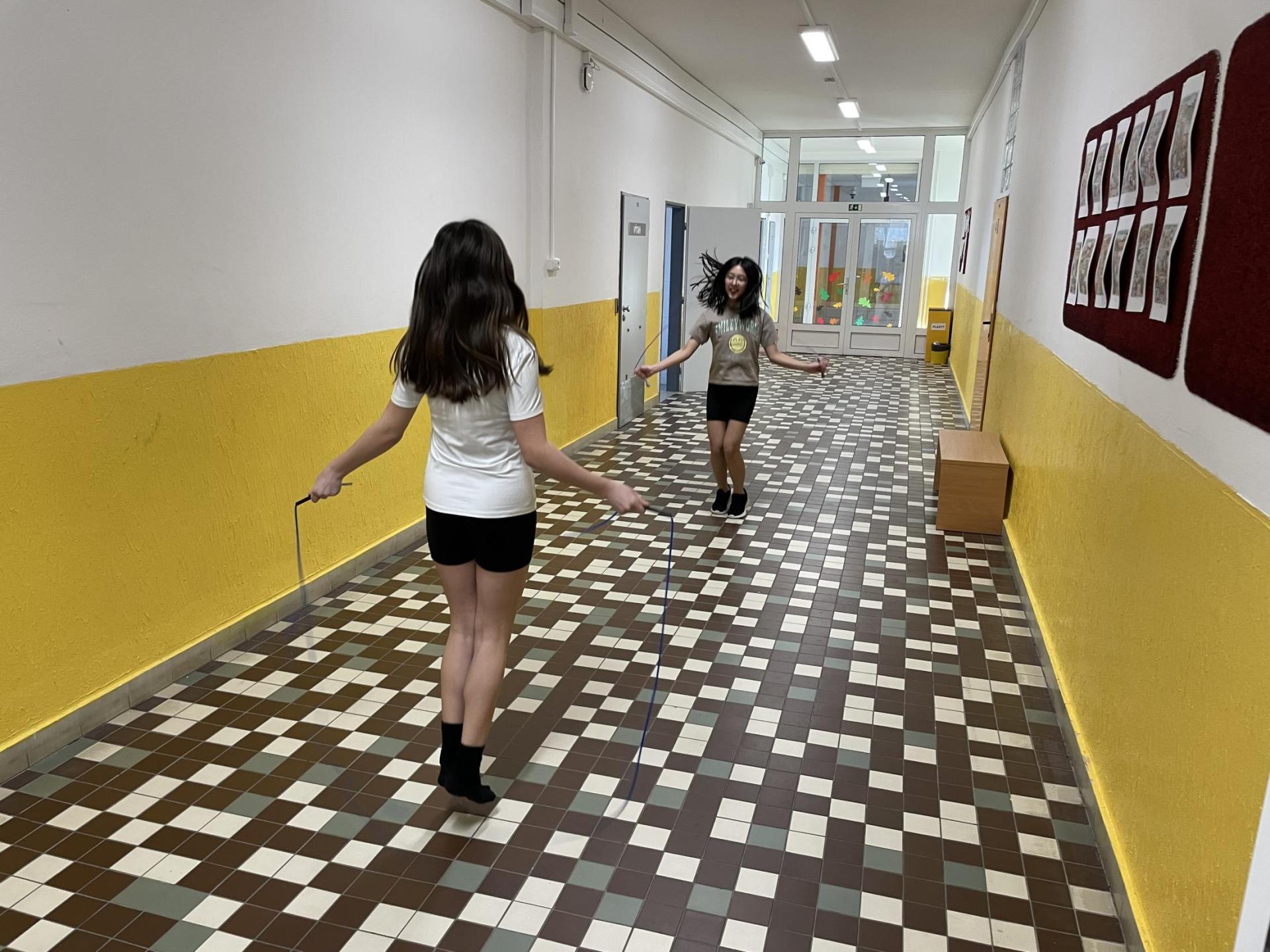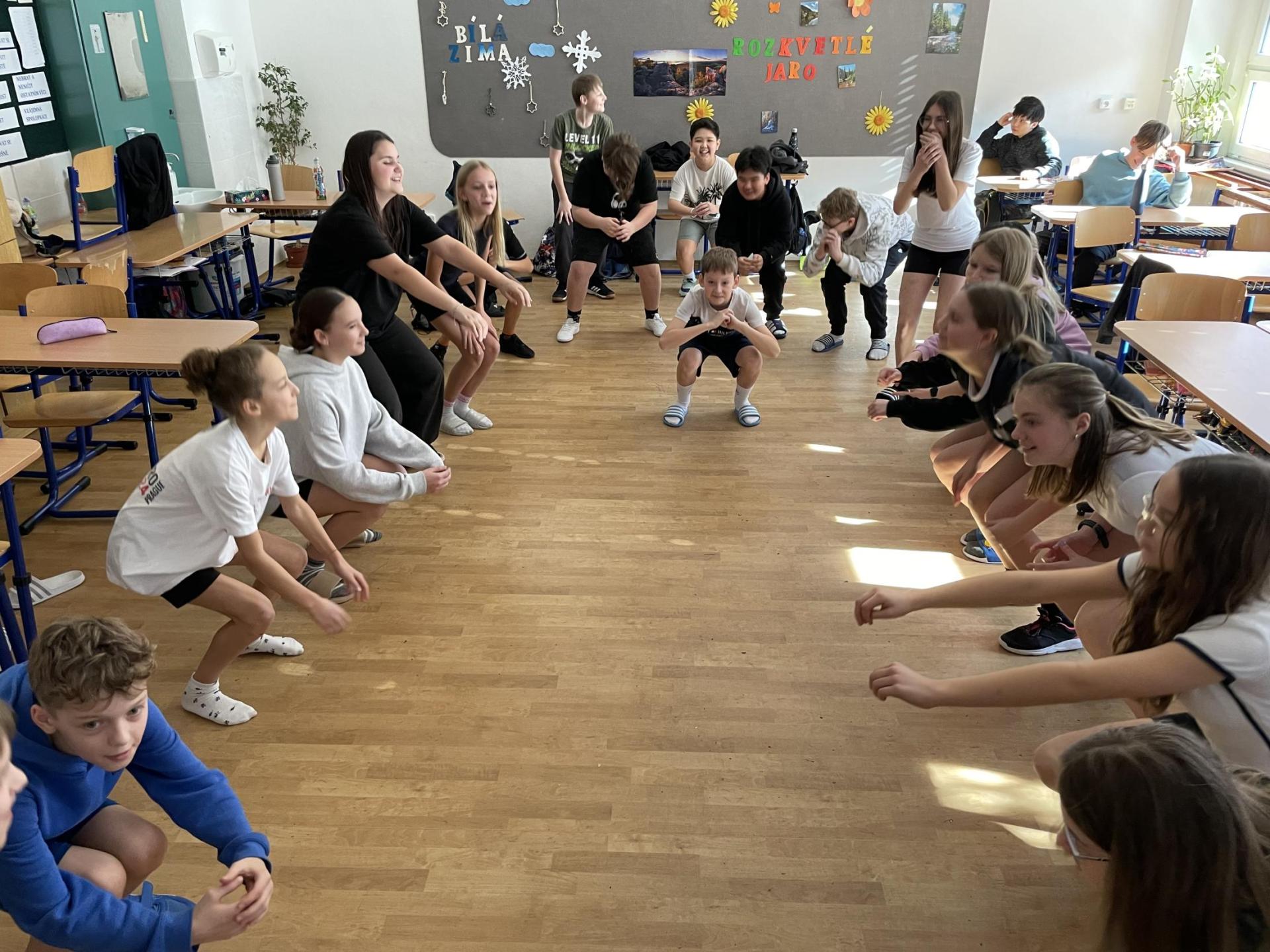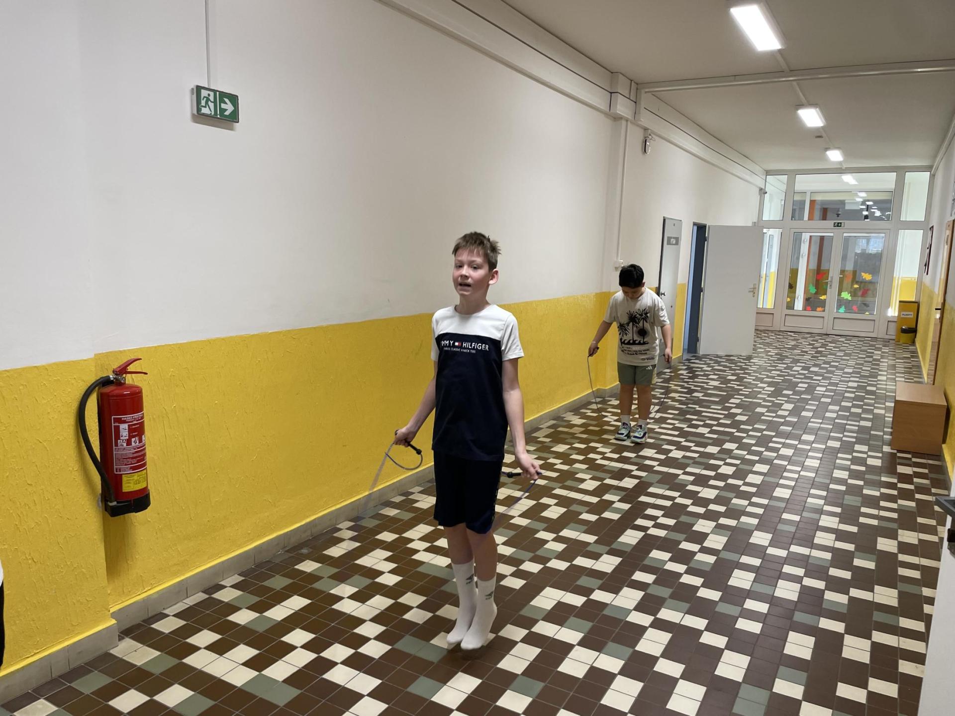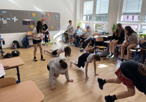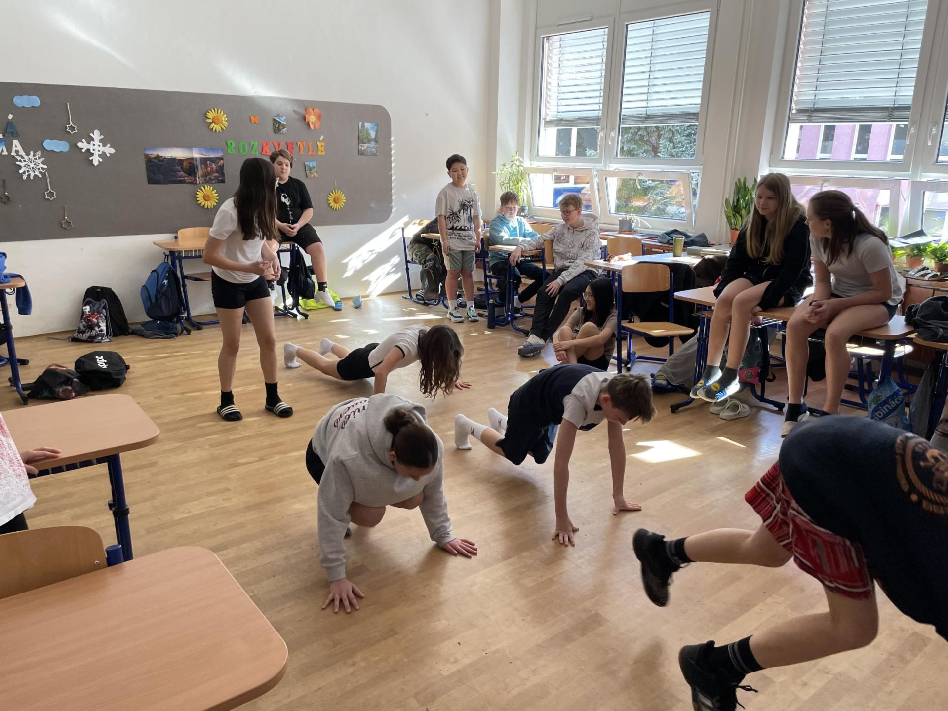 Následovala pohybová výzva, kterou plnili všichni žáci ze třídy (každý něco): 1200x dřepy, 1200x skok přes švihadlo, 1200x výpady, 800x angličáky, 1200x sedy-lehy, 1200x panák.