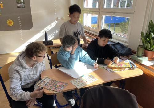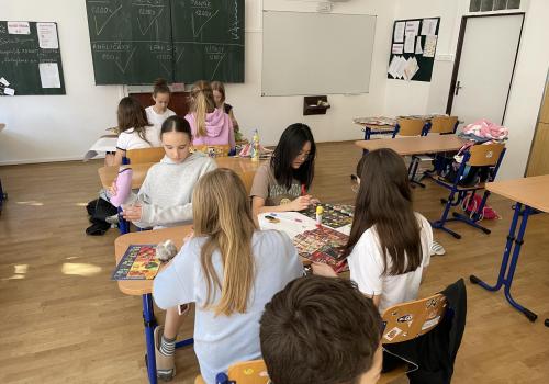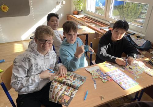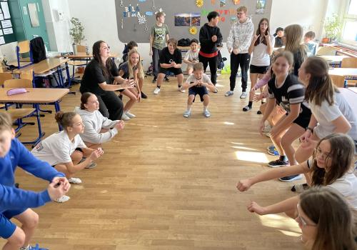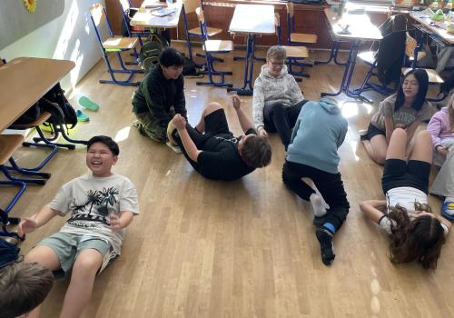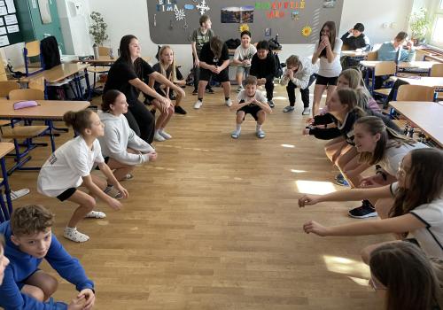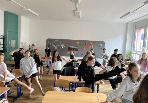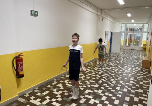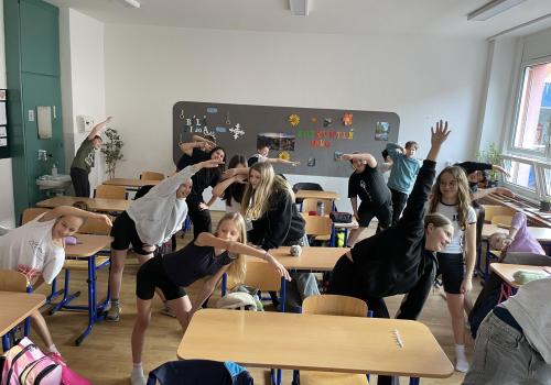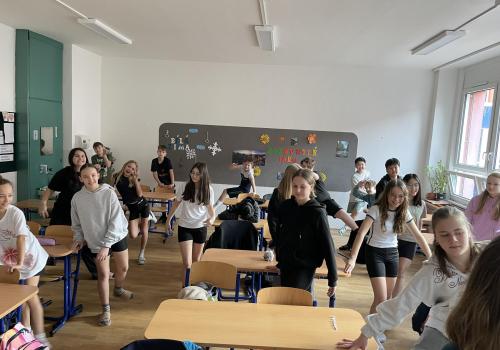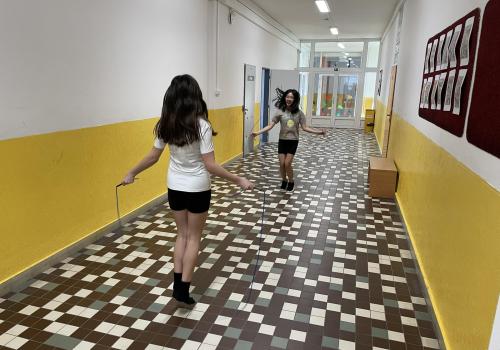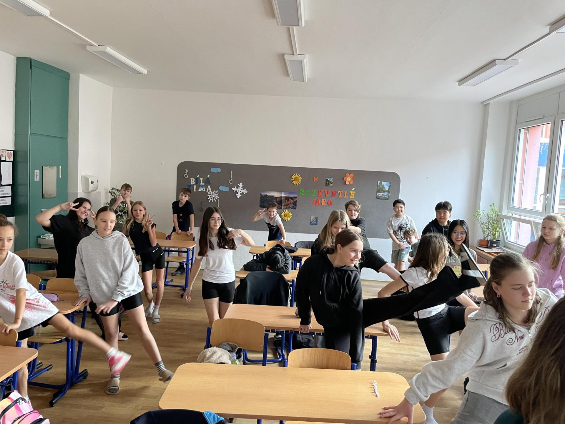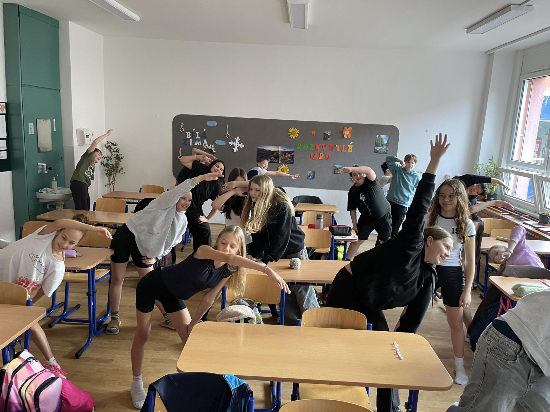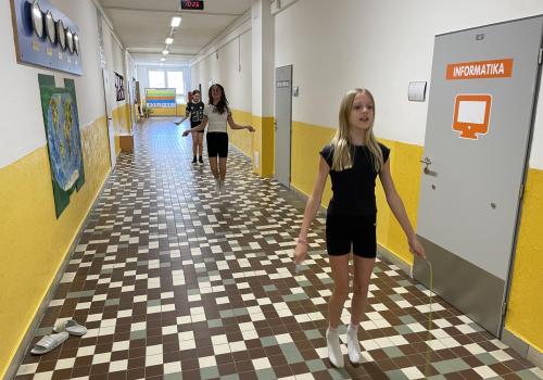 Následovala pohybová výzva, kterou plnili všichni žáci ze třídy (každý něco): 1200x dřepy, 1200x skok přes švihadlo, 1200x výpady, 800x angličáky, 1200x sedy-lehy, 1200x panák.