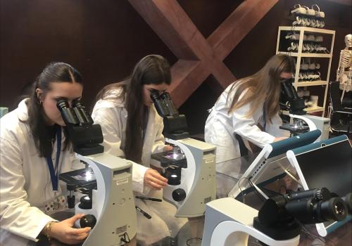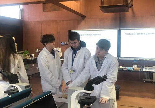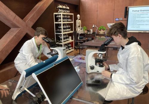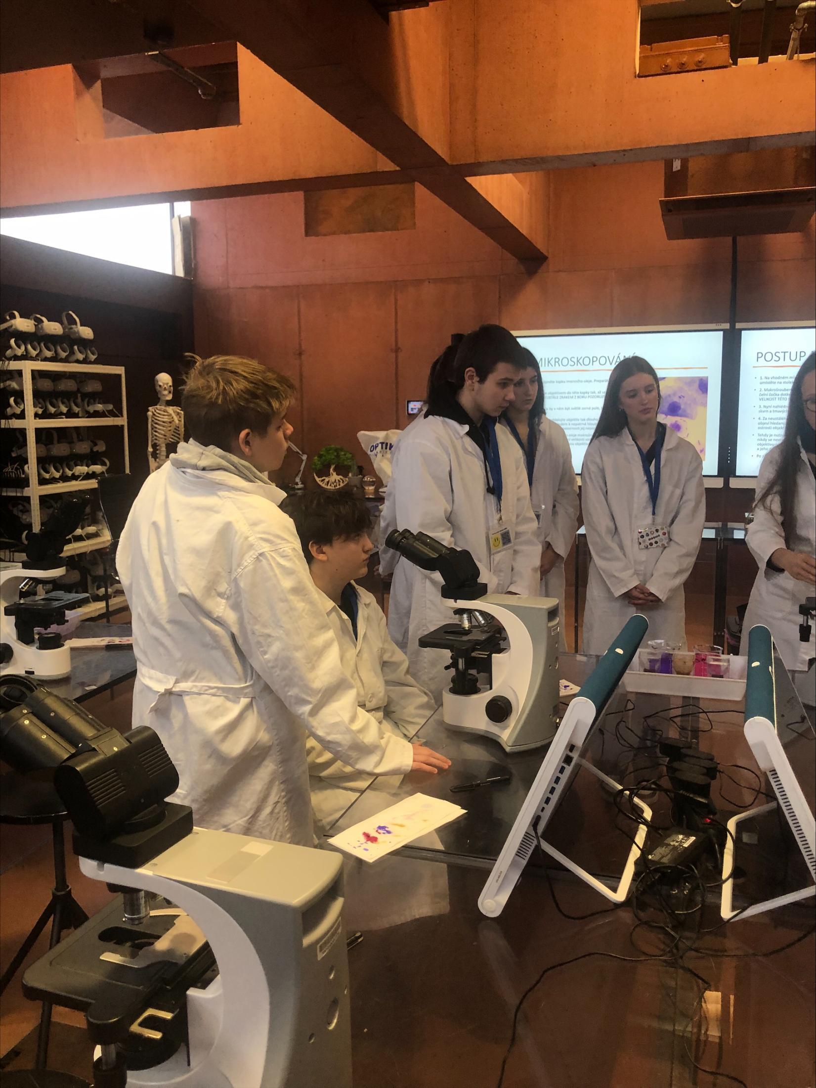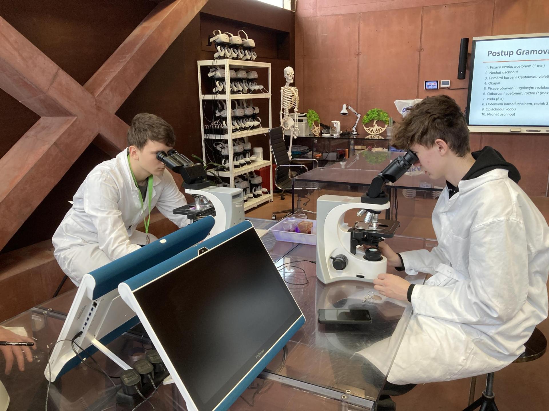 Druhý program byl zaměřený na přírodopis a jmenoval se „Mikrosvět v puse“. Tady jsme se dozvěděli, jak je důležitý mikrobiom, který máme ve střevech. Naše střeva jsou zoologická zahrada, kde žije až 1 kg bakterií. Některé bakterie jsou důležité (pomáhají tvořit vitamíny), jiné jsou škodlivé (vedou k nemocem). Naše strava ovlivňuje, které bakterie ve střevech budeme mít. Mikrobiom stimuluje imunitní systém a nerovnováha vede k nemocem. Pomocí Gramova barvení jsme pod mikroskopem pozorovali obsah ústní dutiny. Dozvěděli jsme se, že koky jsou kolečka a bacily tyčinky, a že bakterie jsou větší než viry.