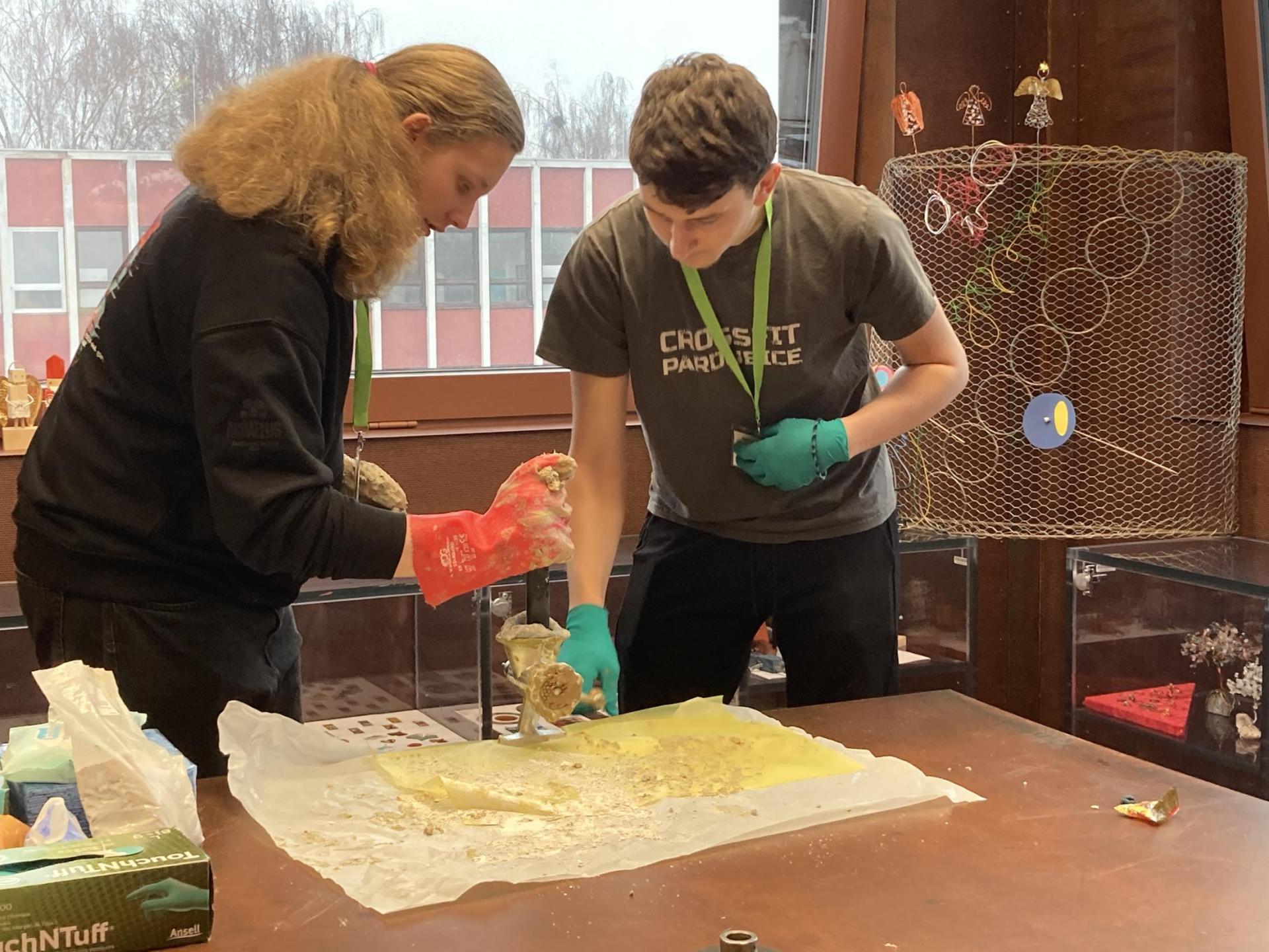 Zkusili jsme si dát kaučuk na ruku. Zjistili jsme, že více vulkanizačního činidla nám zajistí větší pevnost gumy. Dozvěděli jsme se, že do těsnění se dává kovová kostra, aby držela tvar. Plachta se vyrábí tak, že se textil namočí do latexu. Protože plast nevede elektřinu, používá se např. na rukojeti šroubováků.