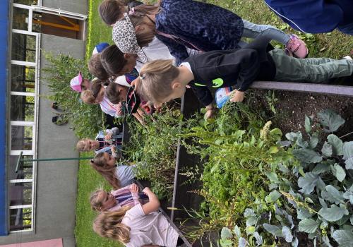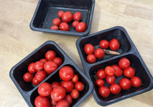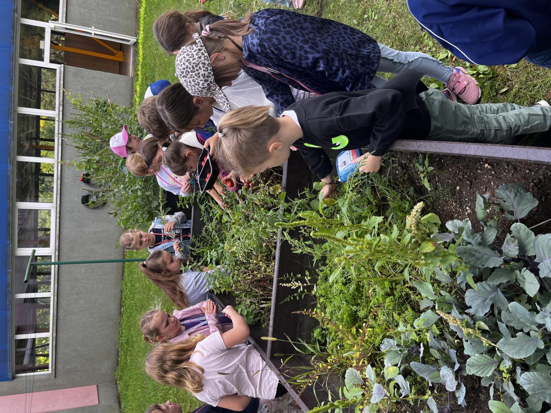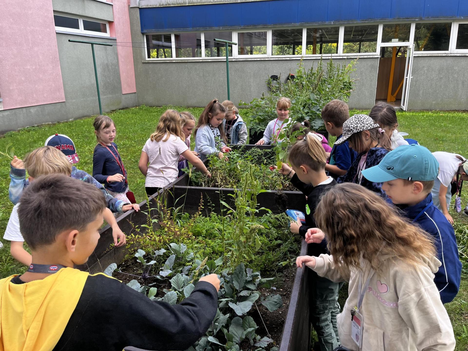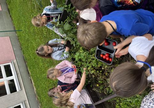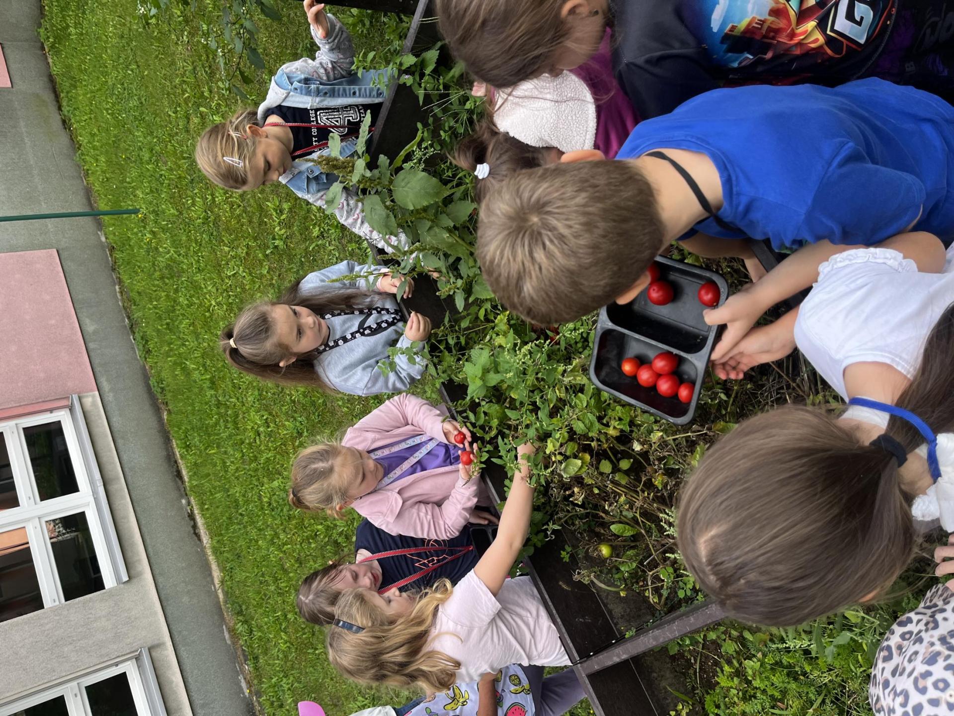 Přes prázdniny nám záhon trochu zarost, ale my jsme se o něj postarali a sklidili spoustu krásně červených rajčátek.