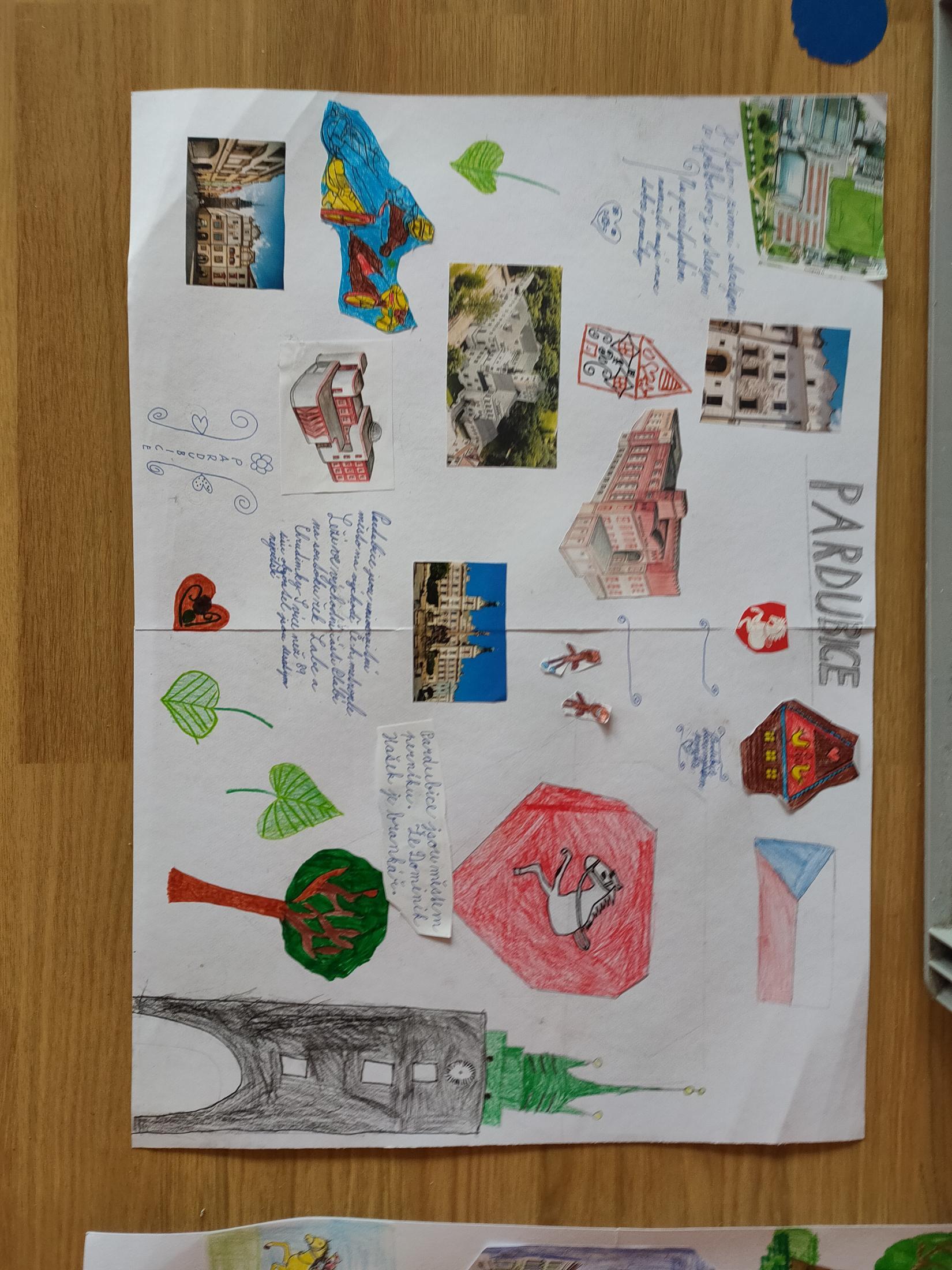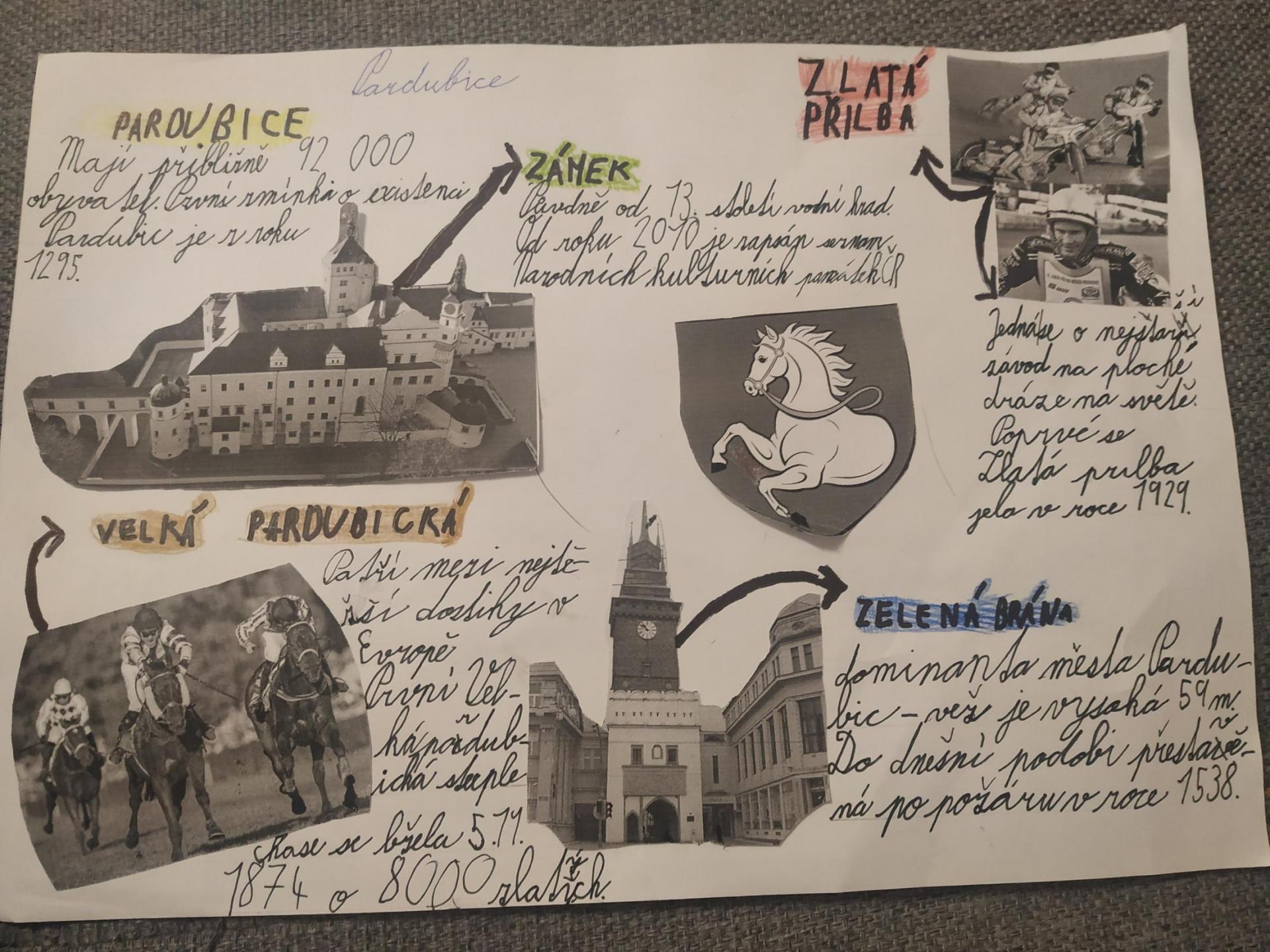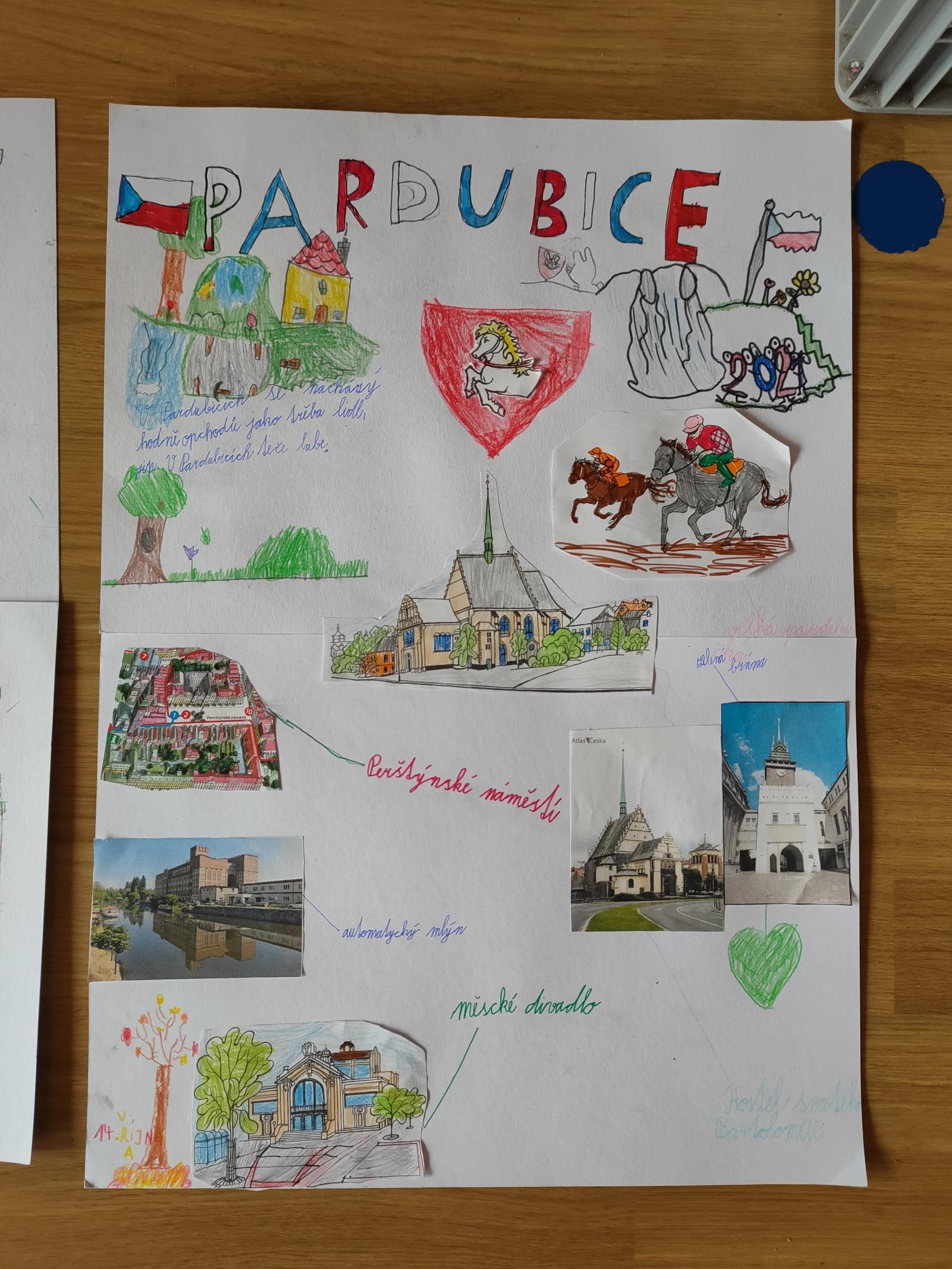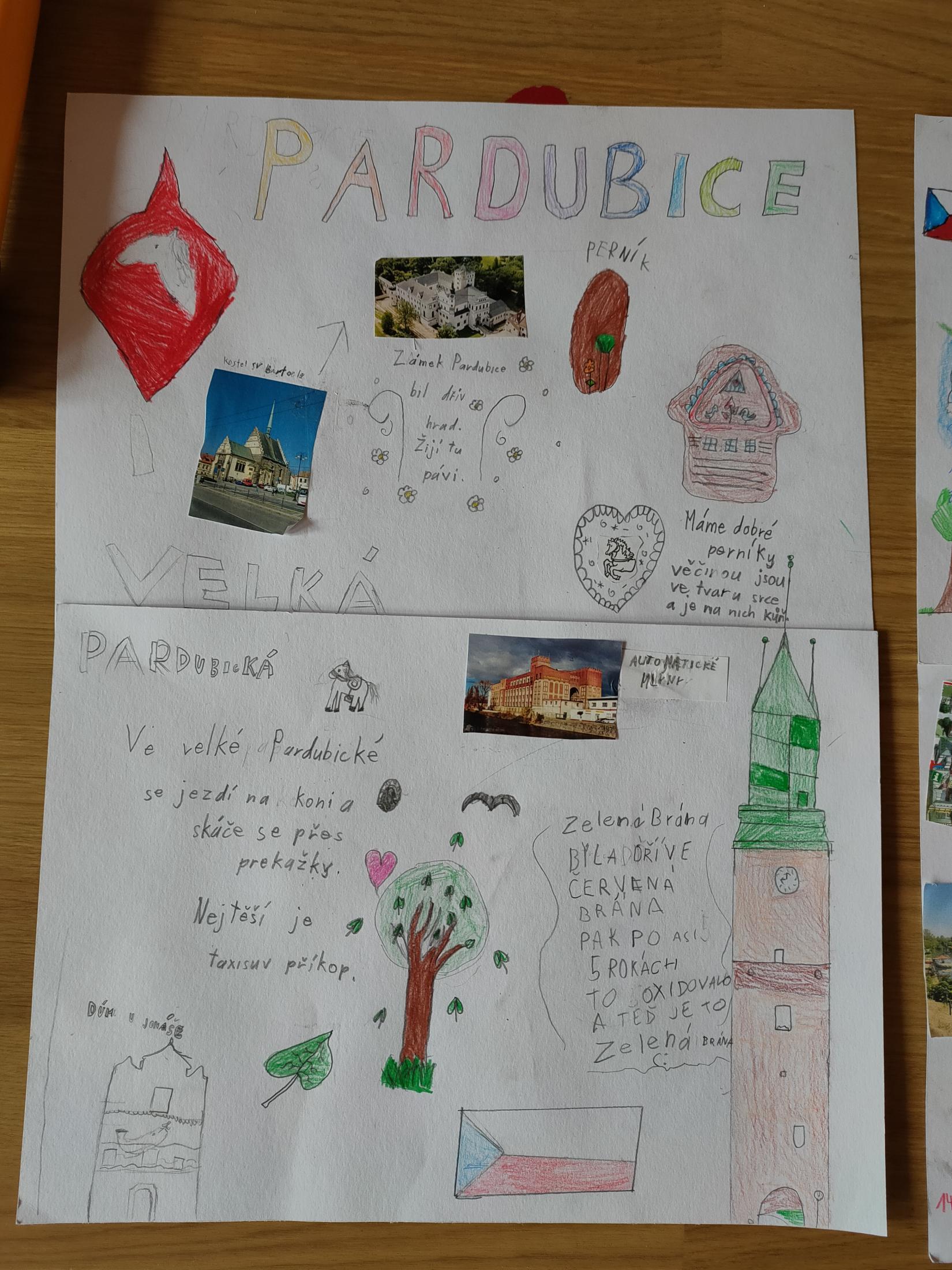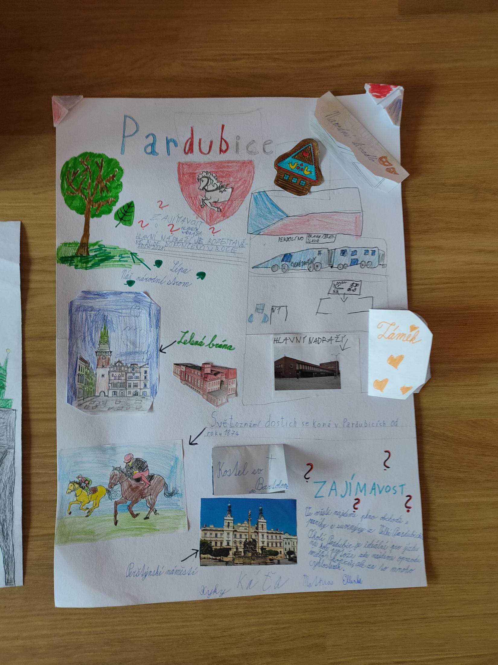 Učíme se spolupracovat. Ve skupinkách jsme vytvářeli plakáty o Pardubicích, vyhledávali informace a kreslili obrázky. Moc se nám to povedlo! Doma v karanténě to ve skupině moc nešlo, ale i tak jsme to zvládli.