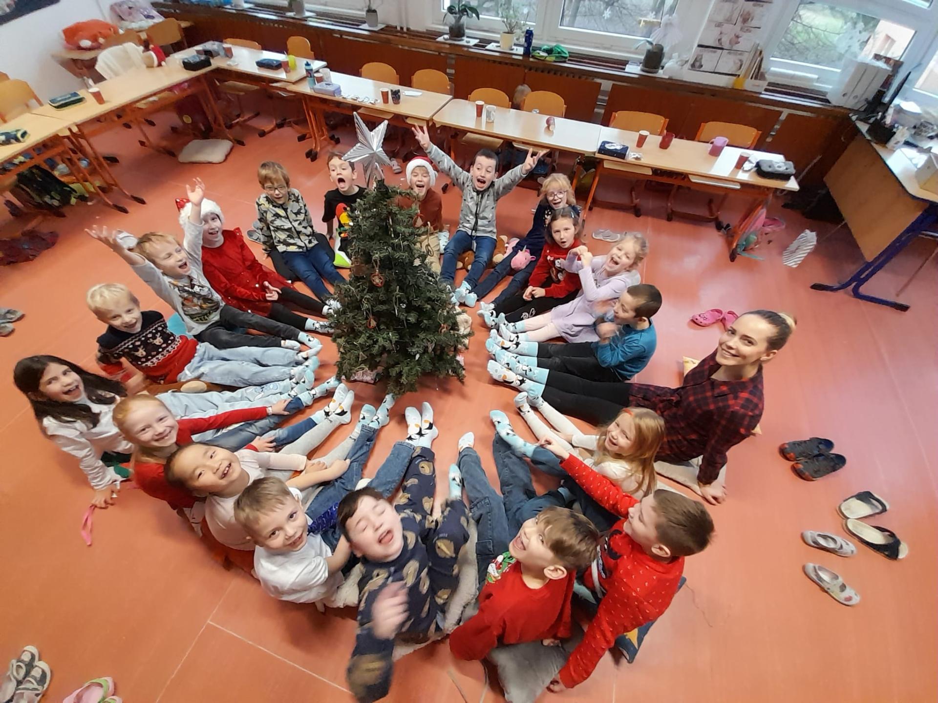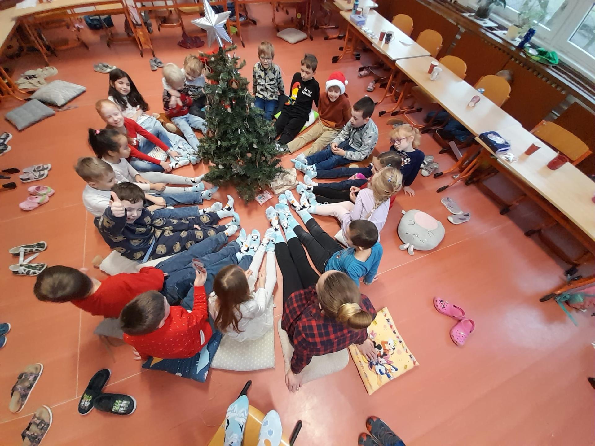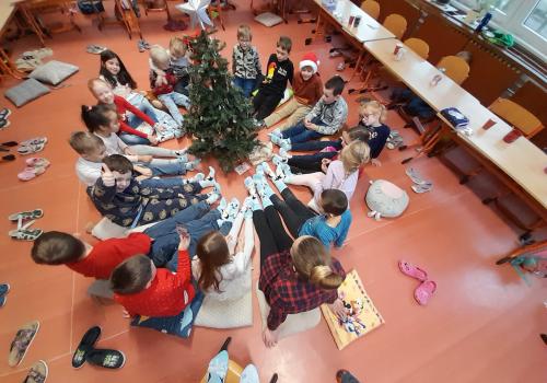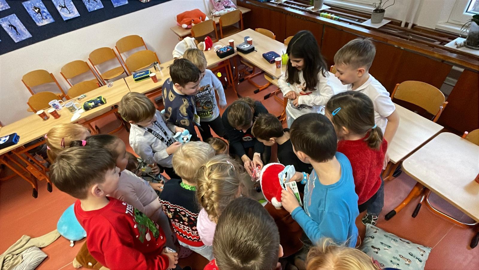 Každý si rozbalil svůj balíček, ale nakonec jsme zjistili, že máme jeden velký společný dárek – vánoční ponožky pro celou třídu. Čekaly tam na nás také dřevěná písmenka a slabičná hra, které určitě využijeme při společných aktivitách. Děkujeme, Ježíšku! Už teď se těšíme na příští rok.