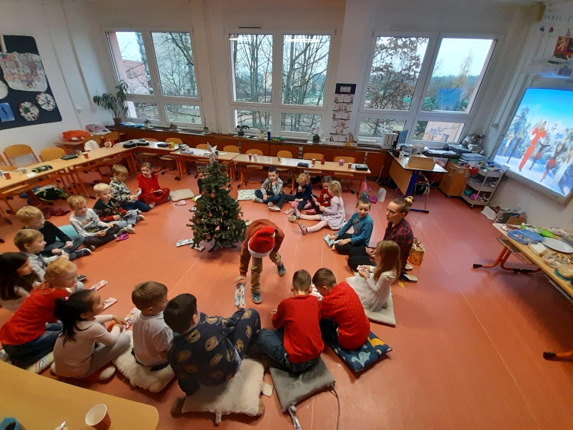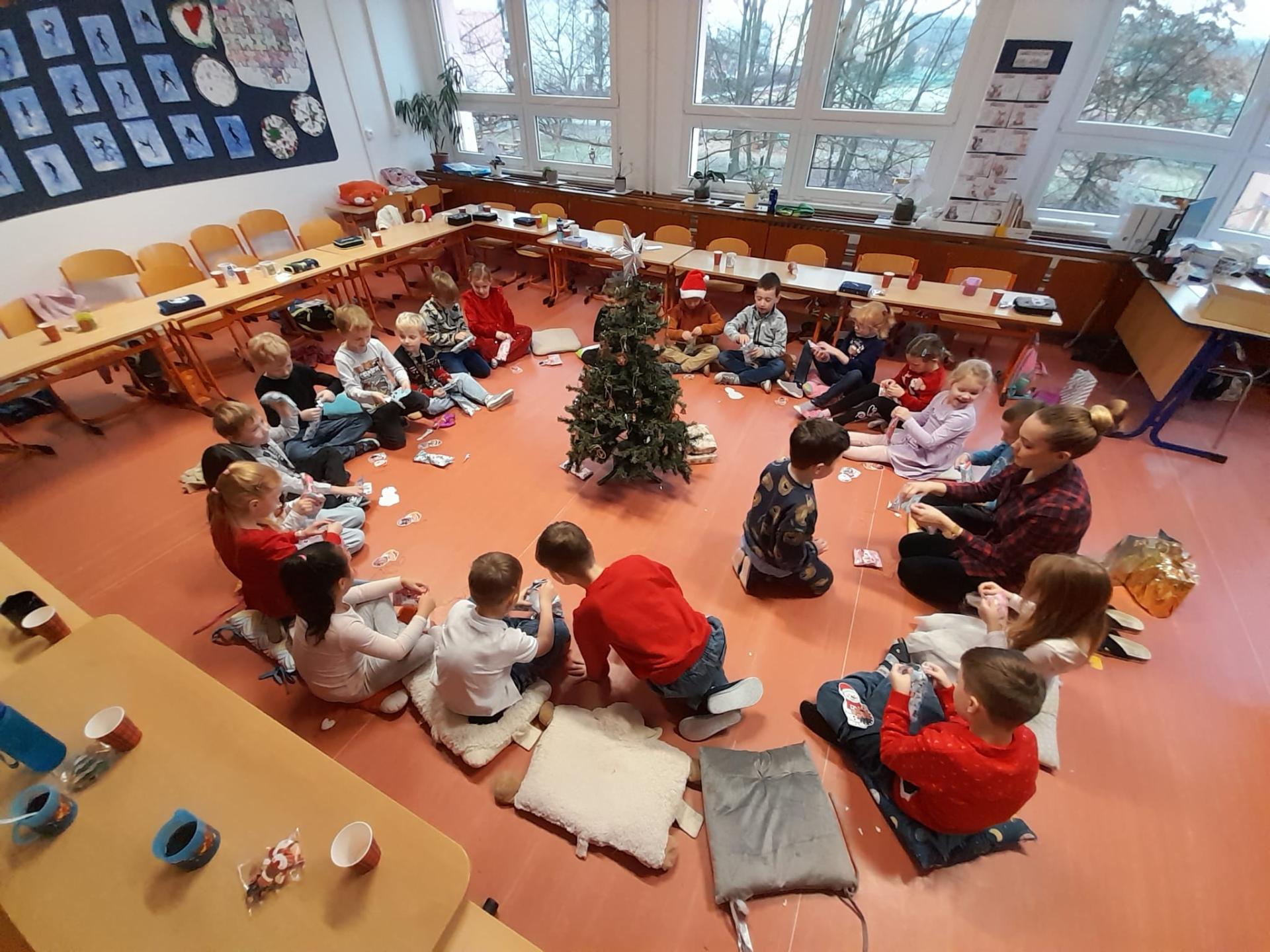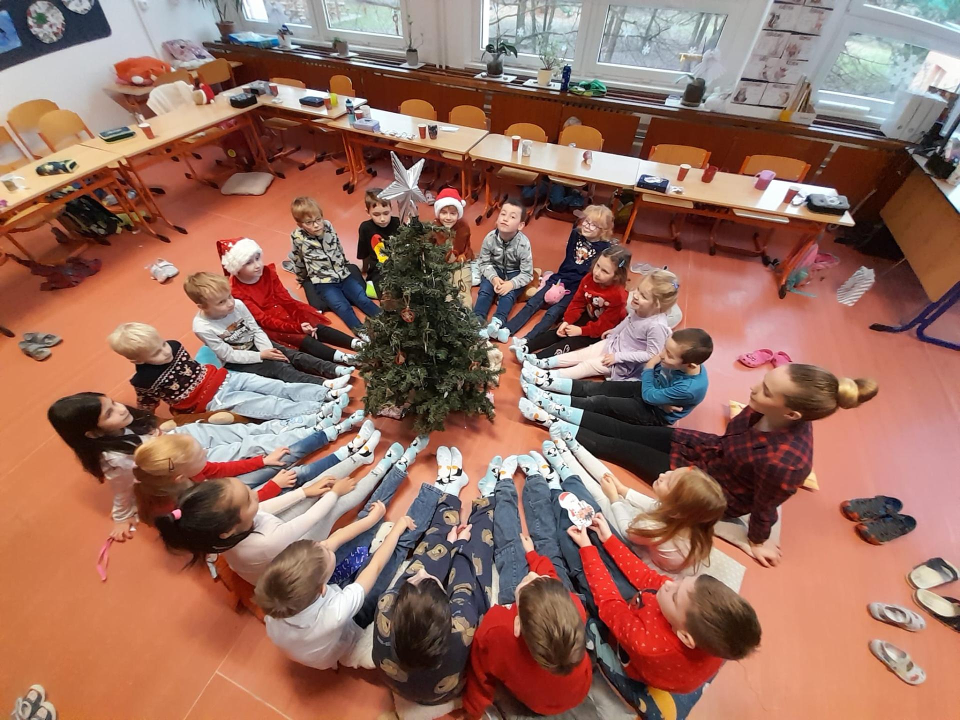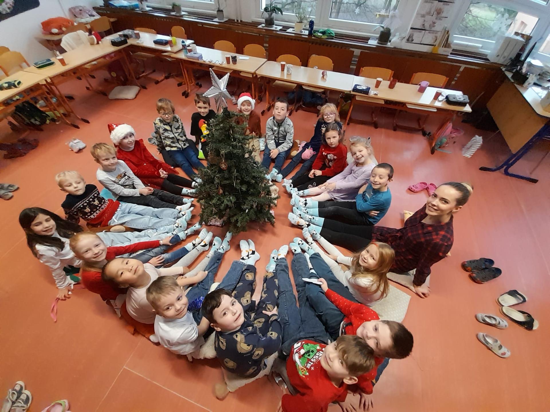 Každý si rozbalil svůj balíček, ale nakonec jsme zjistili, že máme jeden velký společný dárek – vánoční ponožky pro celou třídu. Čekaly tam na nás také dřevěná písmenka a slabičná hra, které určitě využijeme při společných aktivitách. Děkujeme, Ježíšku! Už teď se těšíme na příští rok.