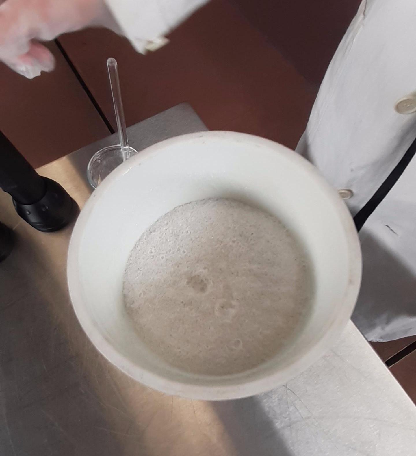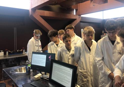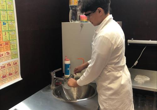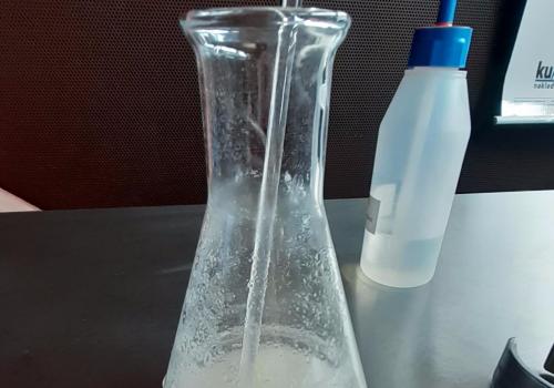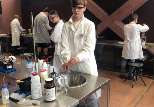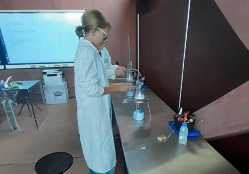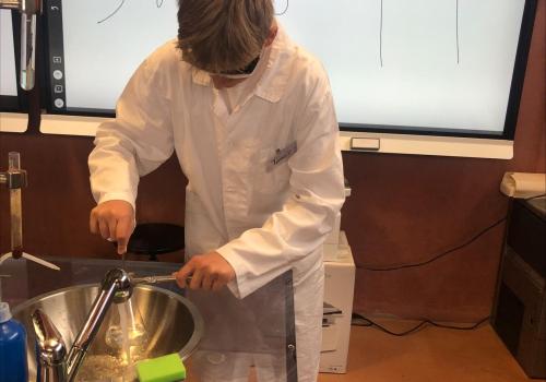 Čekala nás opravdová laboratorní práce – rušená krystalizace. Všichni si oblékli pláště, vzali brýle a rukavice. Připravili si laboratorní nádobí, odvážili kyselinu salicylovou a rozpustili ji ve vodě. Vzniklou suspenzi zahřívali do úplného rozpuštění. Z roztoku se ochlazením pod studenou vodou vyloučily malé krystaly, které jsme odsáli na Büchnerově nálevce filtrací za sníženého tlaku. Dozvěděli jsme se o fluorescenci a vyzkoušeli si práci s UV baterkou a UV lampou. Krásně nám svítily bílé pláště i připravené krystaly.