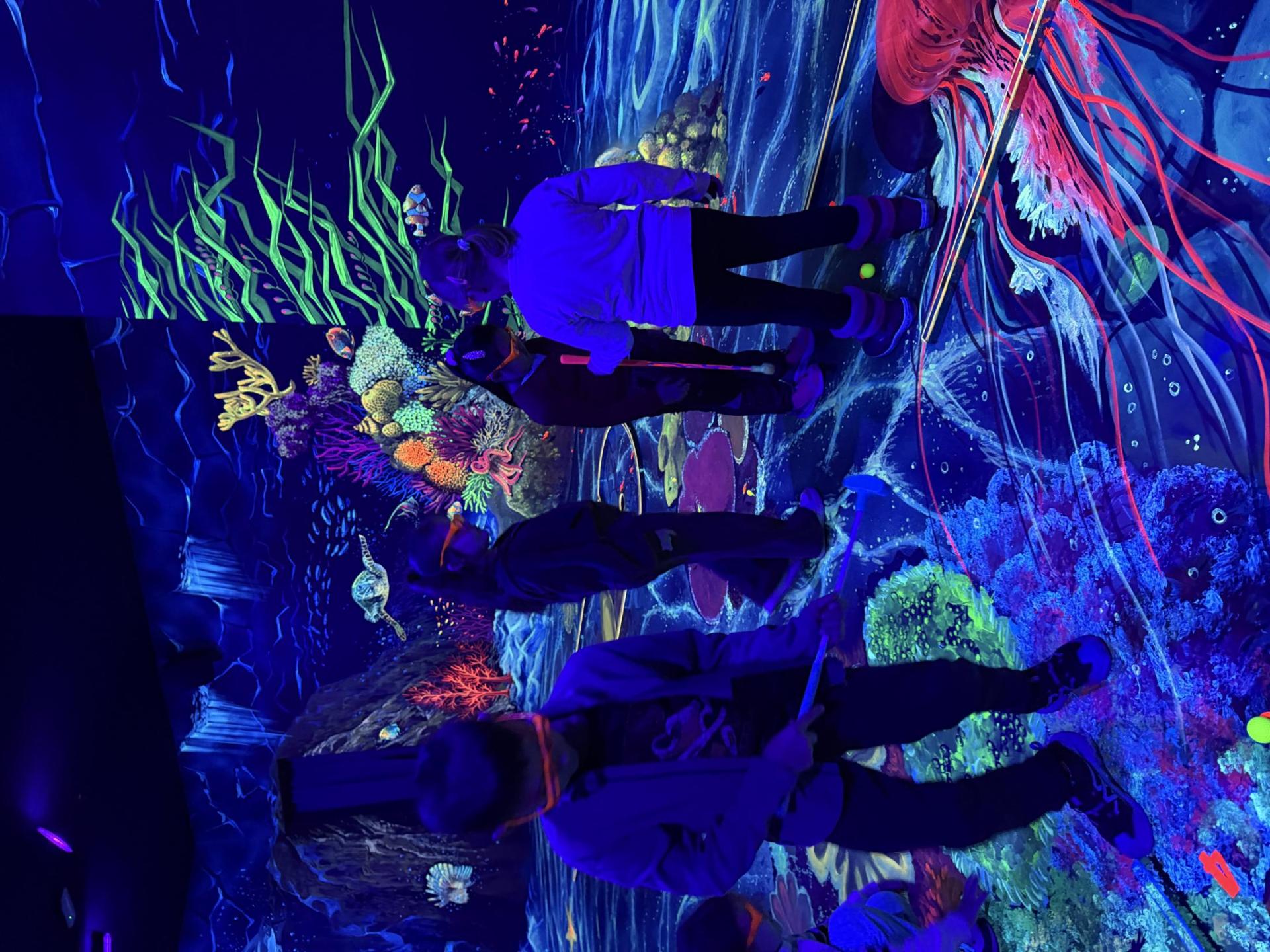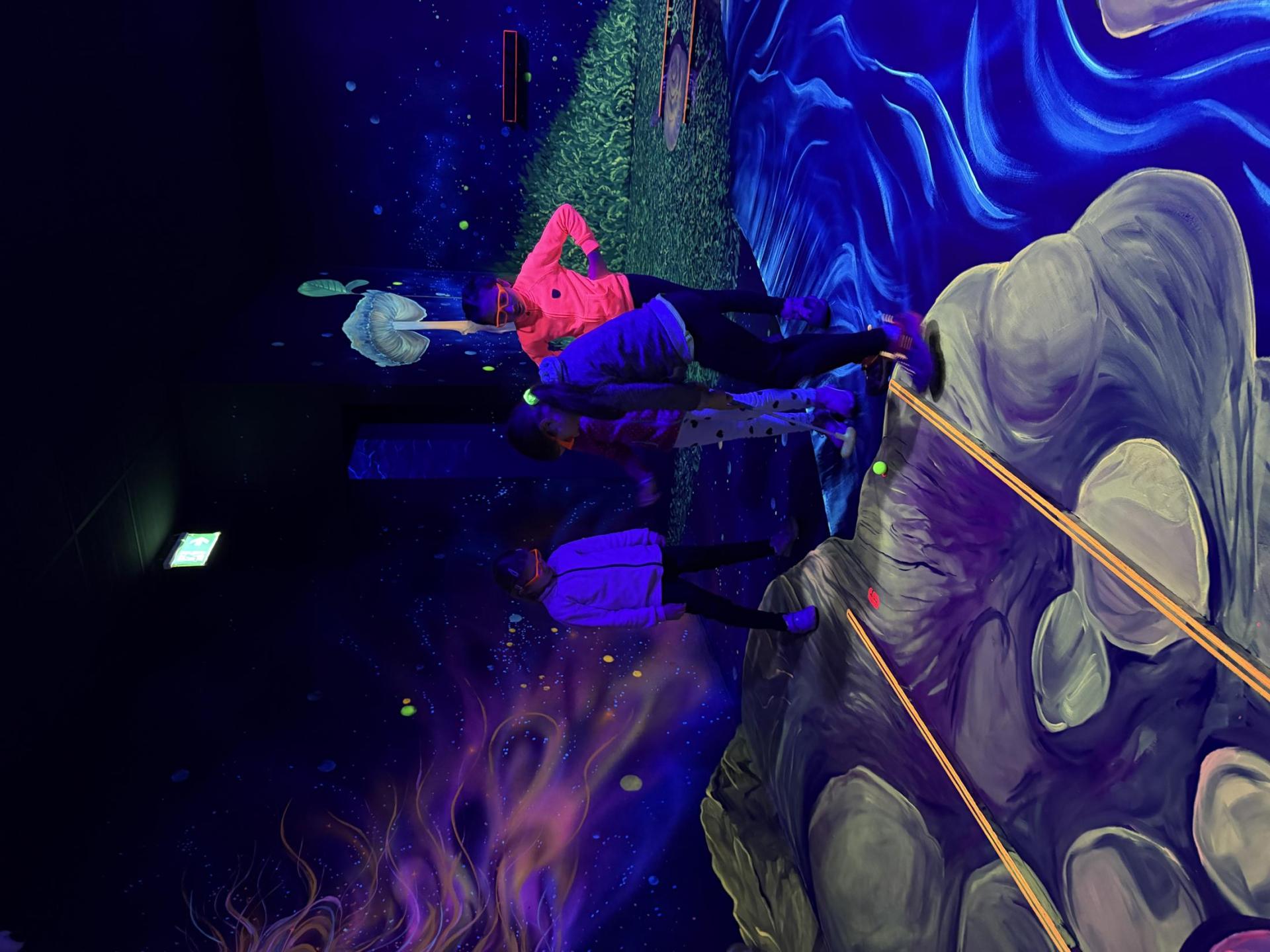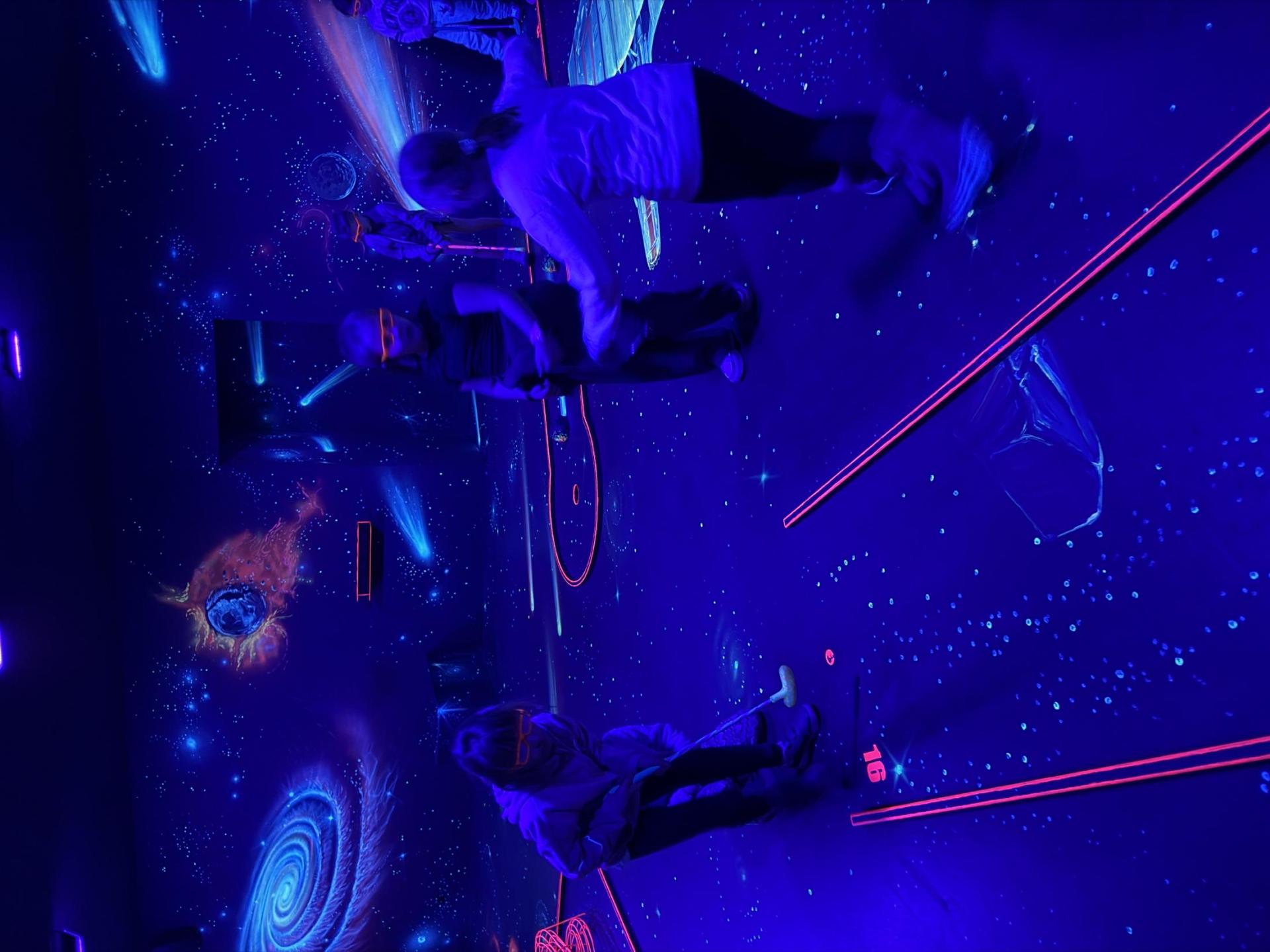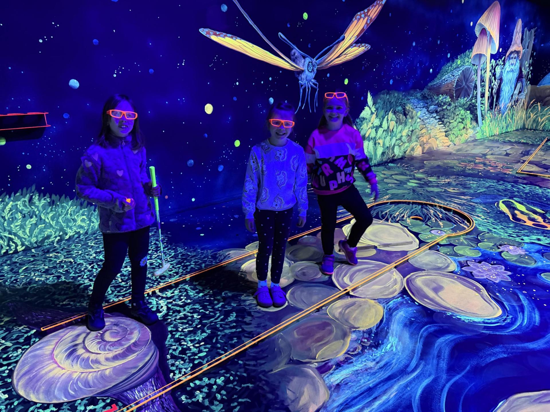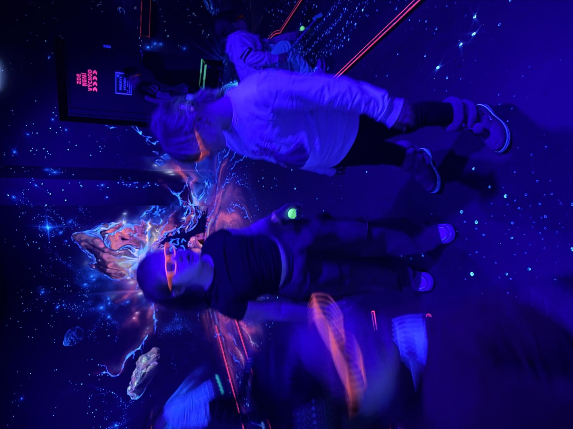 Vydali jsme se vlakem, projeli okružní jízdu Hradcem až jsme dorazili na 3D Black Light Minigolf.