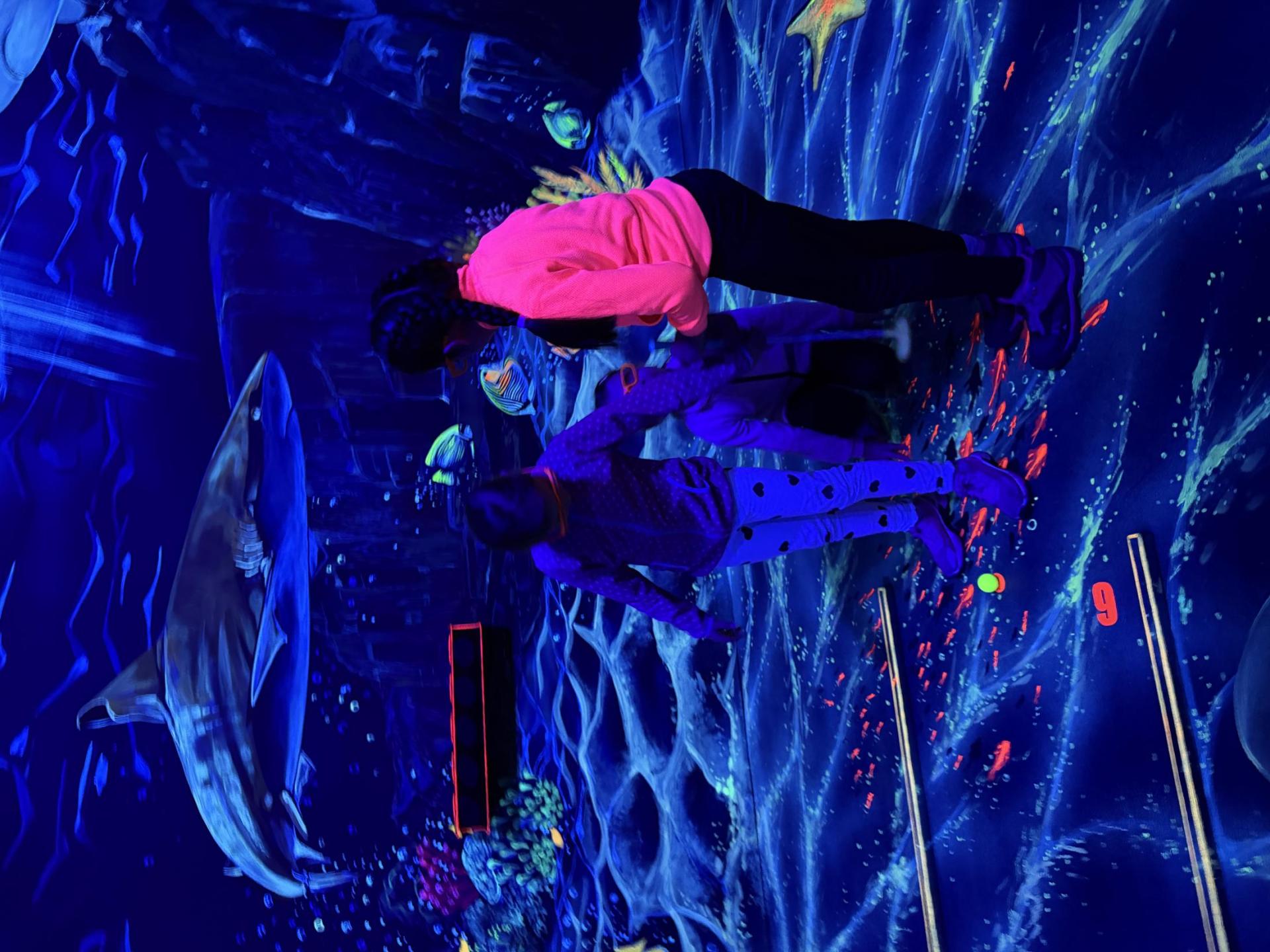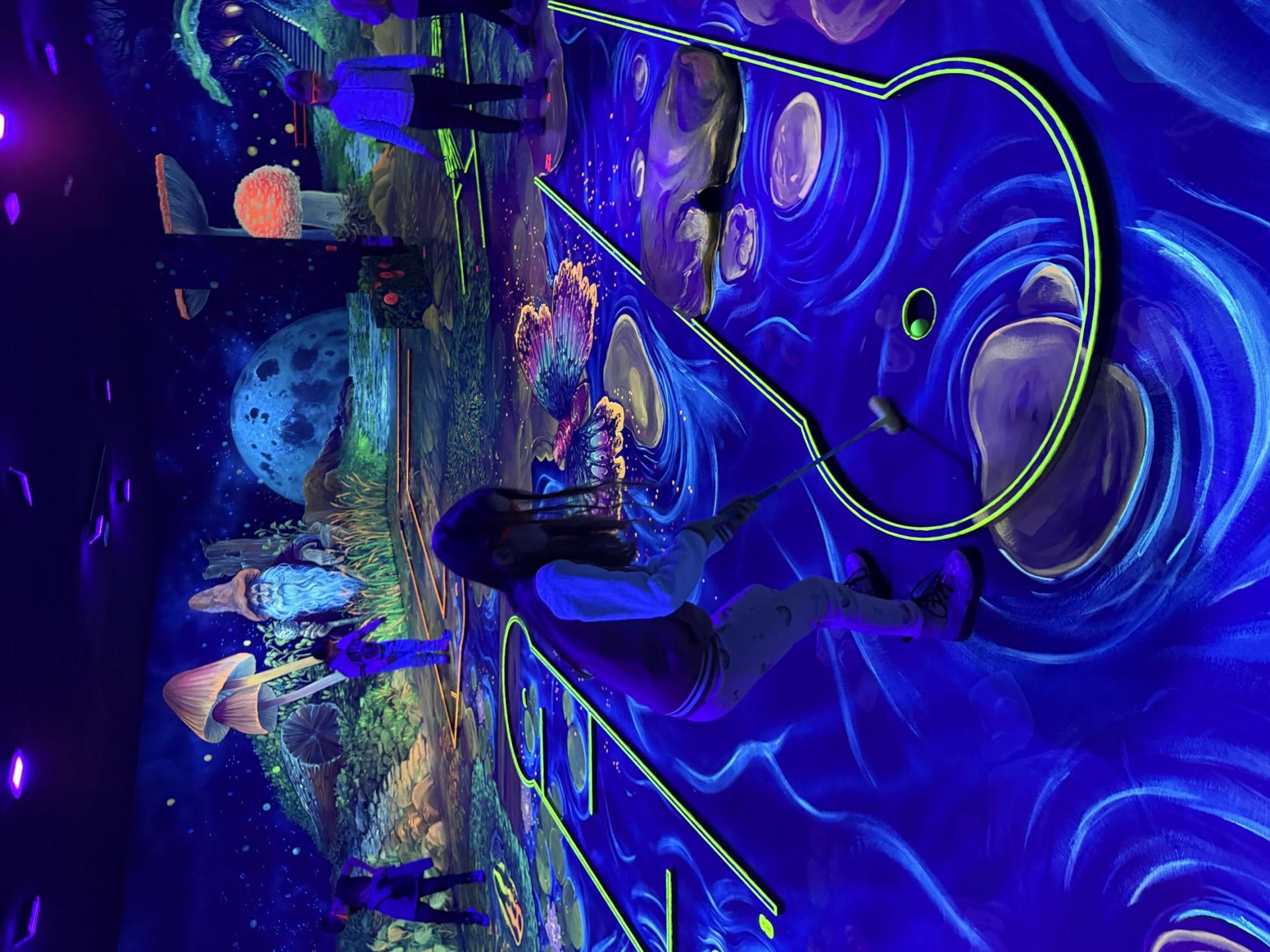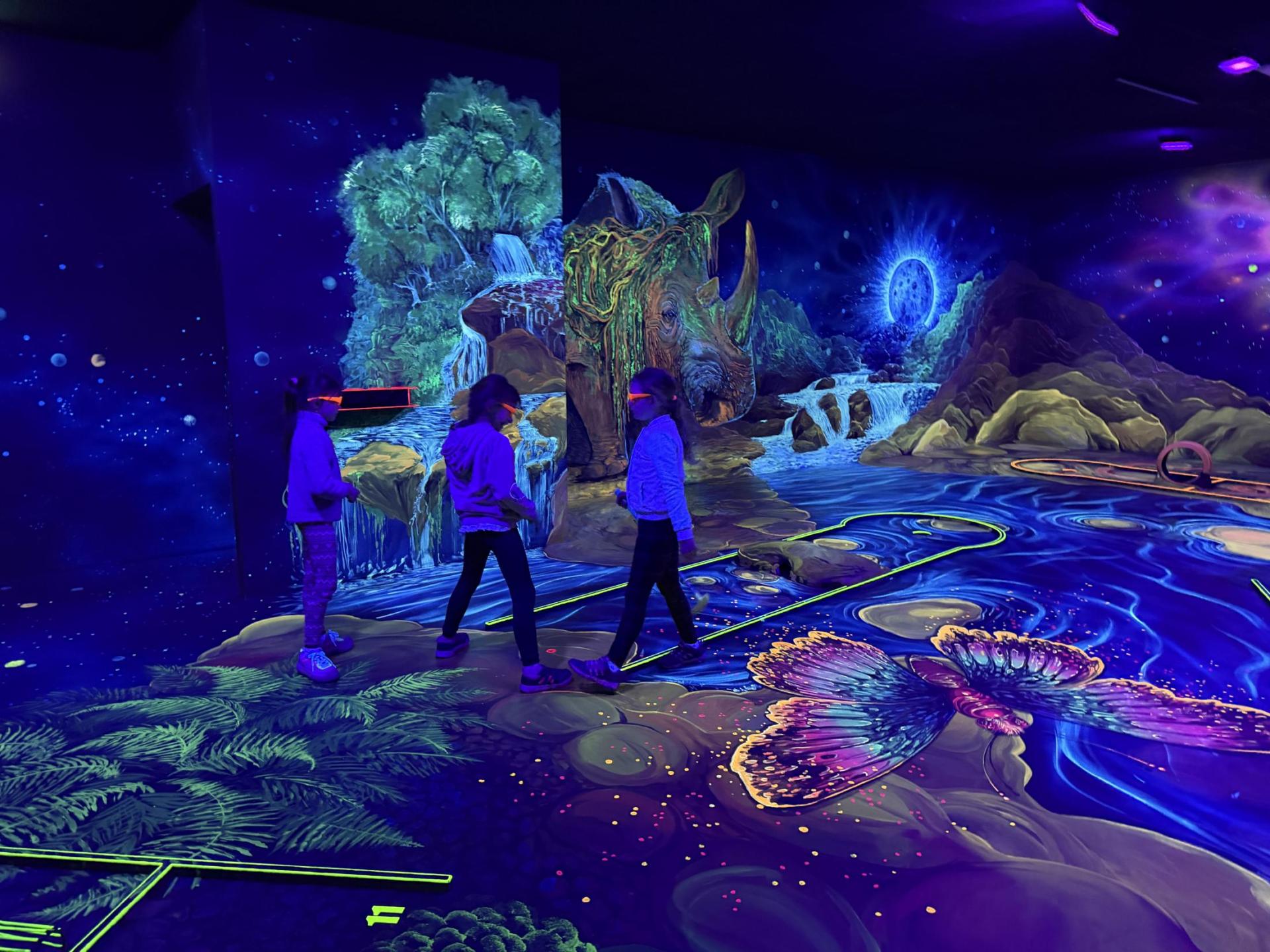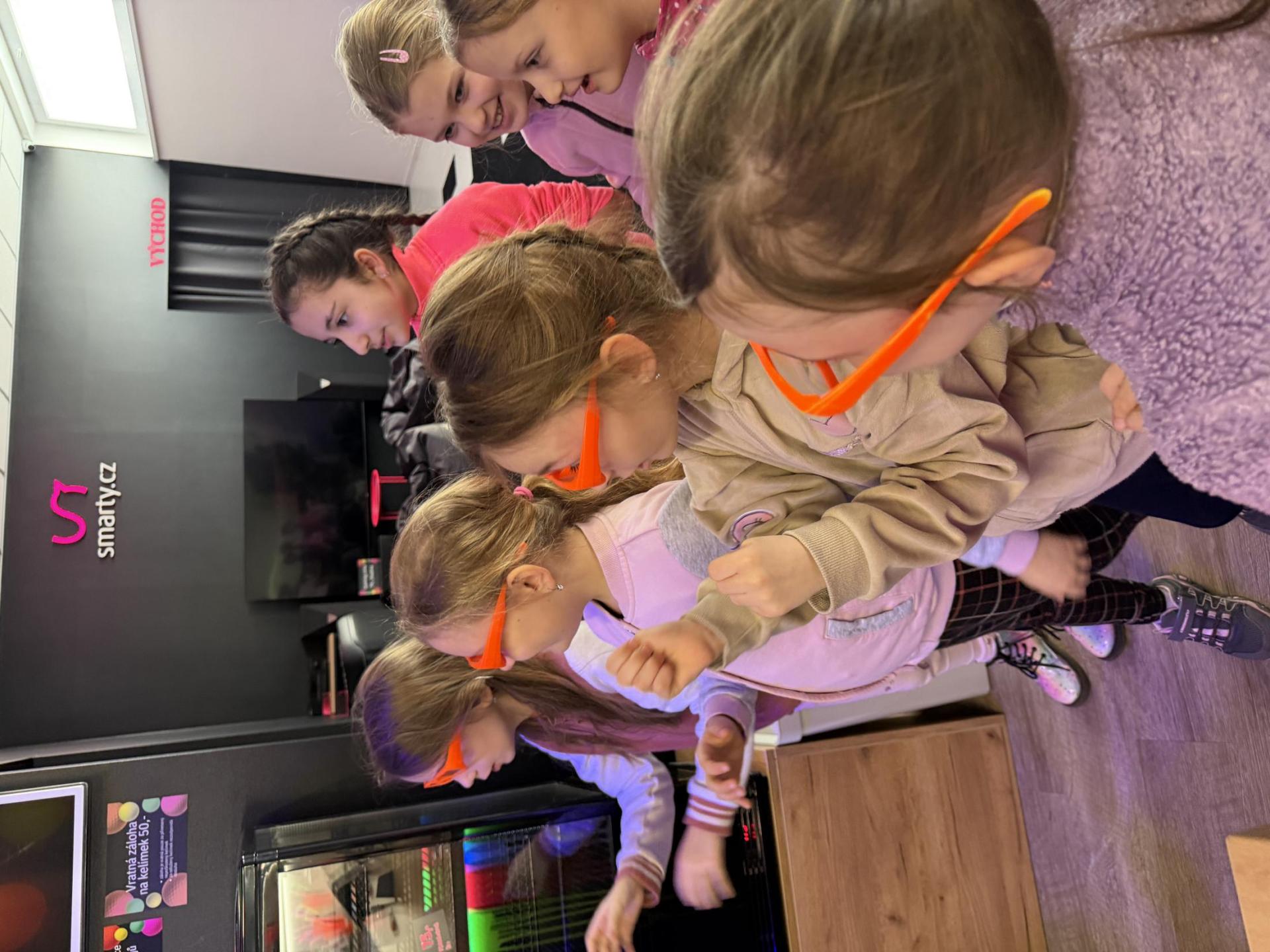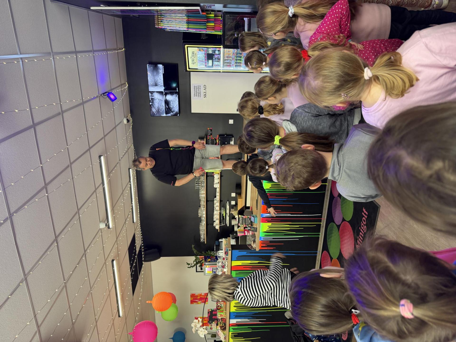 Vydali jsme se vlakem, projeli okružní jízdu Hradcem až jsme dorazili na 3D Black Light Minigolf.