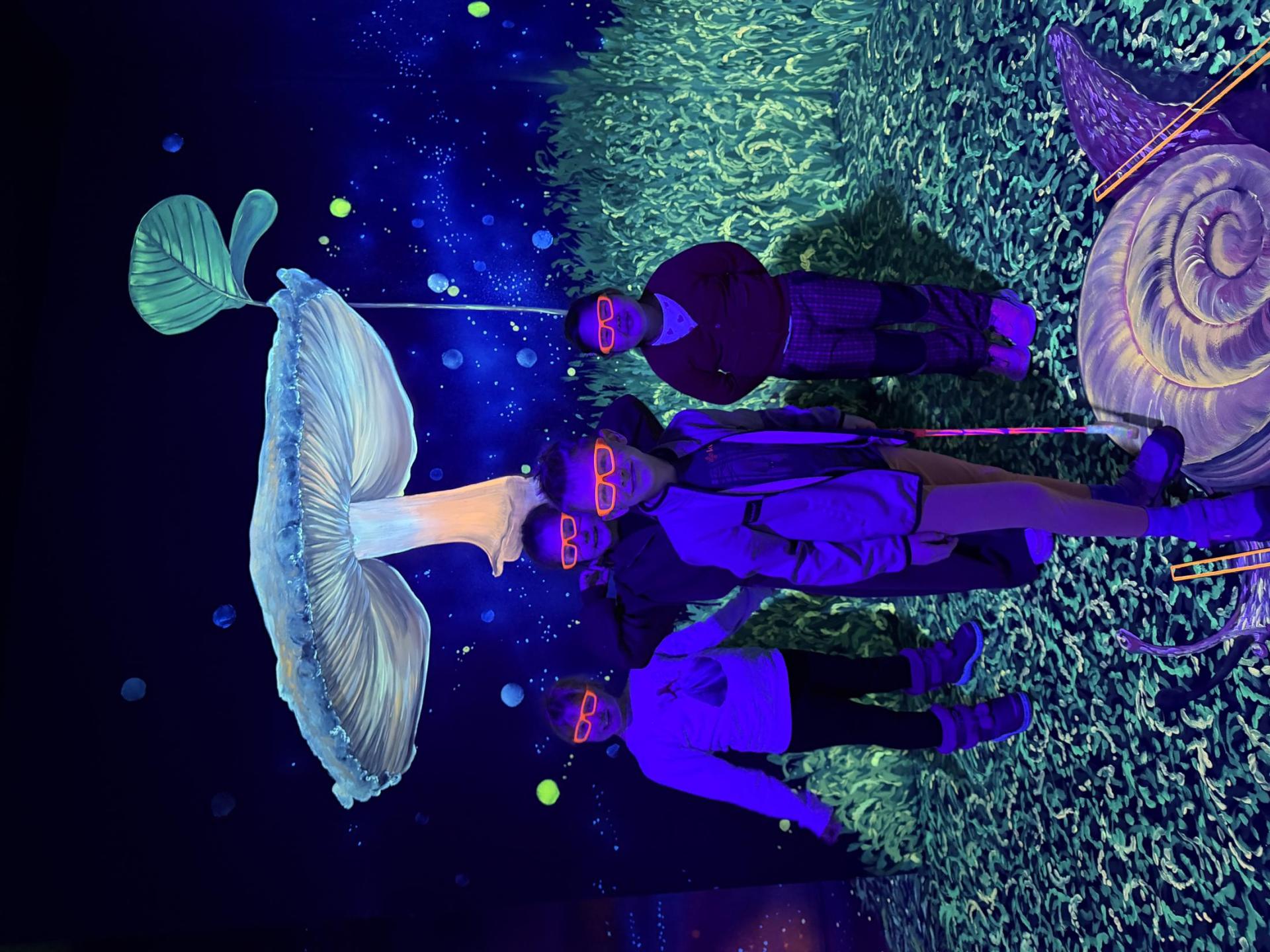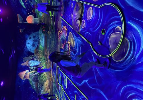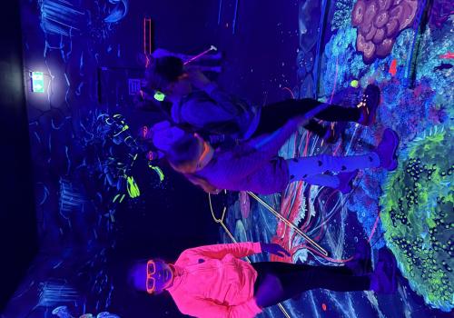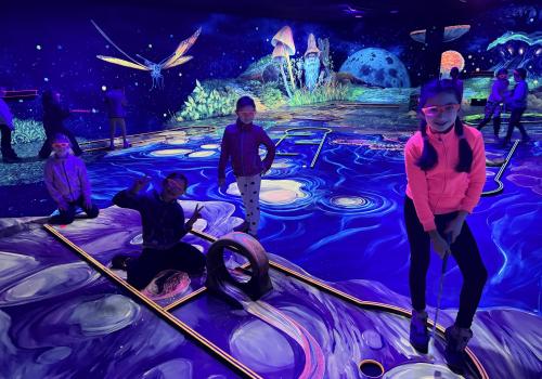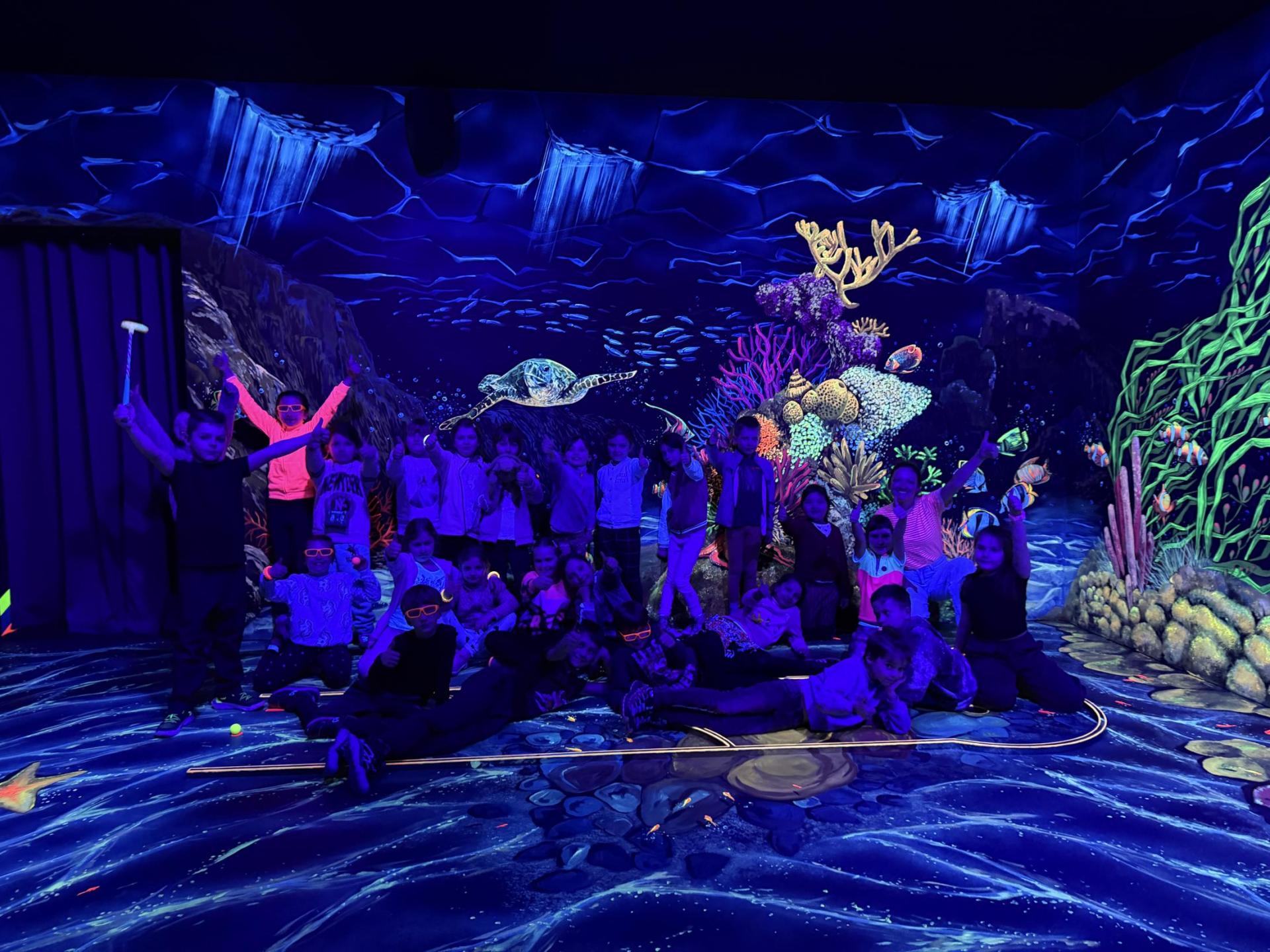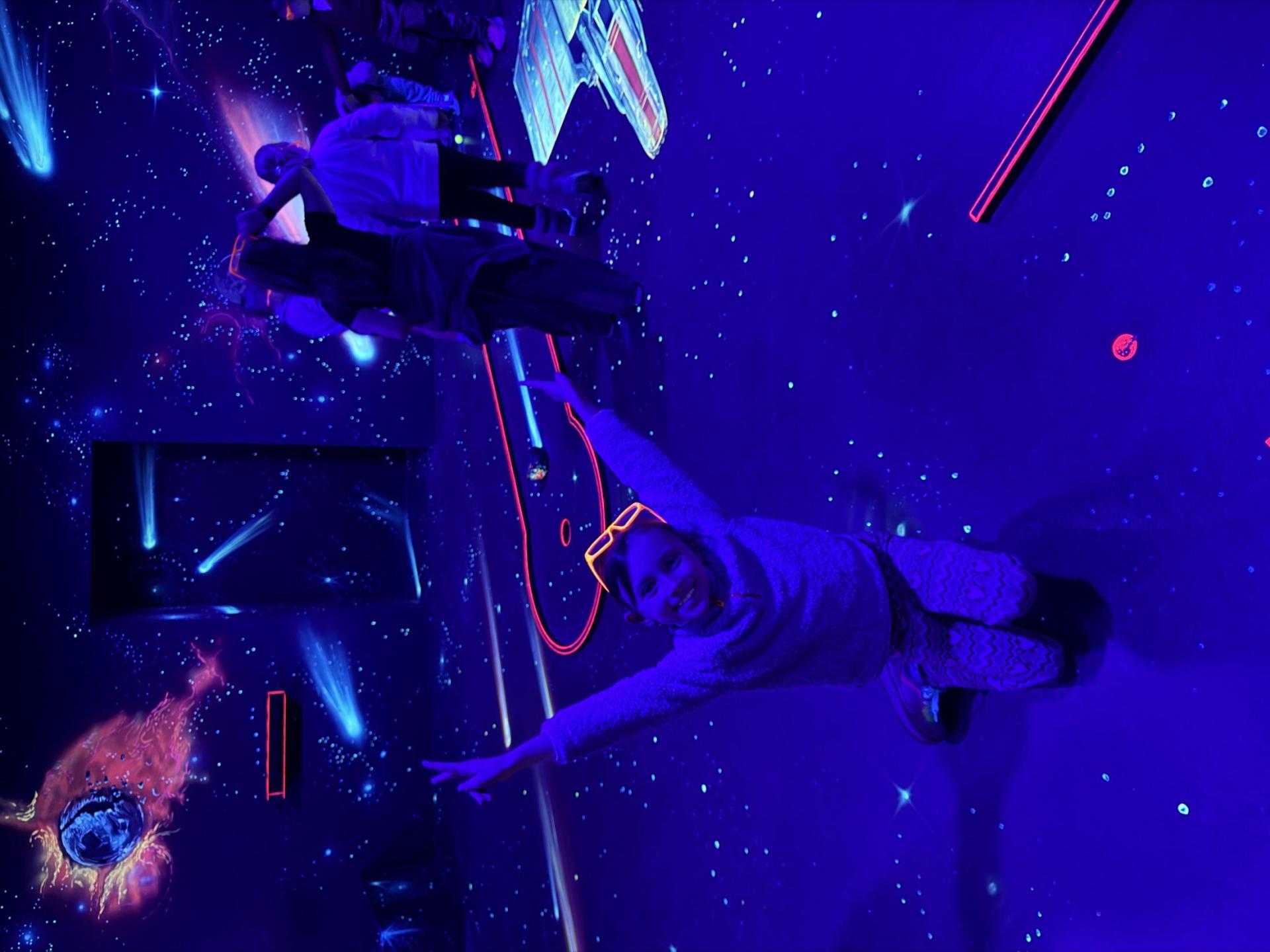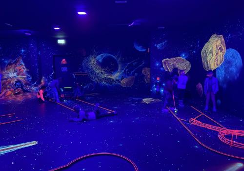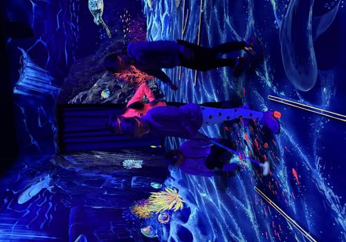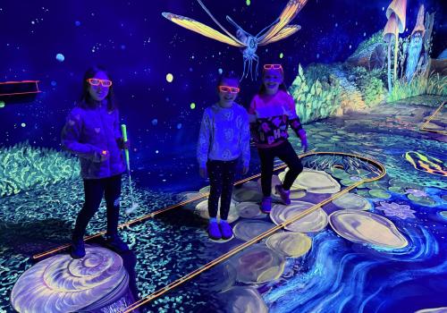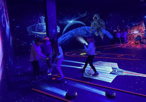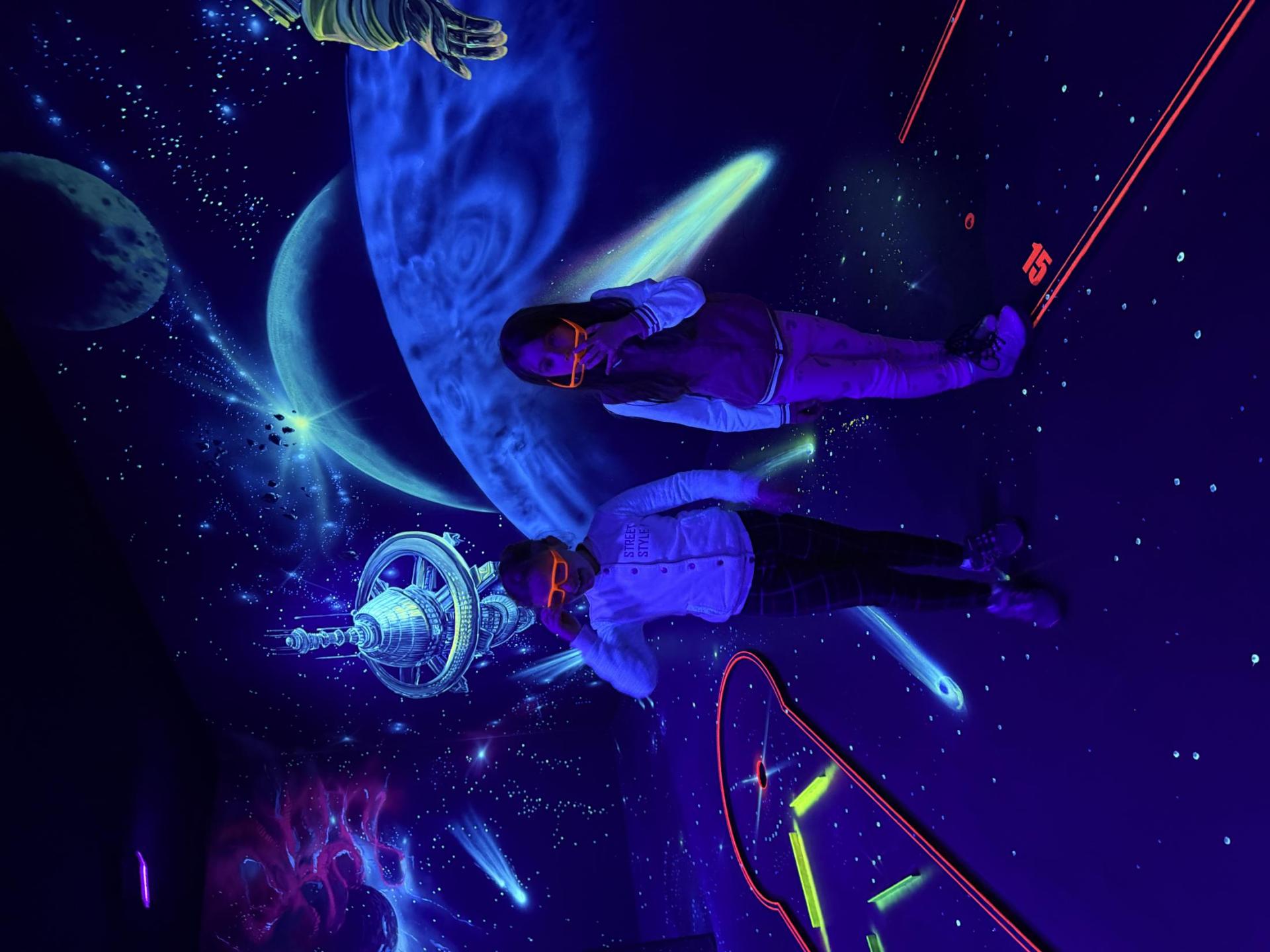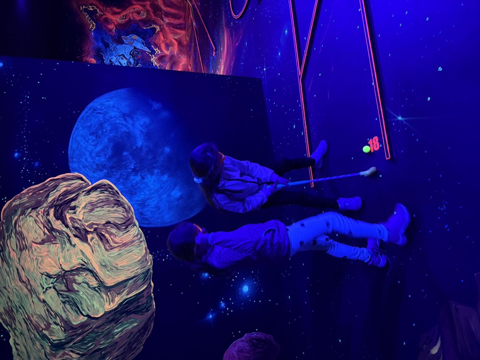 Vydali jsme se vlakem, projeli okružní jízdu Hradcem až jsme dorazili na 3D Black Light Minigolf.