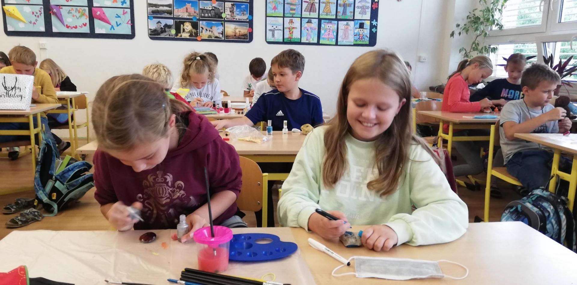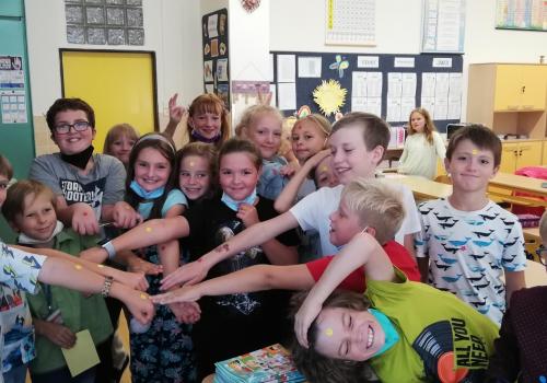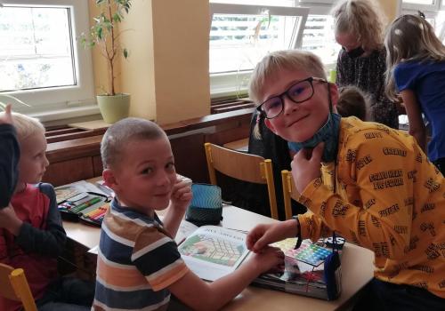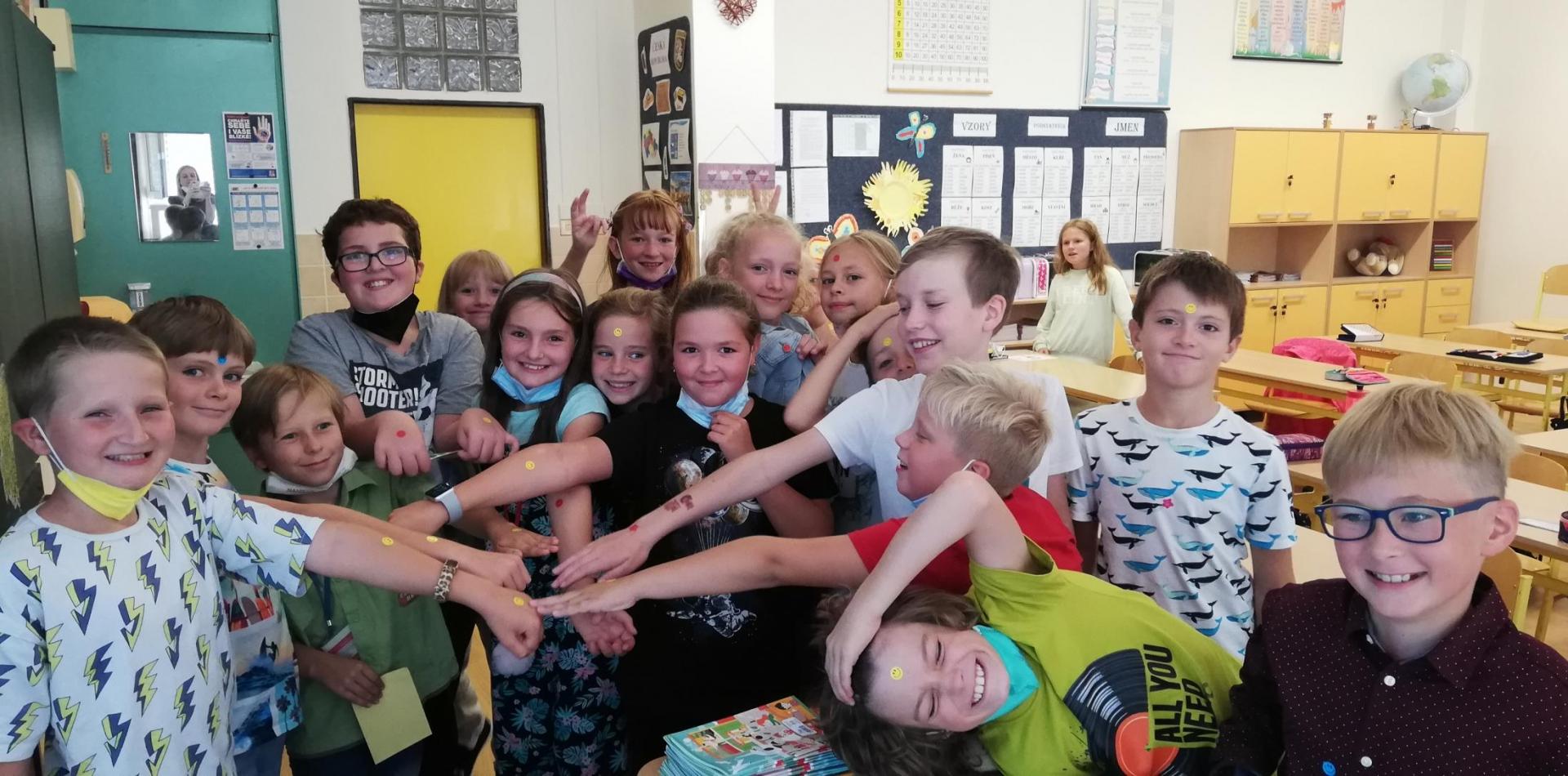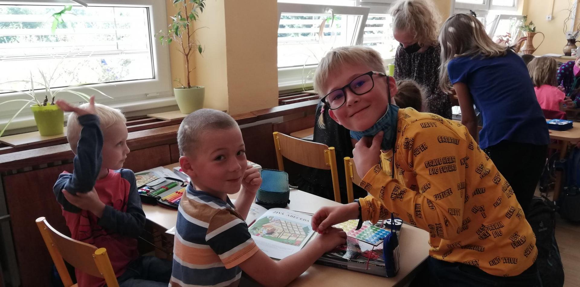 Hned první měsíc ve škole jsme se do toho pořádně pustili a kromě opakování pravopisu, počítání,... jsme také plnili výzvu - přetahování, malování kamínků, rozdávání smajlíků, čtení prvňáčkům, vymýšlení komiksu.