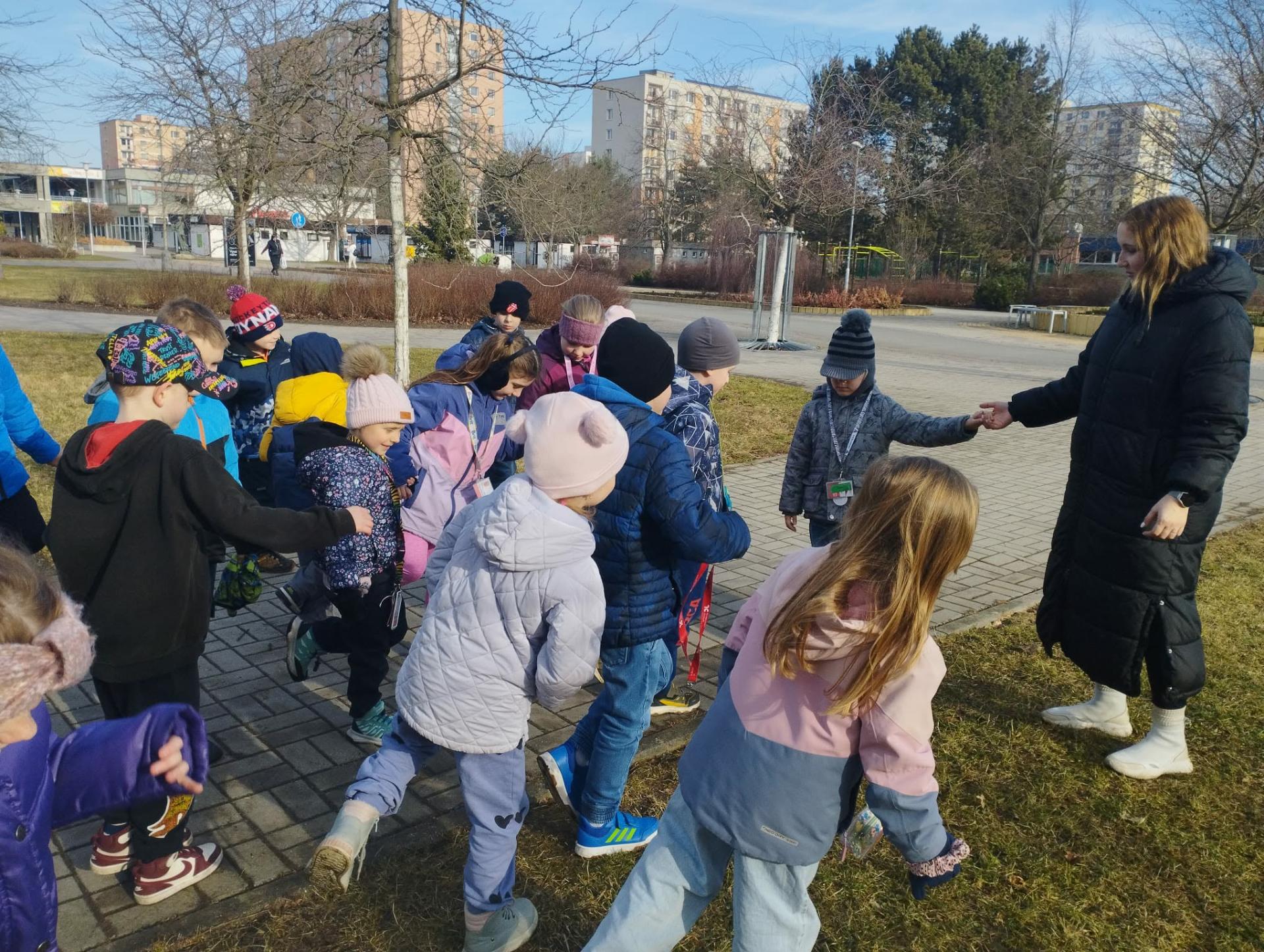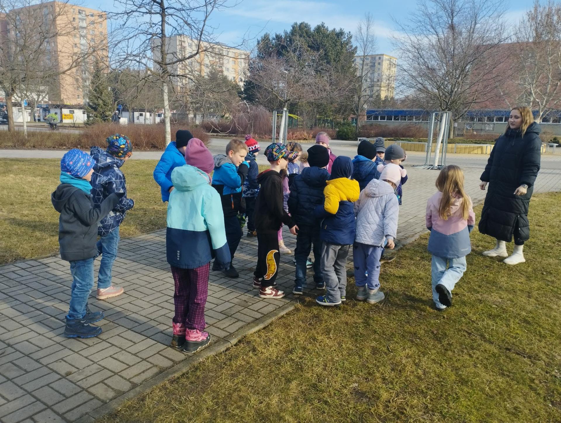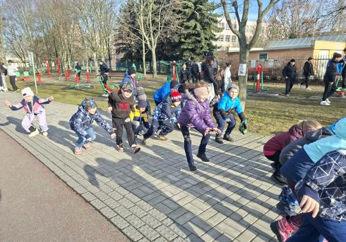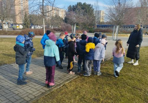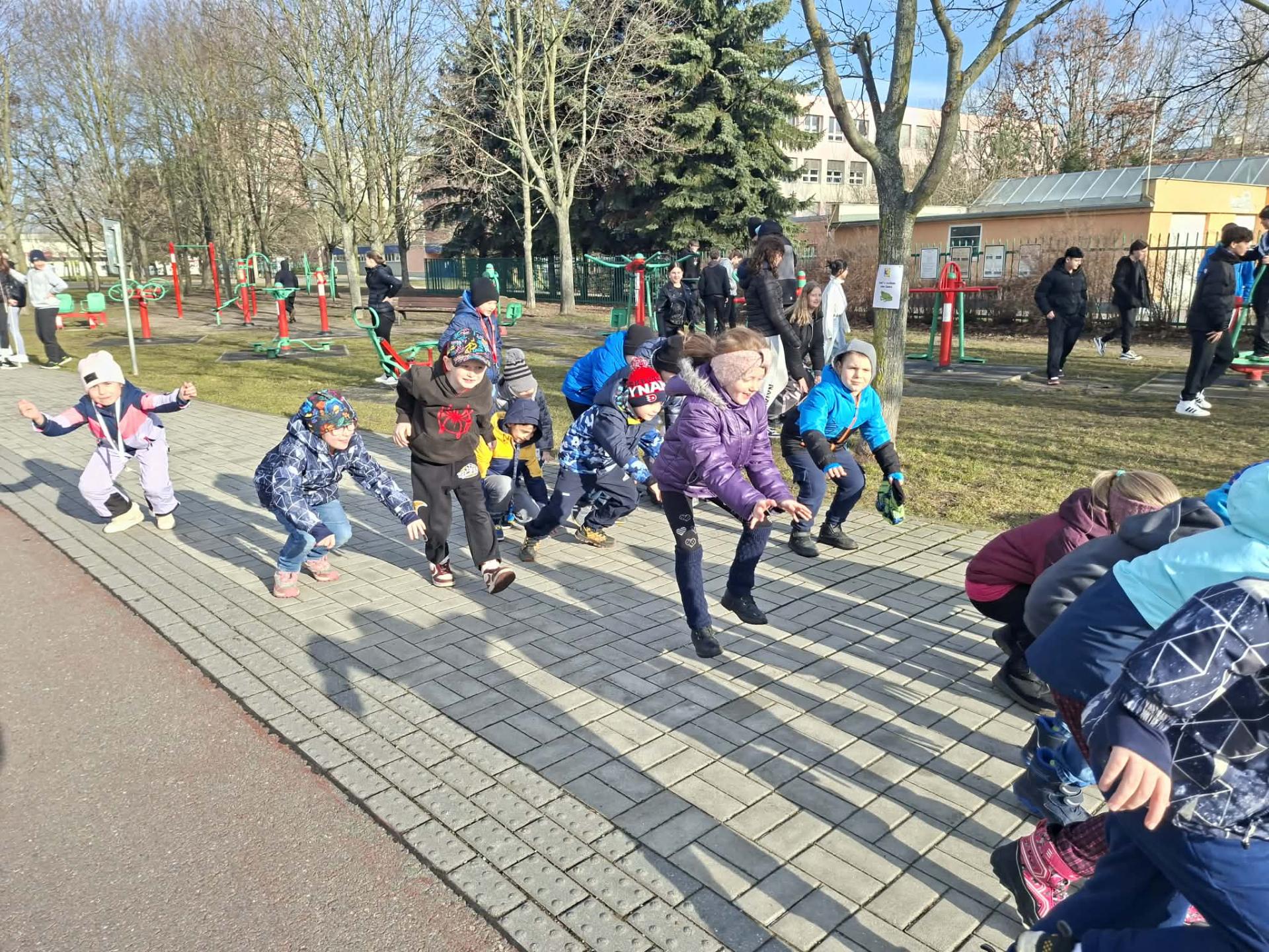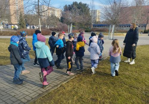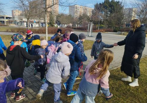 Následovala procházka, která ale nebyla jen obyčejnou cestou. Po trase na děti čekaly pohybové úkoly – skákání, běh, dřepy i jednoduché otázky. Děti si tak vyzkoušely, že pohyb může být zábavný a že zdravý životní styl není jen o jídle, ale také o pravidelném cvičení a pobytu venku. Procházku jsme zakončili na hřišti, kde jsme si společně zaběhali a užili si radost z pohybu.