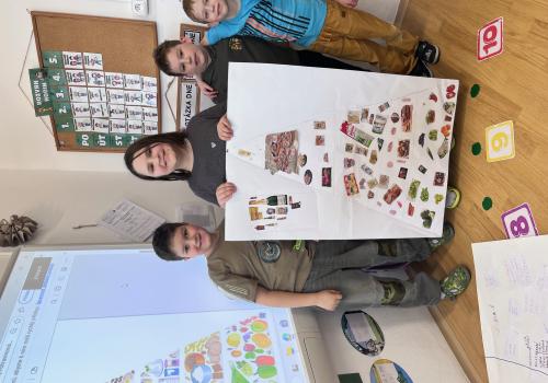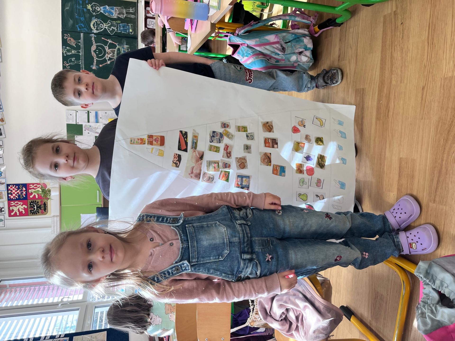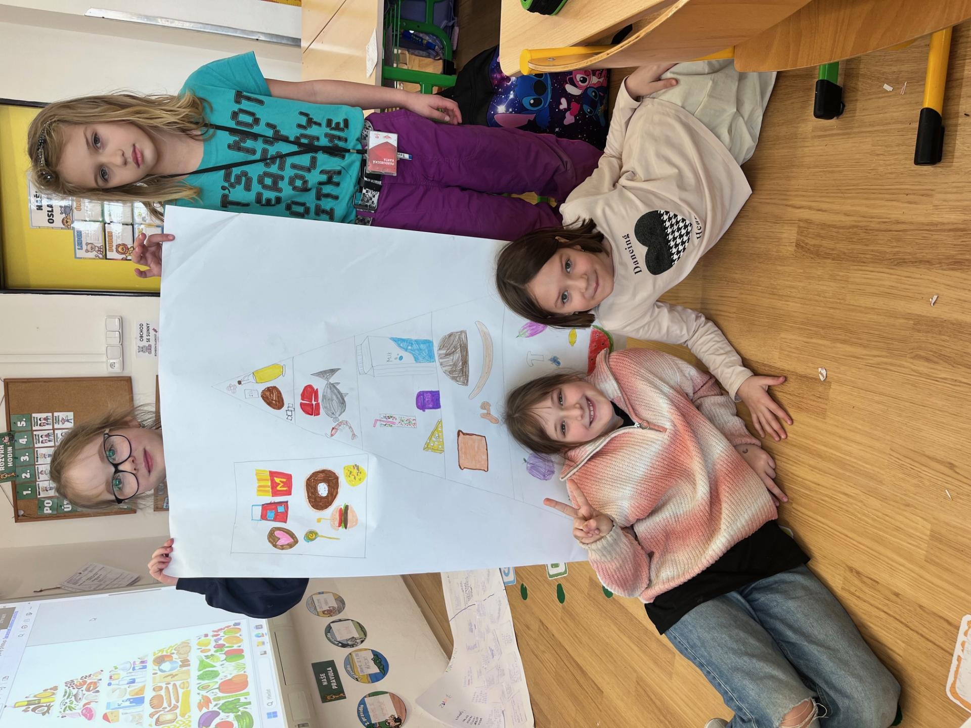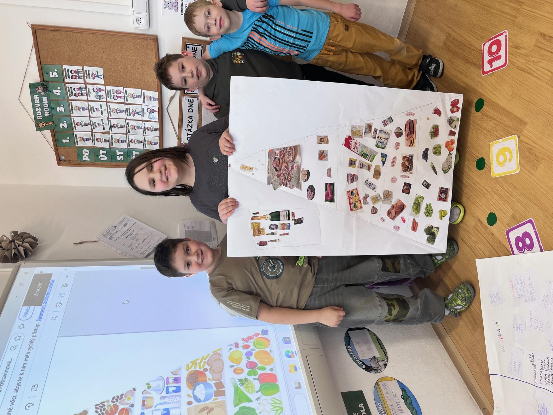 Nejprve jsme se inspirovali zdravými svačinkami a povídali si o tom, co našemu tělu prospívá. V TV jsme si dali pořádně do těla, uběhli jsme několik kilometrů a všichni si zaslouží velkou pochvalu za snahu a vytrvalost. Navíc jsme díky tomu získali další body do našeho virtuálního běhu. Ve skupinách pak děti tvořily výživovou pyramidu. Spolupracovaly a výsledné práce se všem moc povedly.